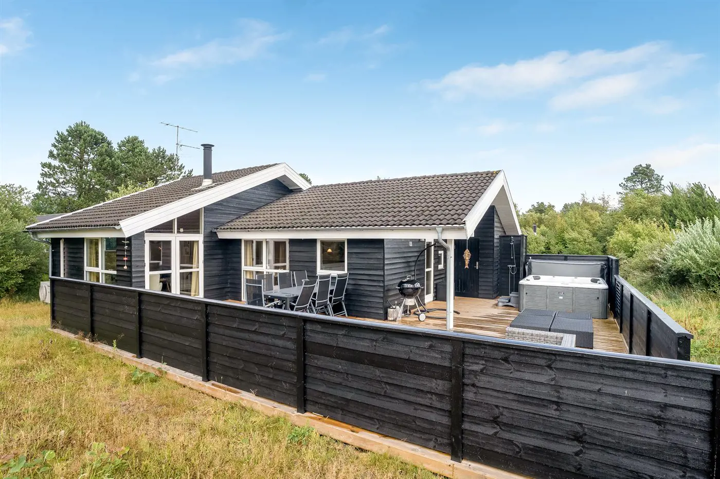 Die Ferienunterkunft liegt auf einem 837 m² großen Naturgrundstück. Die Entfernung zum Meer beträgt 1900 m. Die nächste Einkaufsmöglichkeit liegt 2500 m entfernt. Es steht ein offenes Terrassenareal zur Verfügung. Außerdem gibt es überdachte Terrasse. Außendusche. Es steht ein Grill zur Verfügung. Es ist ein Ladestecker für Elektroautos installiert. Parkplatz auf dem Grundstück.