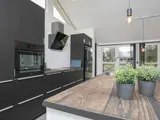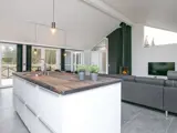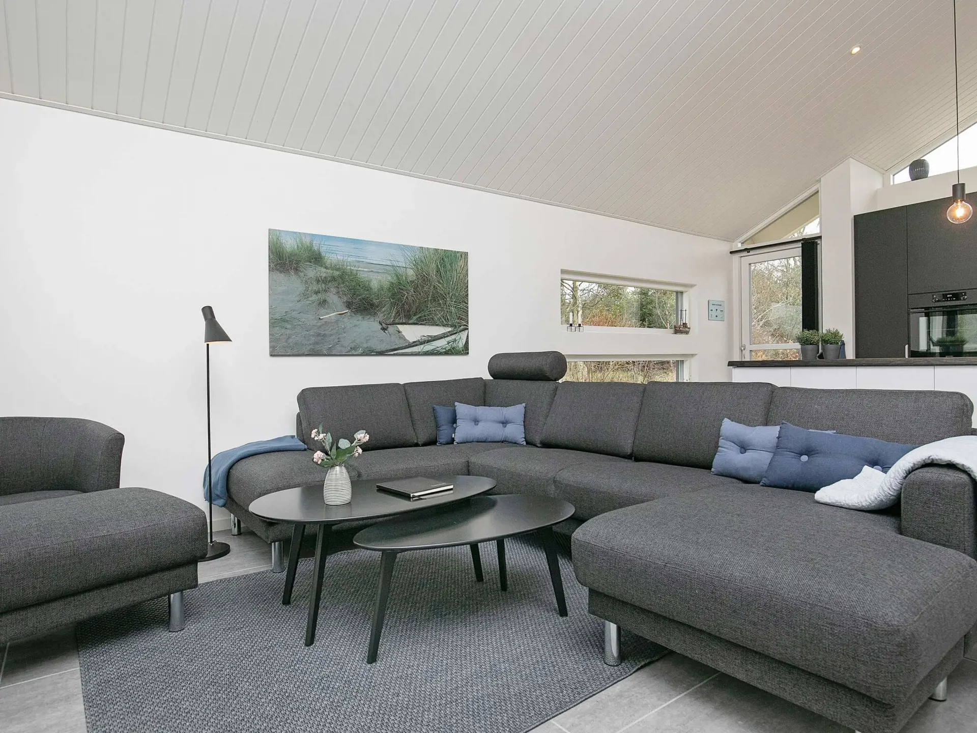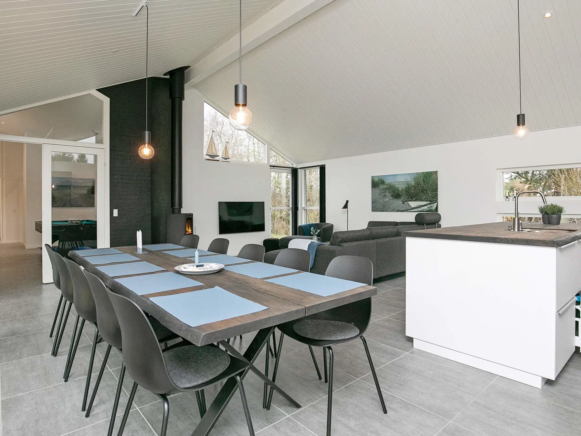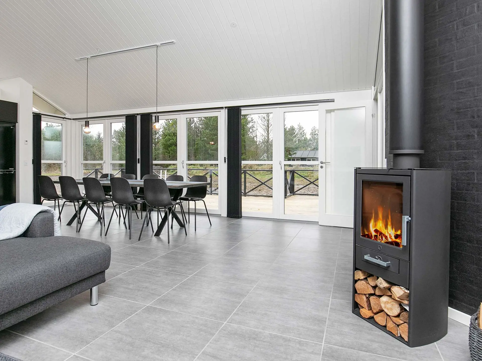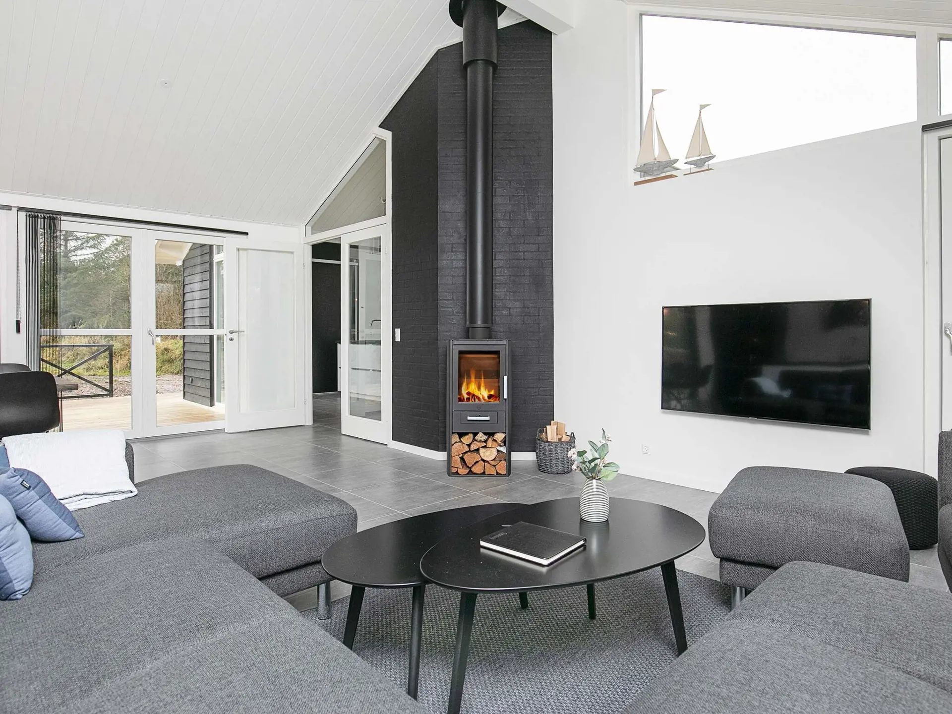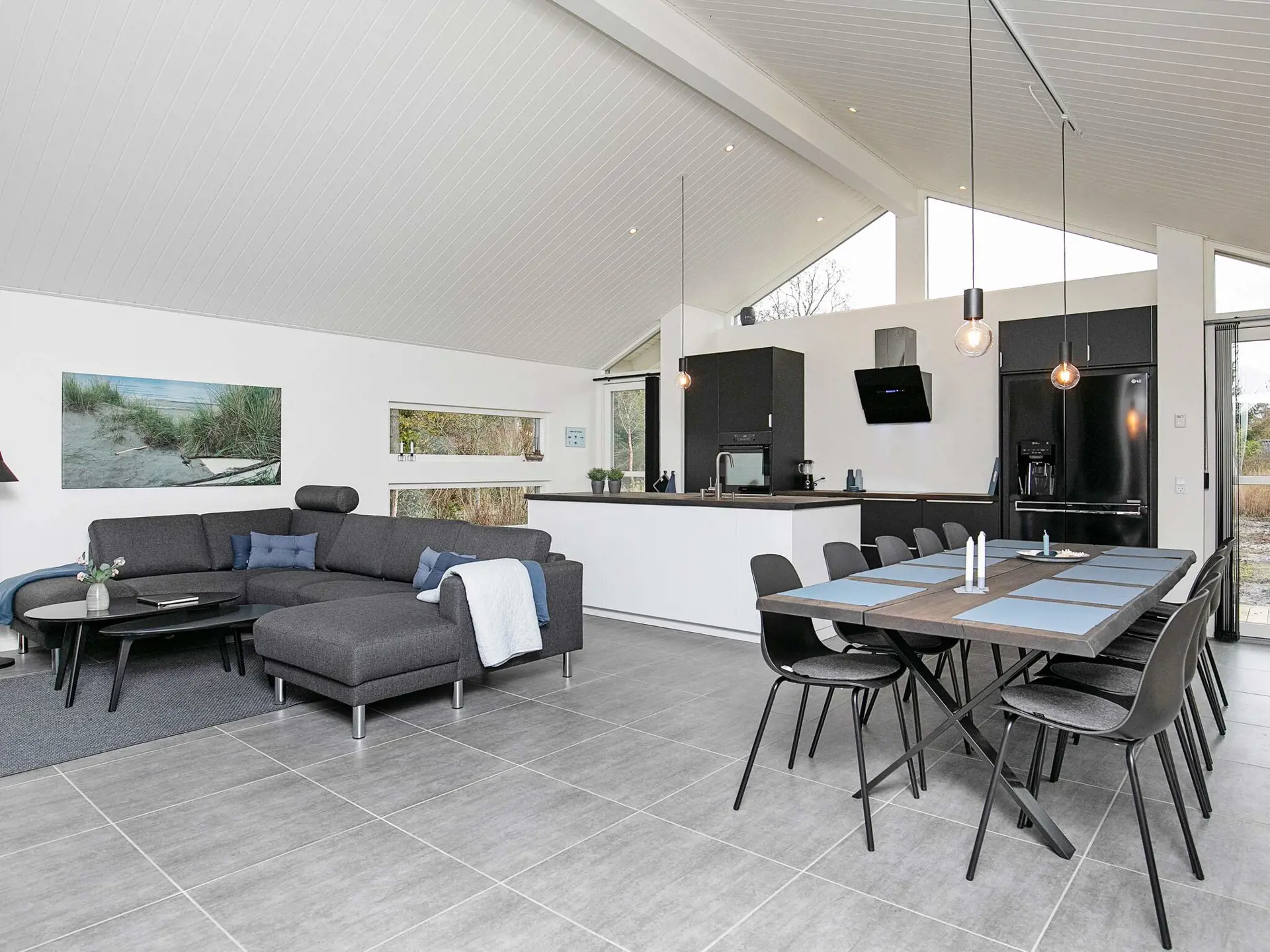 Den Mittelpunkt des Ferienhauses bildet der offene Küchen-/Wohnbereich, inklusive Holzofen und viel Platz für die ganze Familie und für gemeinsame Aktivitäten wie Kochen, Spiele spielen oder Filme gucken. Im Wohnbereich stehen im TV auch einige deutsche Sender zur Auswahl, zudem gibt es hier Bluetooth-Lautsprecher. Der Raum verfügt über mehrere Fenster, durch die das faszinierende Licht Nordjütlands einfällt. An heißen Tagen können diese zur Terrasse hin weit geöffnet werden.