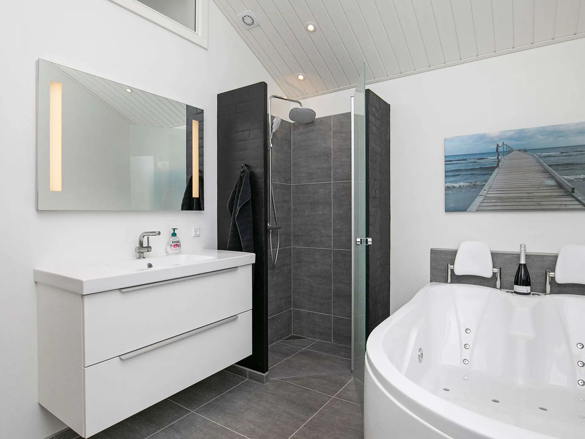 Es gibt drei große, helle Schlafzimmer im Haus, mit jeweils zwei bequemen Schlafplätzen und Stauraum. Zudem offener Hems oben unter der Dachschräge, mit Treppe, vier Matratzen und Fernseher für die Kinder. Im Haus auch offener Eingangbereich mit kombiniertem Waschtrockner. Außerdem zwei moderne Badezimmer mit Dusche und angenehmer Fußbodenheizung, eines davon zusäztlich mit Whirlpool für entspannende Momente.