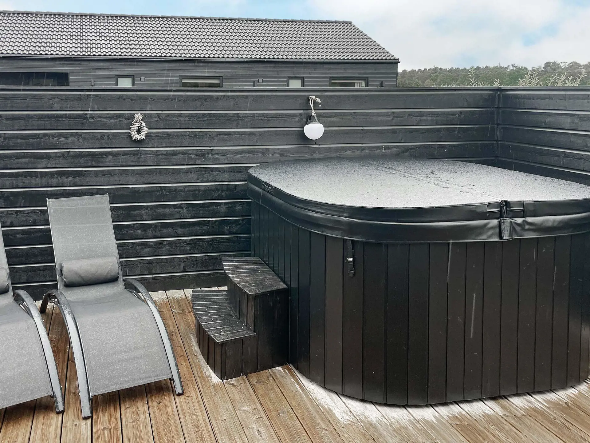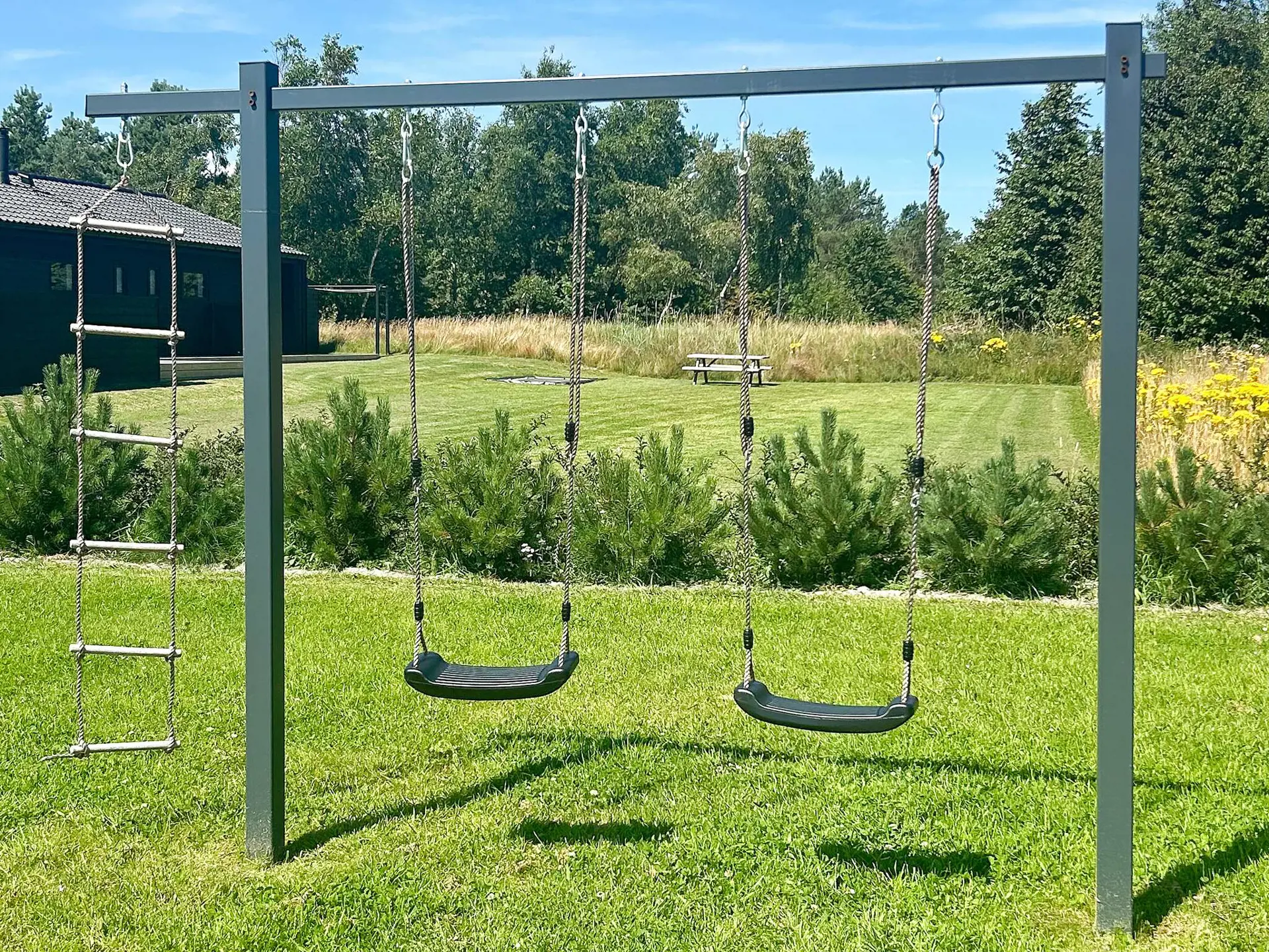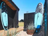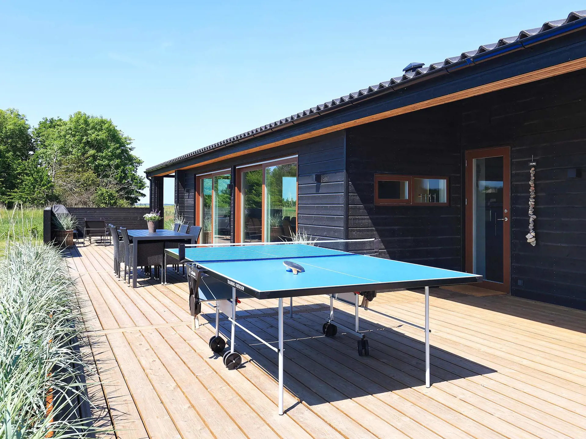 Im Außenbereich findet man teilweise überdachte Terrassenflächen sowie eine Terrassenheizung im überdachten Teil. Es gibt guten Windschutz, Schatten oder Sonne, je nach Vorliebe. Ein Gasgrill (inkl. Gasverbrauch) steht zur Verfügung. Auf der Rasenfläche gibt es viel Platz zum Spielen und ein Trampolin (Nutzung nur auf eigenes Risiko). Außerdem stehen für Spiel und Spaß Tischtennis, Volleyballnetz, Spielekonsole sowie Padelboards zum Ausleihen zur Verfügung.