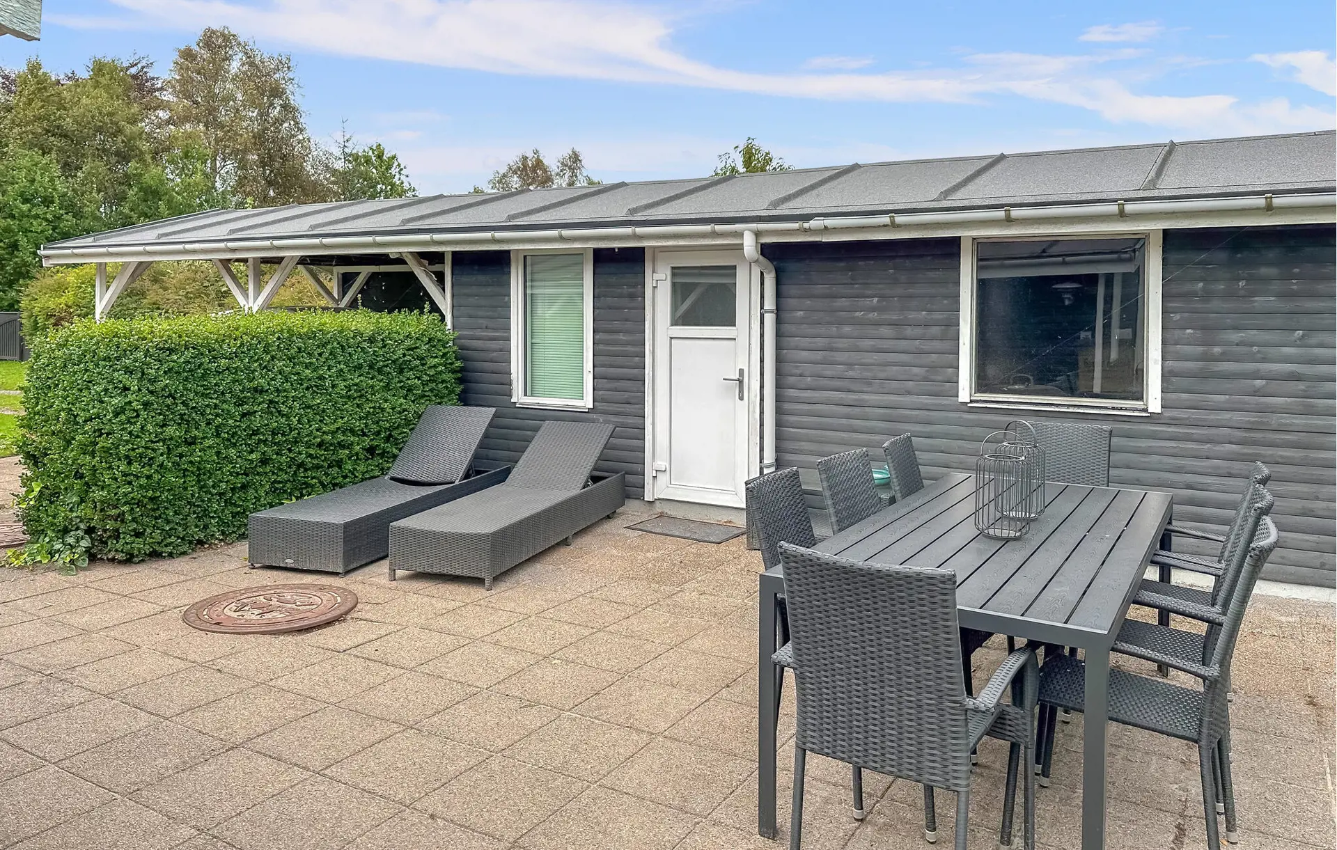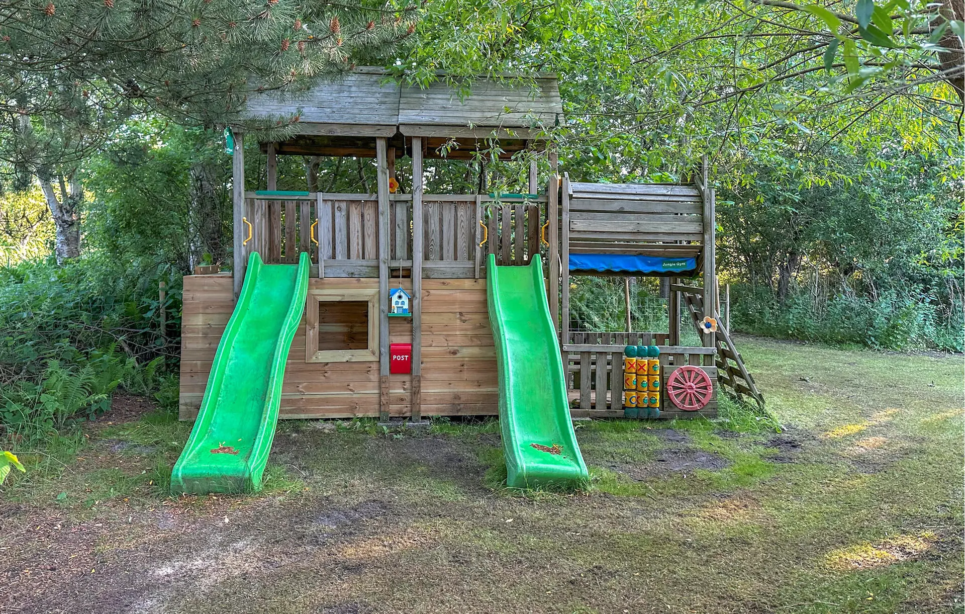 Verbringen Sie schöne Momente im Außenbereich. Setzen Sie sich auf die Terrasse und genießen Sie Ihr Frühstück an der frischen Luft. Entspannen Sie auf den Sonnenliegen oder nutzen Sie die überdachte Sitzecke mit langen Holzbänken für gesellige Abende. Kindern steht ein eigener Spielplatz mit Rutsche und Kletterturm zur Verfügung, während Erwachsene im großzügigen Garten Ruhe finden.