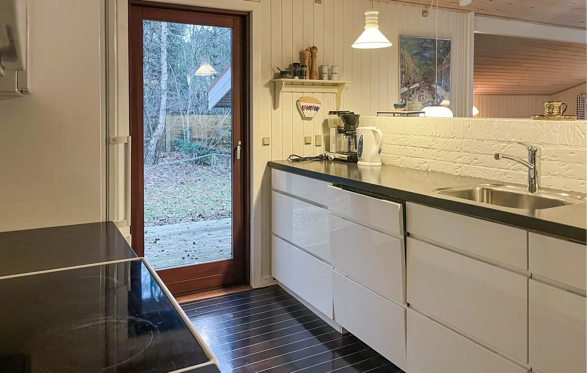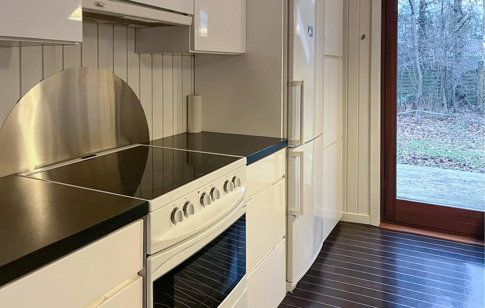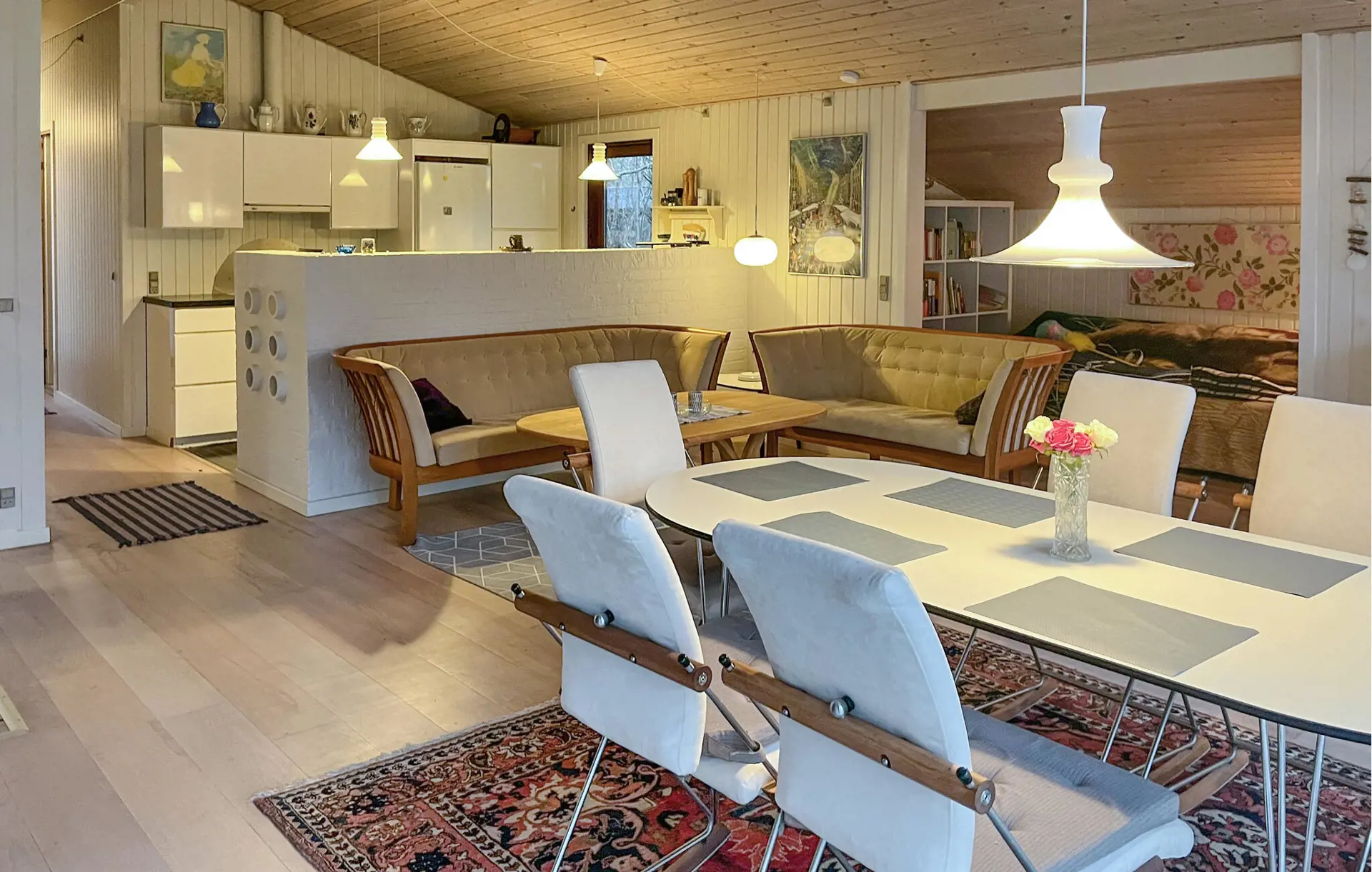 Nehmen Sie sich Zeit für eine erholsame Pause in diesem klassischen Ferienhaus, das durch seine naturnahe Lage und das einladende Holzinterieur geprägt ist. Lehnen Sie sich auf den gemütlichen Sofas zurück, während Sie lesen oder einen Film ansehen. Die holzverkleideten Flächen sorgen für eine angenehme, warme Stimmung im Raum, zu der auch der Kaminofen beiträgt. Nutzen Sie die offen gestaltete Küche, die praktisch ausgestattet ist, um gemeinsam Ihre Urlaubsmahlzeiten zuzubereiten.