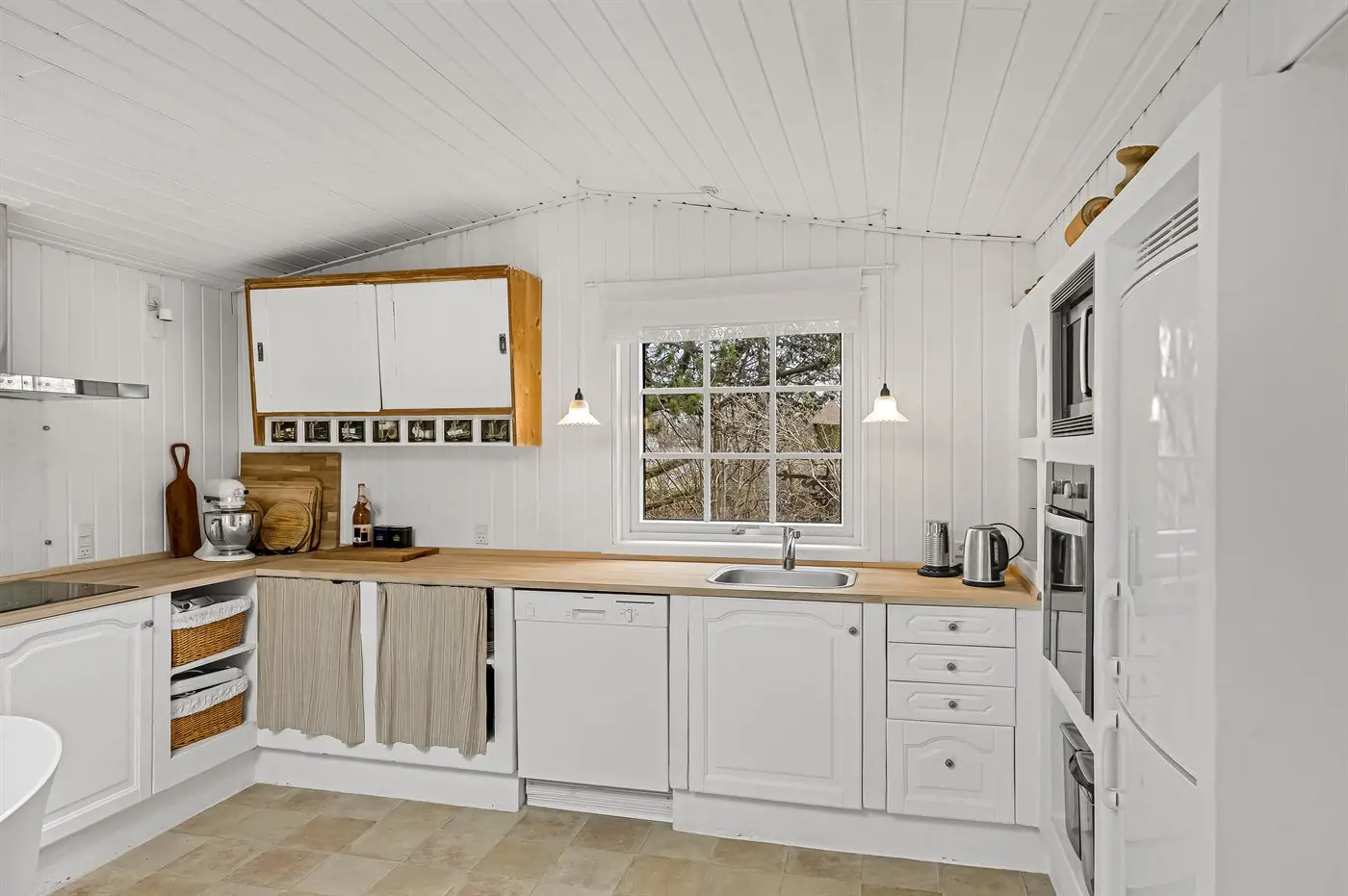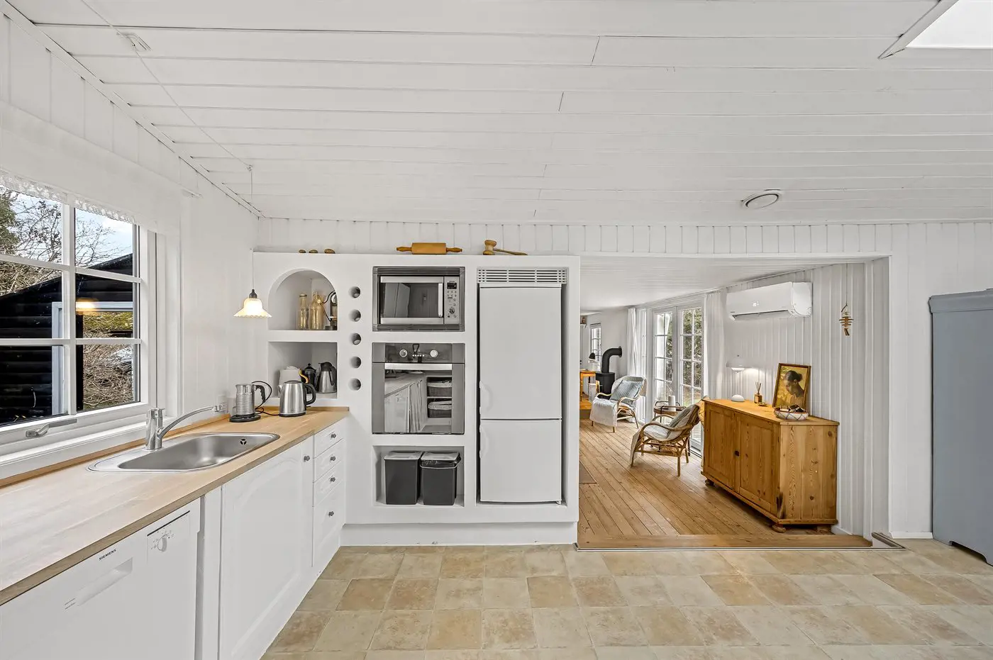 Die Küche ist mit Kühlschrank ausgestattet. Außerdem gibt es 4 Induktions-Kochzonen, Umluftofen, Mikrowelle sowie Geschirrspüler. Fußbodenheizung in der Küche.