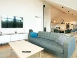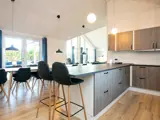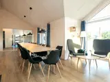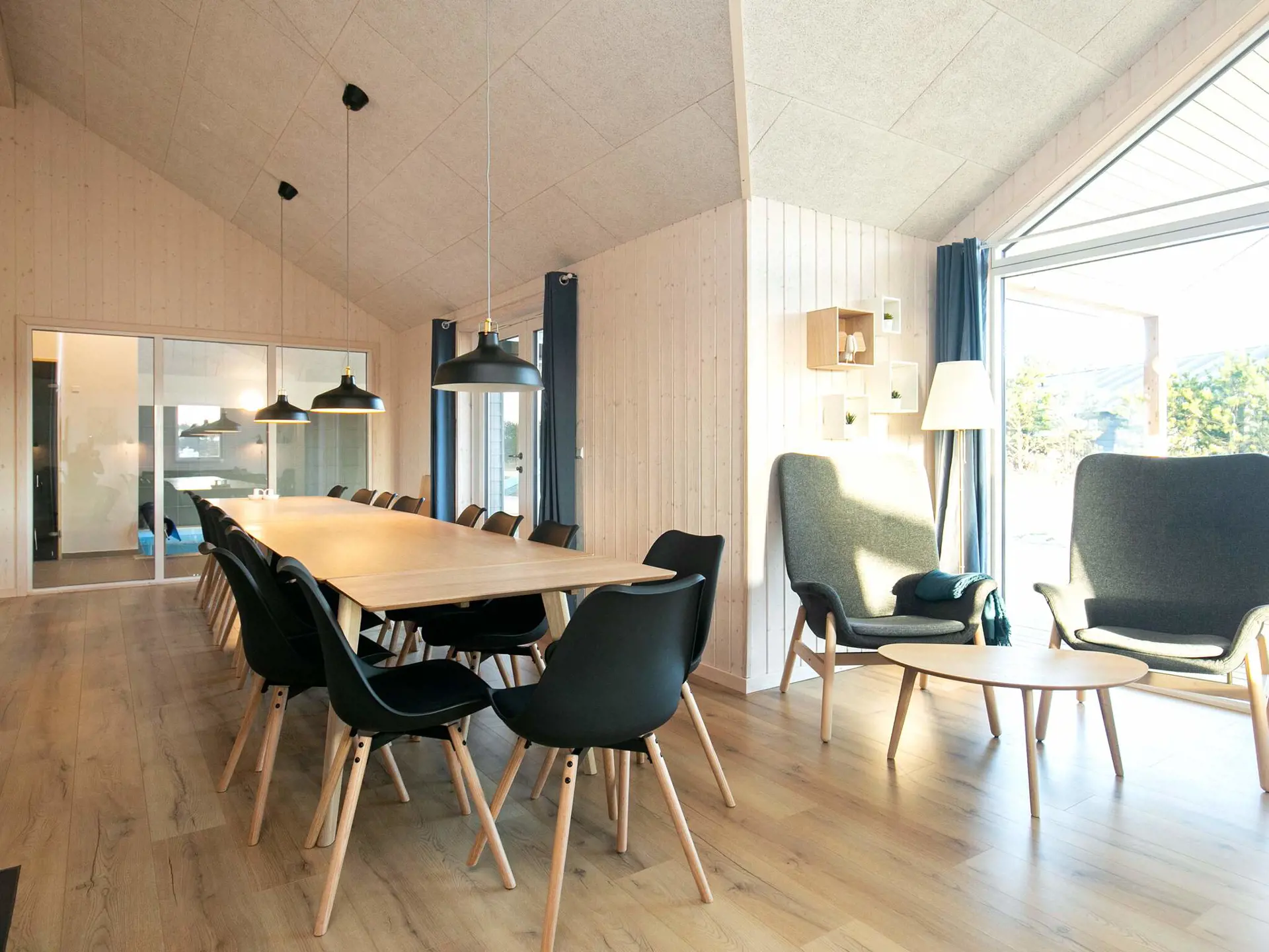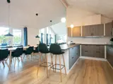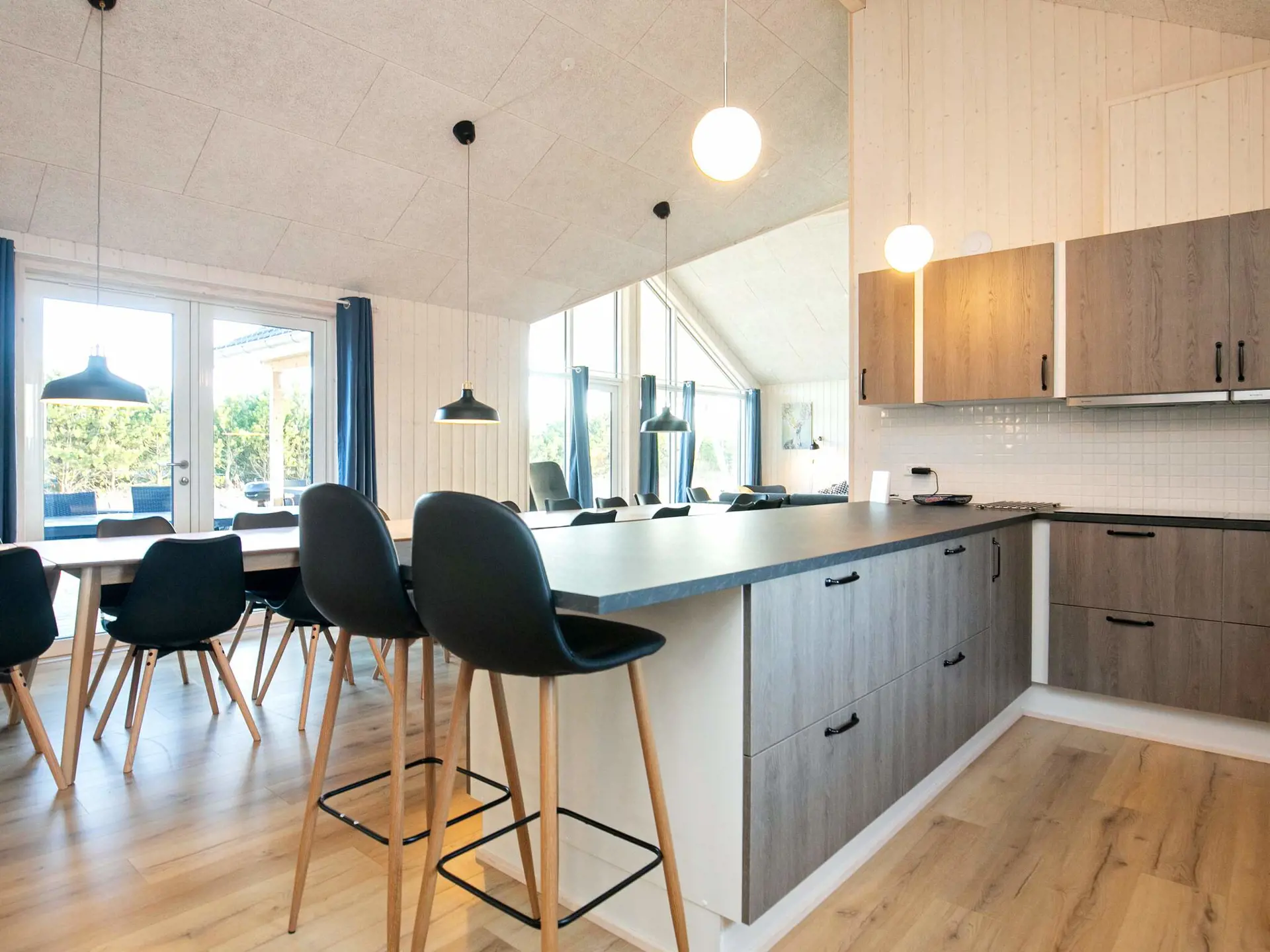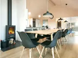 Das Ess- und Wohnbereich ist geschmackvoll eingerichtet und bietet außer zwei Hochstühlen für die ganz Kleinen auch eine Sitzecke und einen Holzofen für kühlere Abende. In der gut durchdachten, offen integrierten Küche, ebenfalls mit Holzofen, stehen ein Kühlschrank, eine große Gefriertruhe sowie zwei Geschirrspüler und zwei Herde zur Verfügung, sodass die gleichzeitige Verpflegung von bis zu 22 Personen kein Problem darstellt.