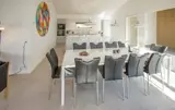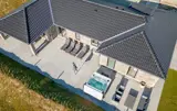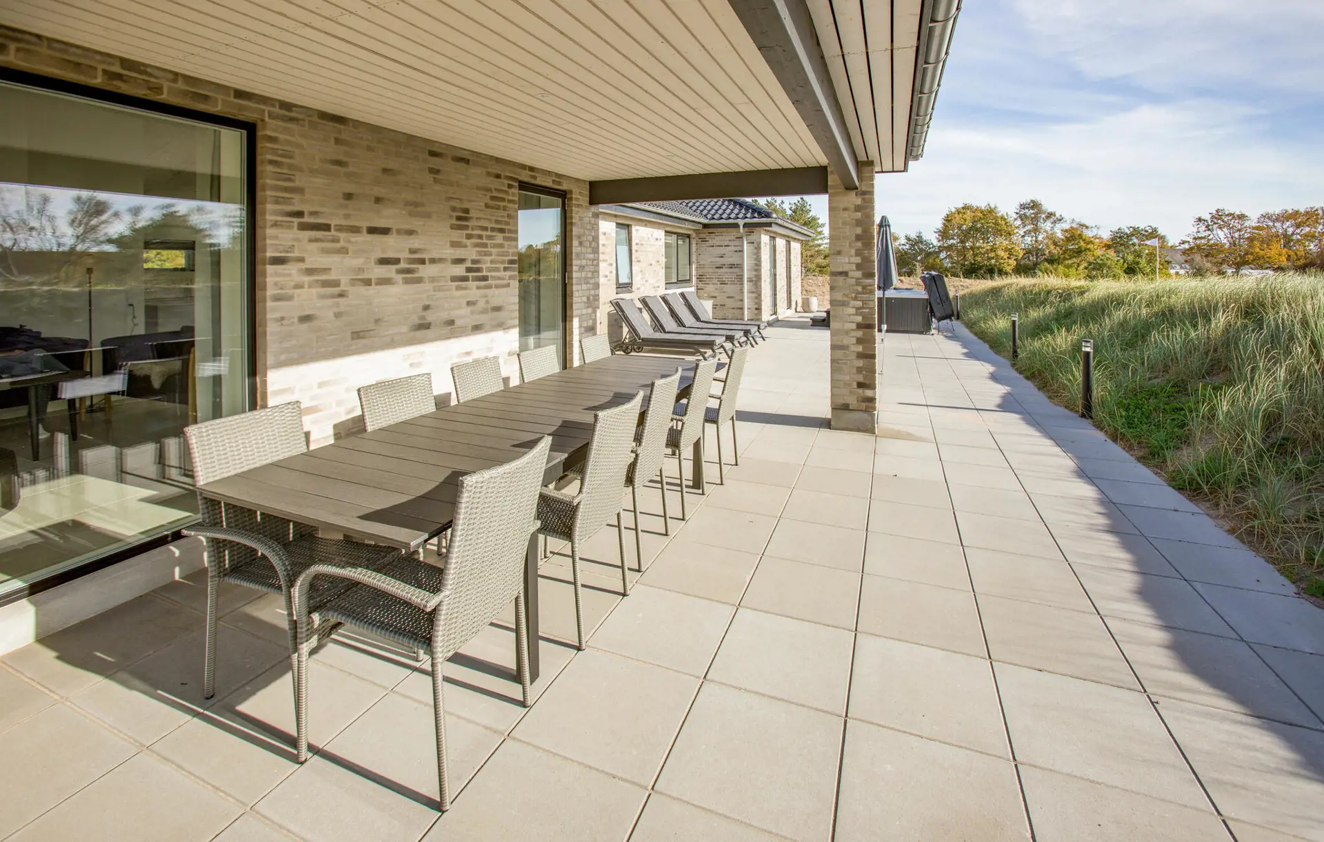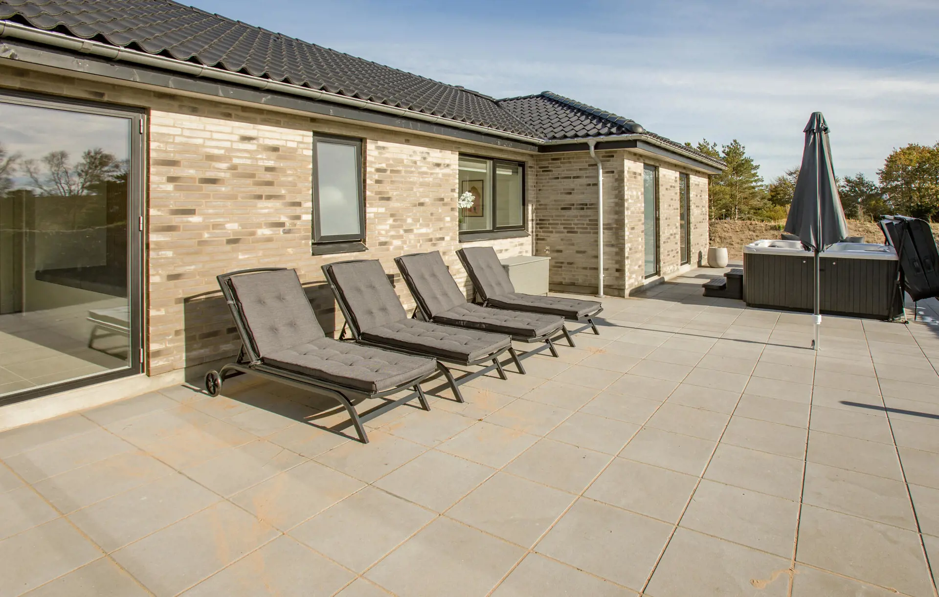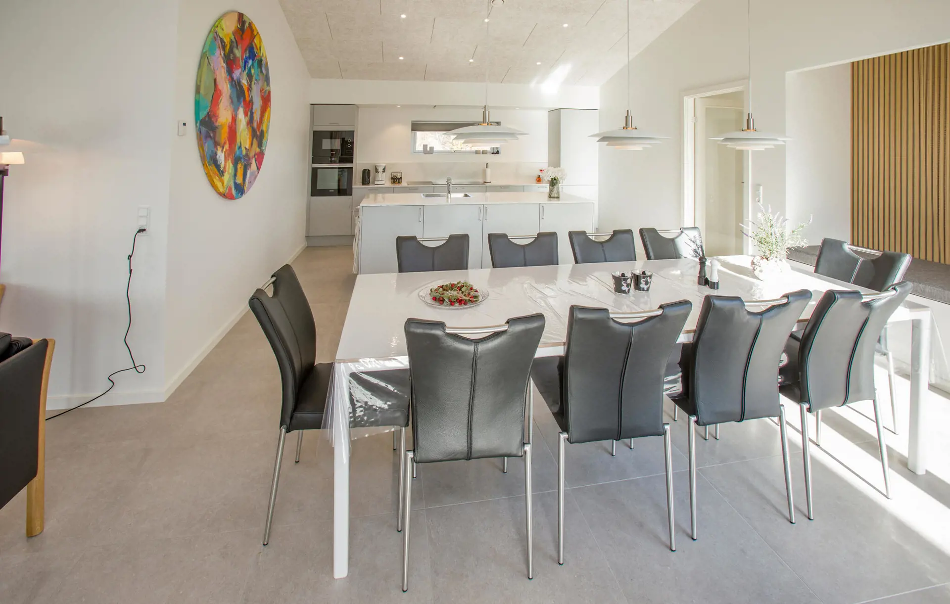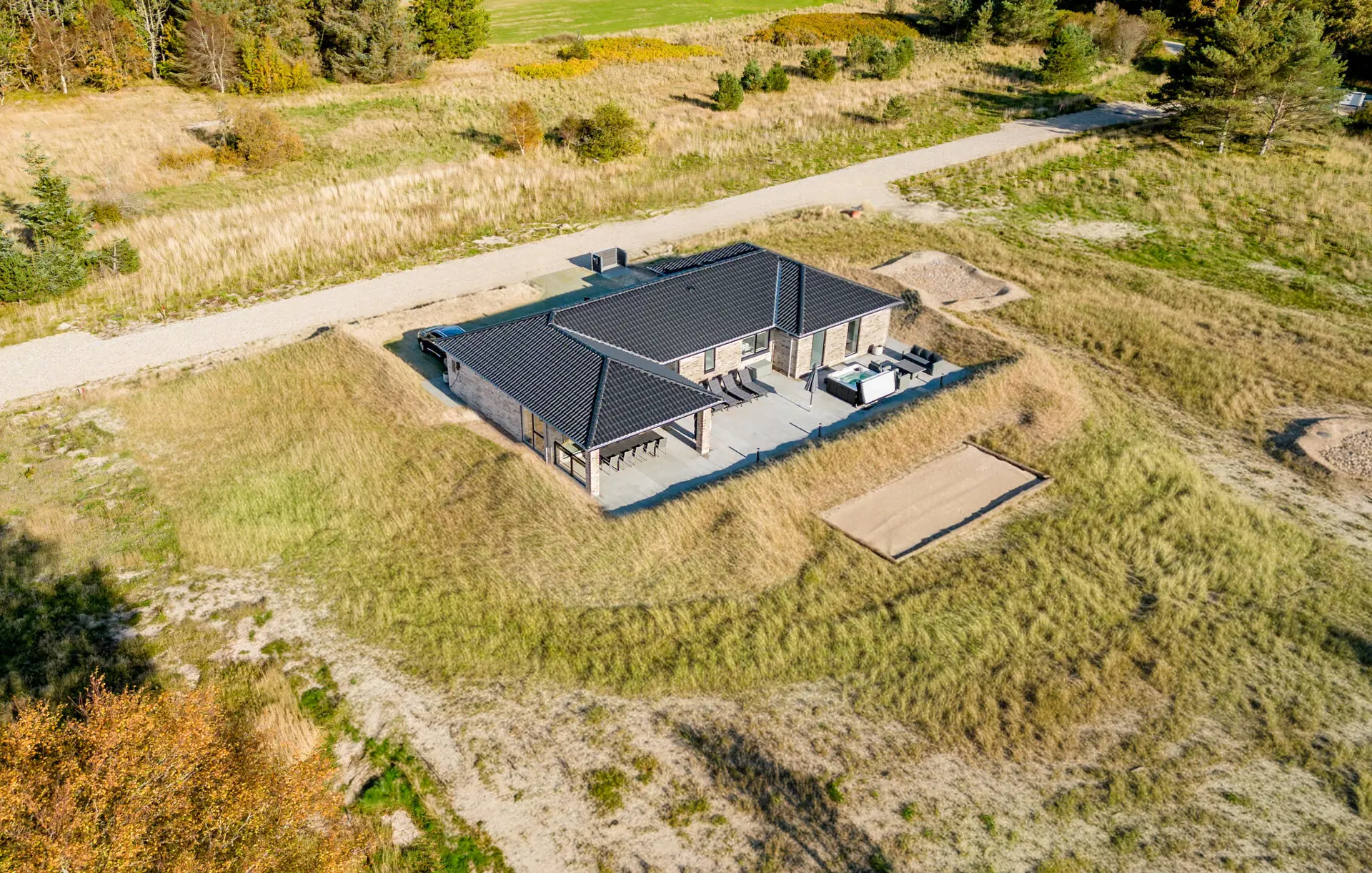Genießen Sie die Ruhe Nordjütlands in Ihrem stilvollen Ferienhaus, das direkt neben dem attraktiven Golfplatz Hvide Klit liegt. Freuen Sie sich auf den hellen, offen gestalteten Wohnbereich mit eleganten Möbeln, großen Fenstern und gemütlichen Sitzgruppen. Bereiten Sie Ihre Mahlzeiten in der modernen, voll ausgestatteten Küche mit Kochinsel und hochwertigen Geräten zu und genießen Sie sie am langen Esstisch mit Blick in die Landschaft. Entspannen Sie sich im Wohnzimmer vor dem großen Smart-TV oder fordern Sie Ihre Mitreisenden im eigenen Aktivitätsraum zu einer Runde Billard oder Tischtennis heraus.
