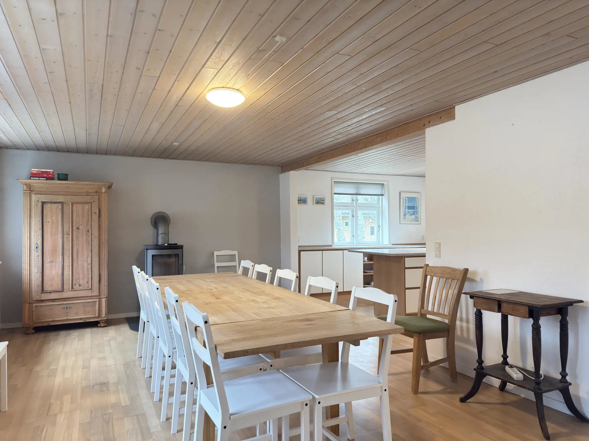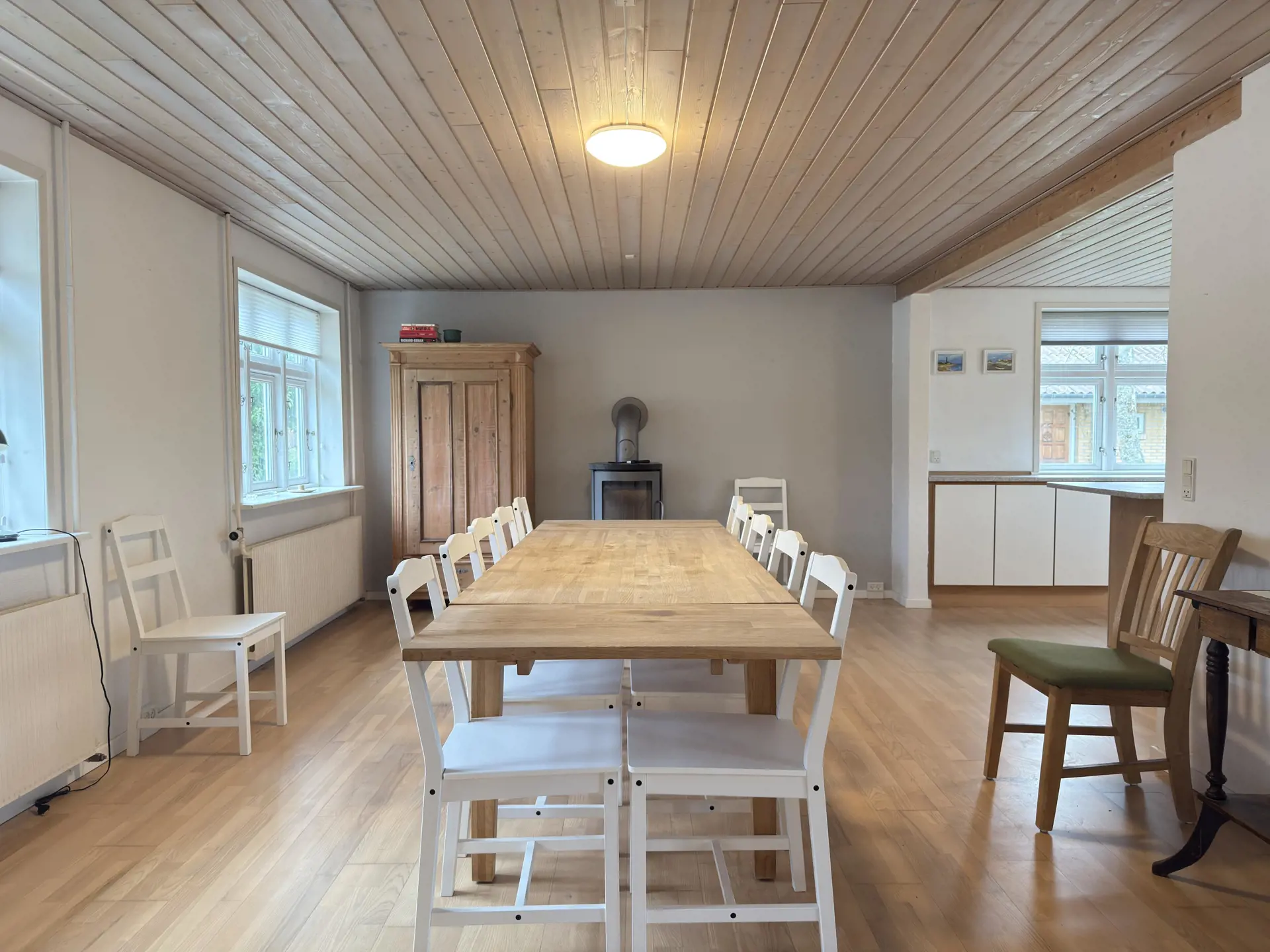 Der große Küchen- und Essbereich ist das Herz des Hauses – ausgestattet mit allem, was man braucht: Backofen, Mikrowelle, Geschirrspüler und einem Kaminofen, der an kühlen Abenden für Wärme und Stimmung sorgt. Daran anschließend liegt das Wohnzimmer, aufgeteilt in einen Essbereich und eine gemütliche Sofaecke, in der Sie vor dem Flachbildfernseher entspannen können. Es gibt sogar zwei Fernseher im Haus – so kommt niemand zu kurz, wenn es um die Fernbedienung geht.