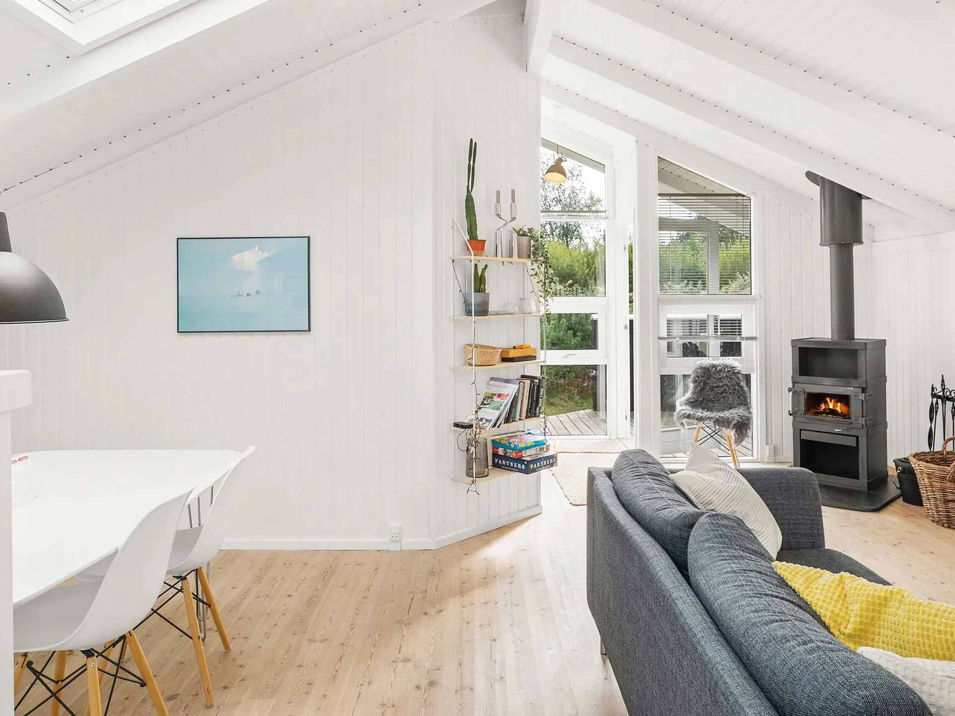 Im Haus offen integrierte Küche mit Essbereich davor und geräumiger Wohnbereich mit Holzofen sowie einer Schlafnische mit zwei Schlafplätzen. Das Haus hat eine Gästetoilette und ein großes Badezimmer mit Sauna und Whirlpool. Es gibt drei gute Zimmer mit Stauraum. Das zugehörige Grundstück liegt ruhig und malerisch und ist durch Bäume und Sträucher gut abgeschirmt. An der Westseite des Hauses finden Sie eine große Terrasse mit viel Platz zum Sonnenbaden sowie für Grillabende. An der Ostseite befindet sich zudem eine kleinere Terrasse mit Morgensonne.