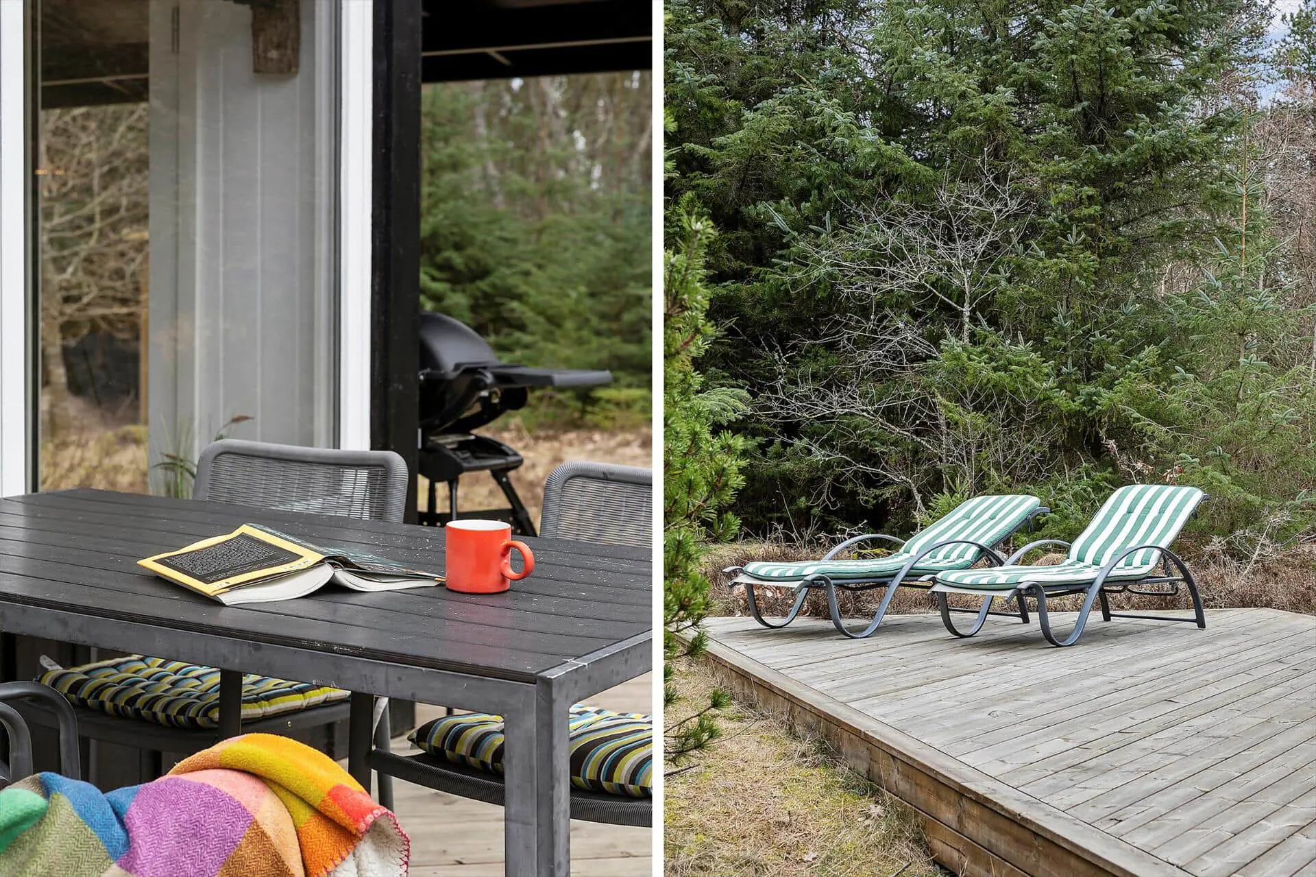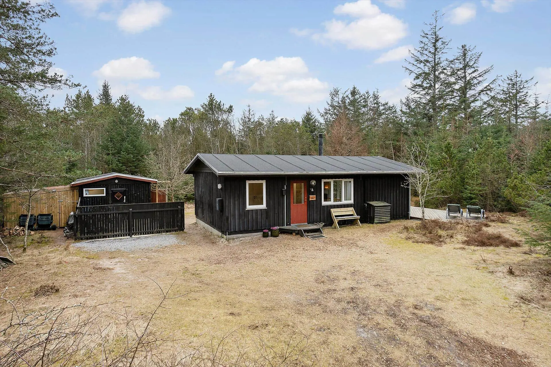 Der Außenbereich ist eine natürliche Verlängerung des Innenraums. Das große Naturgrundstück bietet Platz zum Spielen, Entspannen und für Erlebnisse in friedlicher Umgebung. Die Terrassenbereiche bieten mehrere gemütliche Sitzmöglichkeiten, einschließlich eines überdachten Bereichs, sodass Sie Sonne oder Schatten je nach Bedarf genießen können. Es gibt auch eine Außendusche, die nach einem Tag in Wald oder am Strand für frische Erlebnisse sorgt. Das Grundstück ist groß und uneinsehbar, was Freiheit und Ruhe sowohl für Menschen als auch für vierbeinige Freunde bietet. Hier kann man die Natur hautnah erleben und die entspannte, nordjütländische Atmosphäre spüren.