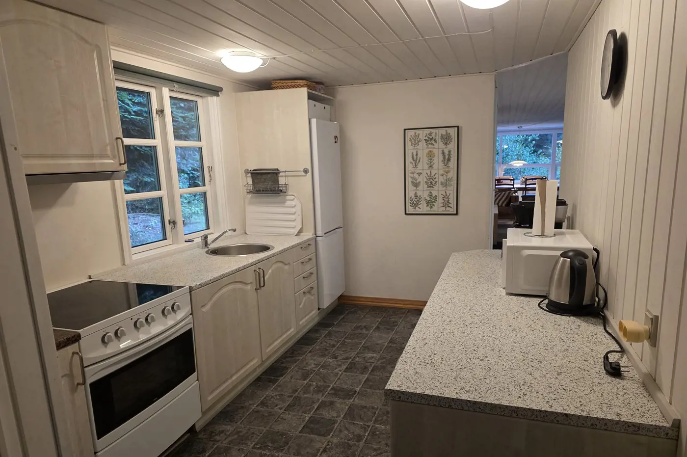 Die Küche ist mit Kühlschrank ausgestattet. Außerdem gibt es 4 Keramik-Kochfelder, Umluftofen.