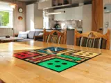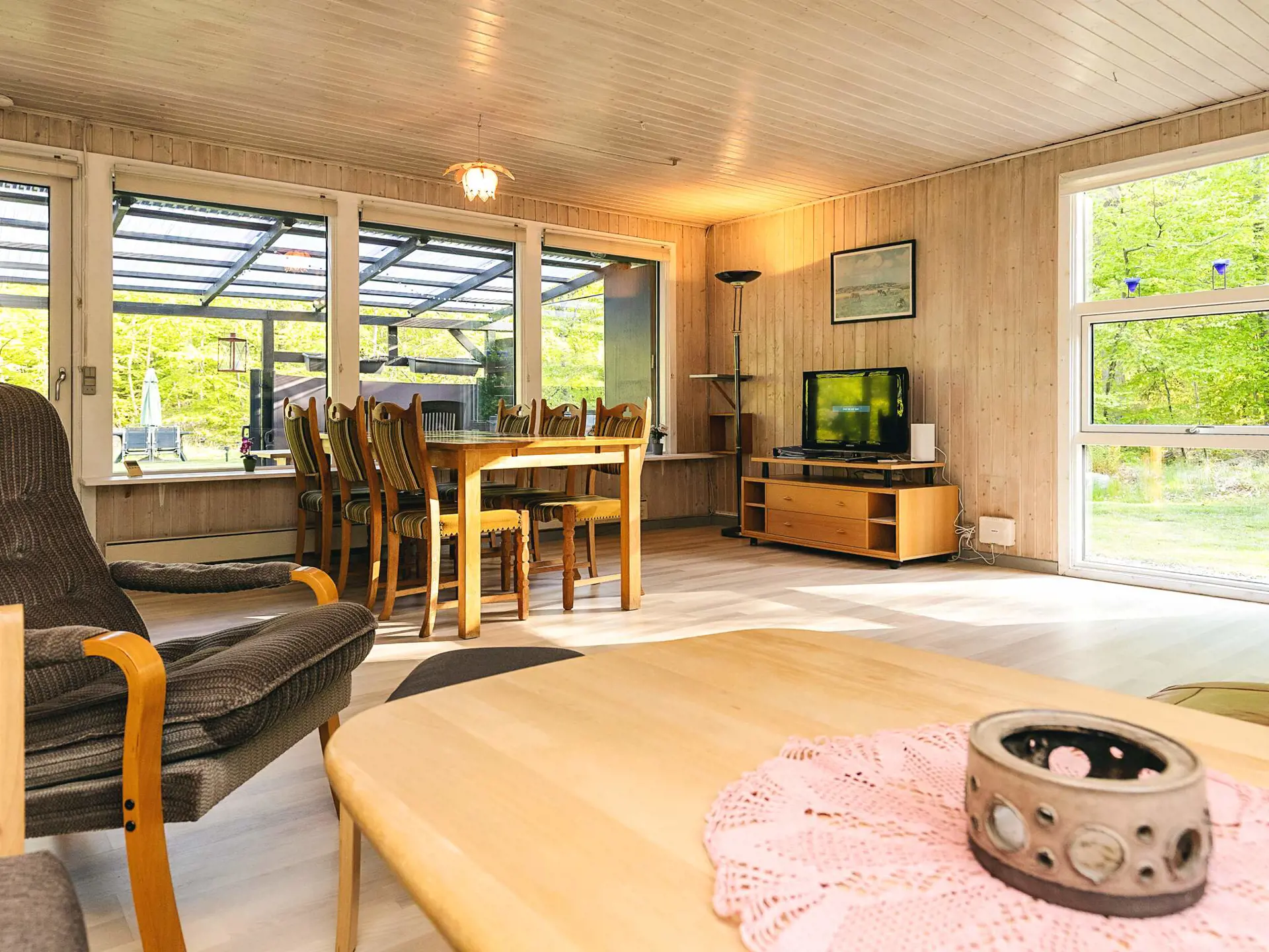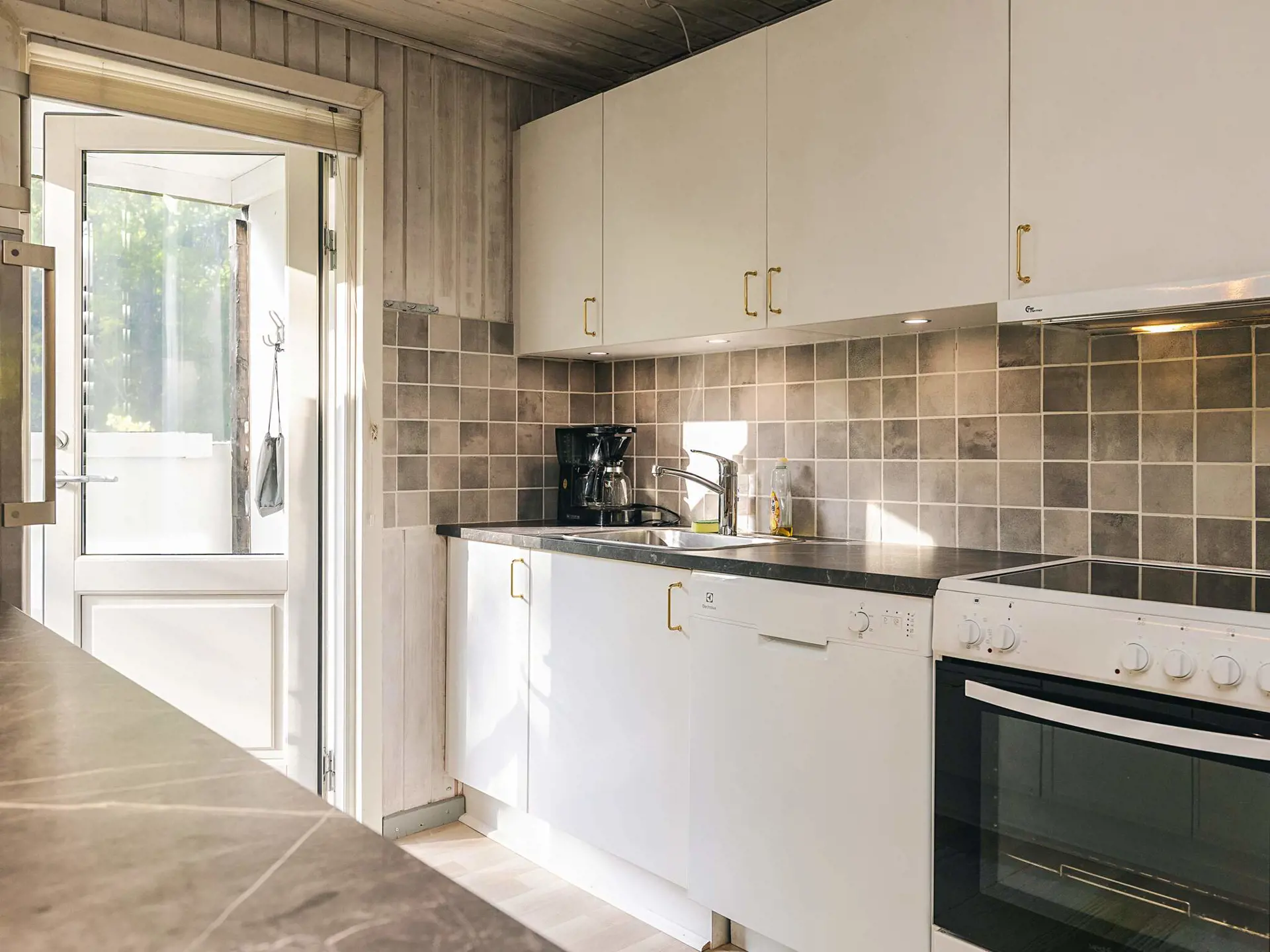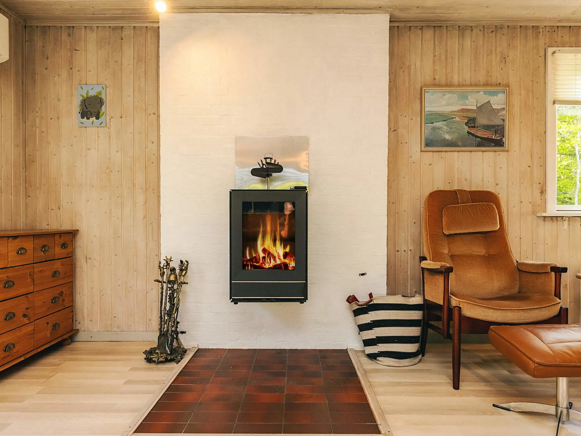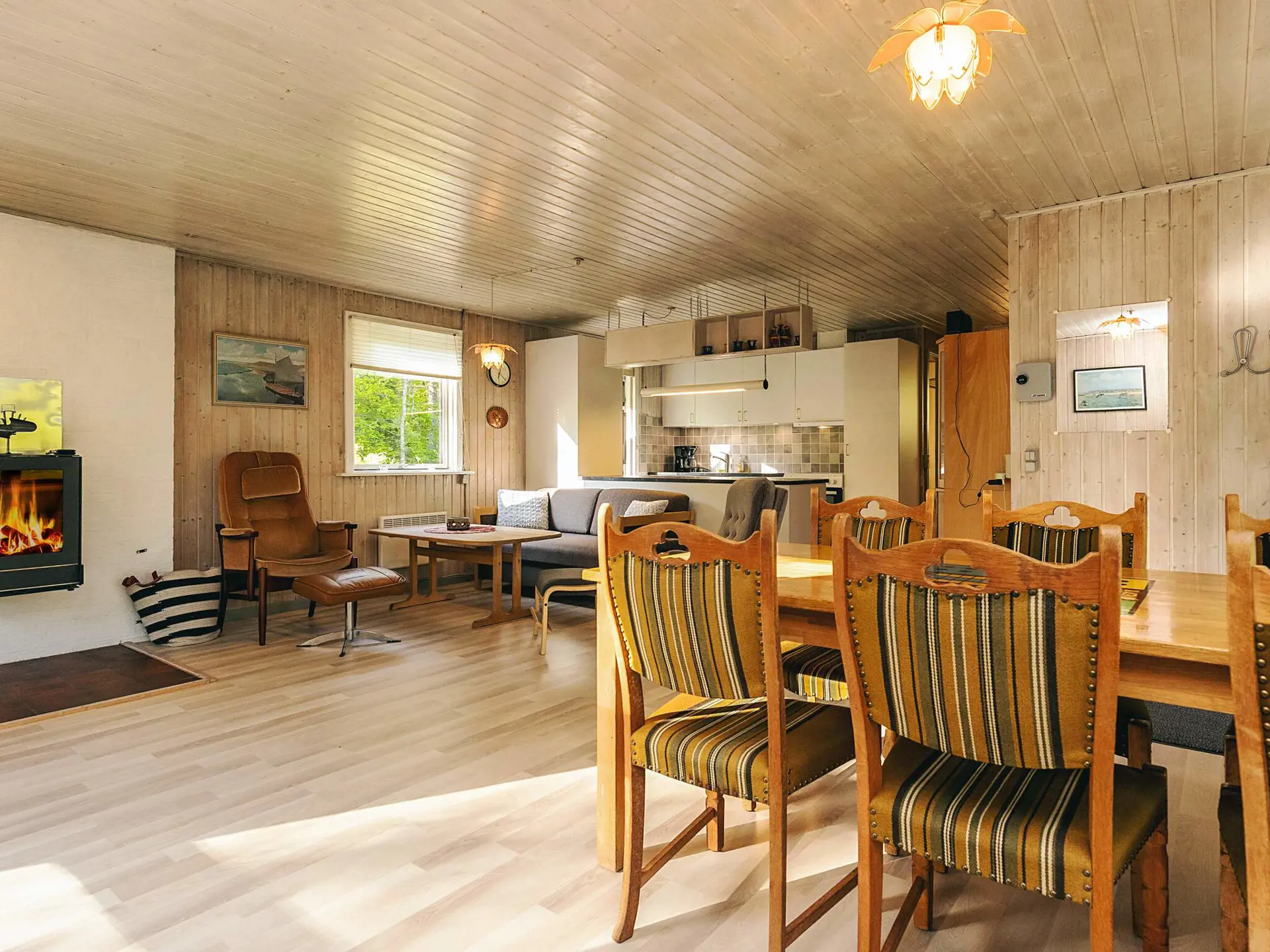 Im Haus findet man einen geräumigen Küchen-/Wohnbereich für das Familienleben, ausgestattet mit Essecke, Holzofen, WLAN sowie einigen deutschen TV-Sendern. Von hier hat man Zugang zu einer teilweise überdachten Terrassenfläche. Außerdem gibt es zwei Schlafzimmer mit je einem Doppelbett sowie ein Schlafzimmer mit Etagenbett im Haus. Zudem Badezimmer mit Dusche/WC und Technikraum mit Waschmaschine. Im Wohnzimmer wurde eine energieeffiziente Wärmepumpe installiert, außerdem gibt es einen Holzofen.