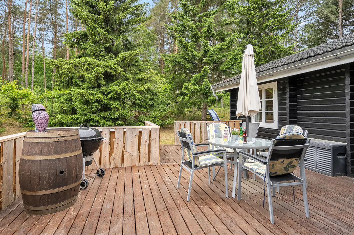 Gemütliches Balken-Ferienhaus mit einem Gästehaus – auf einem großen, ungestörten Naturgrundstück gelegen.