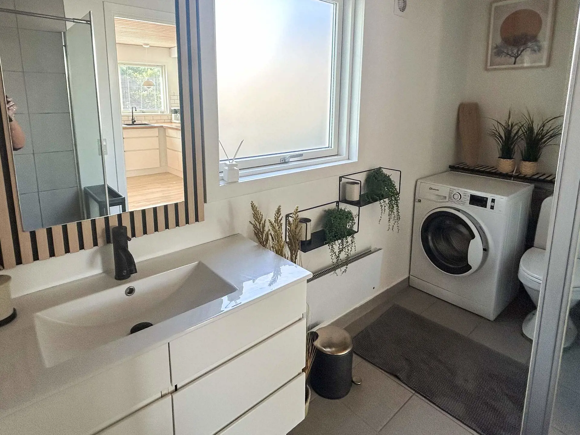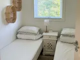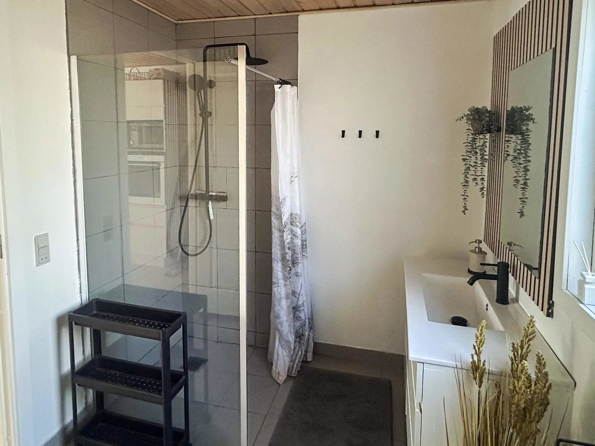 Ein Schlafzimmer mit Doppelbett, zweit Schlafzimmer mit je 2 Einzelbetten, außerdem ein Hems mit einem 3/4-Bett sowie zwei Zusatzbetten auf der Schlafcouch in einem Wohnzimmer, das teilweise abgeschirmt werden kann. Badezimmer mit Dusche und Waschmaschine im Haus. Sie wohnen hier auf einem weitläufigen Naturgrundstück mit viel Platz zum Entspannen, Ballspielen und zum Austoben der Kinder.