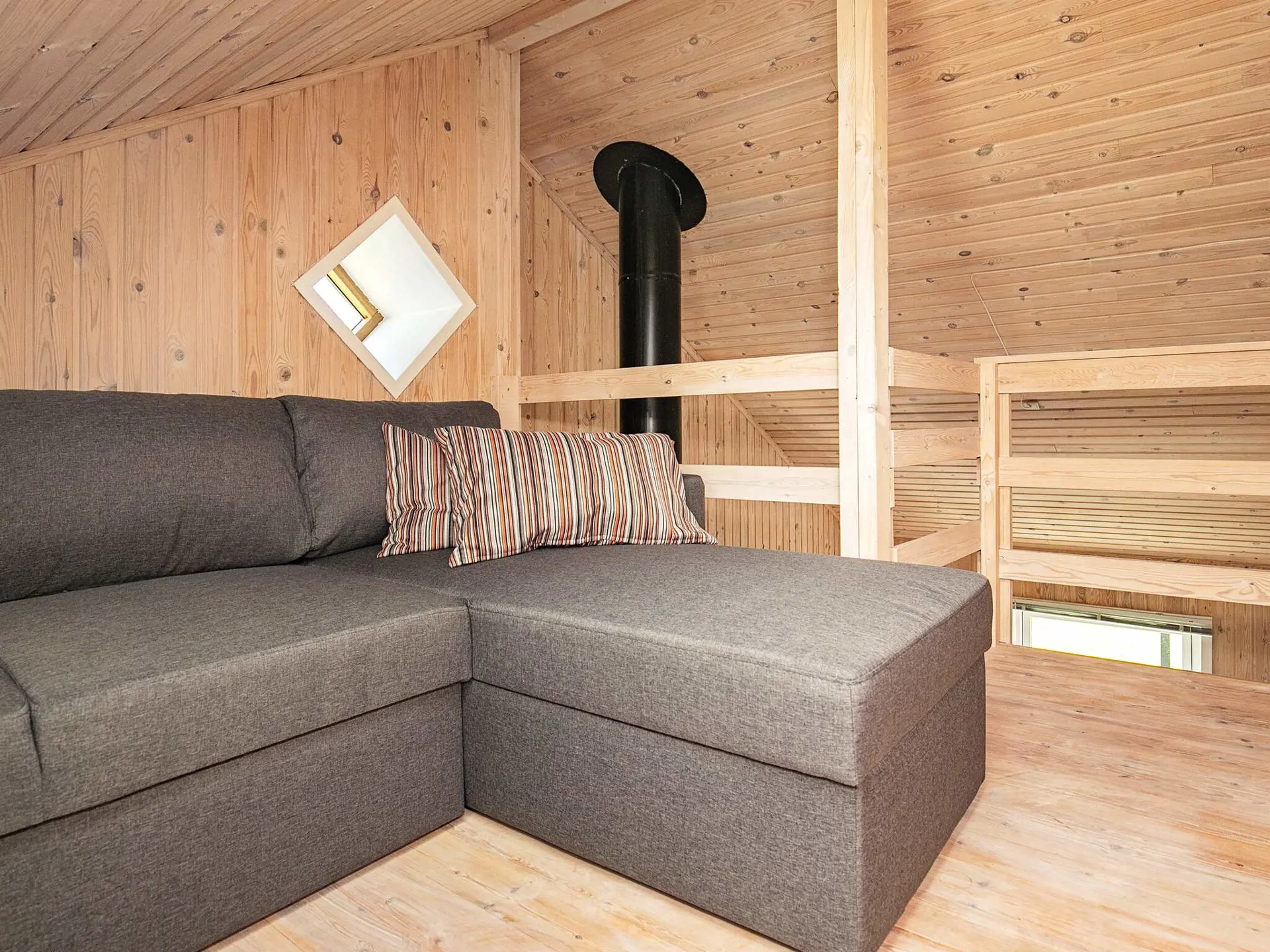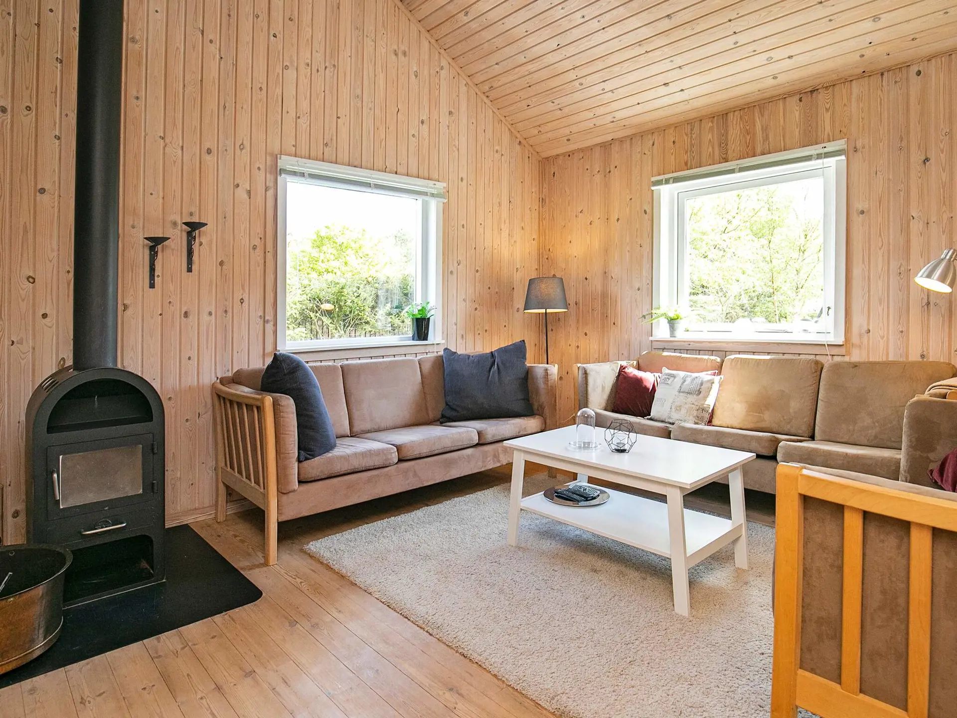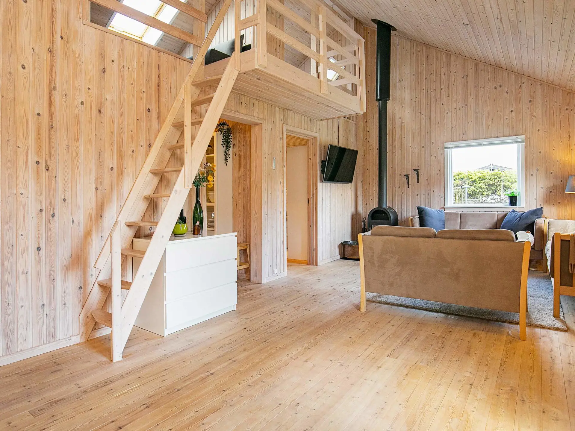 Die 90 m2 große Wohnfläche des Ferienhauses ist sehr gut aufgeteilt und bietet eine Eingangsdiele, eine separate Küche und ein geräumiges Wohnzimmer mit Holzofen, Luft-Luft-Wärmepumpe sowie Platz für das Familienleben. Außerdem zwei helle Schlafzimmer und ein großes Badezimmer mit Dusche, sowie Whirlpool und Sauna im Haus. Vom Wohnbereich aus hat man auch Zugang zu einem großen Hems oben unter dem Dach mit zwei offenen Zimmern. In dem einen Raum oben gibt es eine Sitzecke mit doppelter Schlafcouch. Der Fernseher im Wohnzimmer verfügt über Chromecast zum Streamen der eigenen TV-Anbieter über WLAN.
