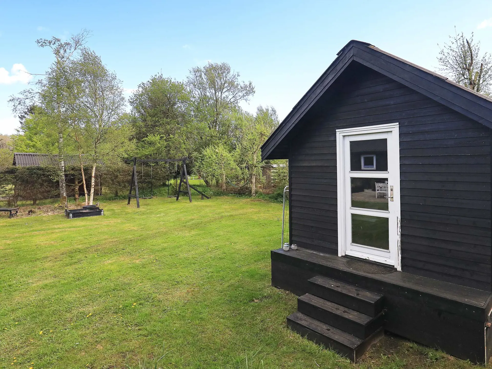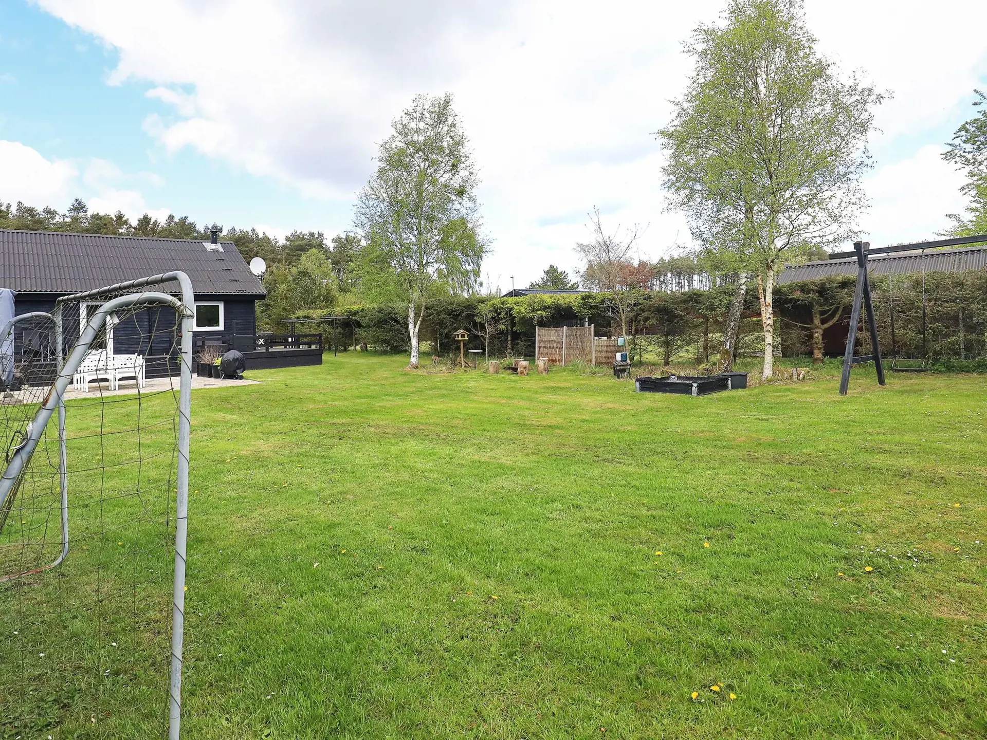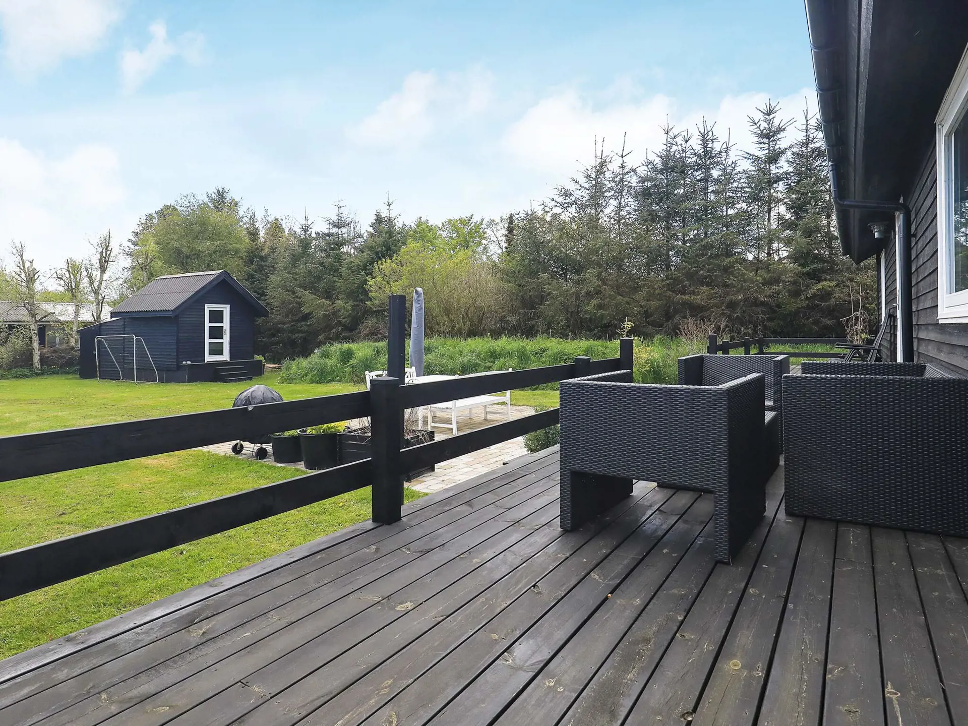 Das 1.000 m2 große Naturgrundstück liegt völlig ungestört. Ringsum fast das ganze Haus erstreckt sich eine erhöhte Holzterrasse, auf der Sie die sonnigen Tage, Ihre Mahlzeiten und die langen, hellen Sommerabende genießen können.