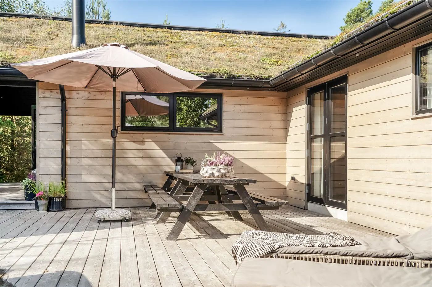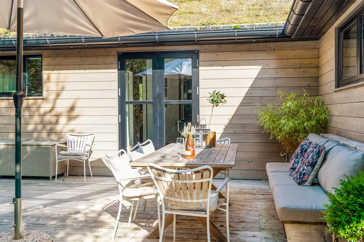 Die Ferienunterkunft liegt auf einem 1250 m² großen Naturgrundstück. Die Entfernung zum Meer beträgt 380 m. Die Entfernung zum Fjord beträgt 2050 m. Die nächste Einkaufsmöglichkeit liegt 2170 m entfernt. In einem Abstand von 1300 m gibt es einen Golfplatz. Es steht ein offenes Terrassenareal zur Verfügung. Außerdem gibt es überdachte Terrasse. Außendusche. Es beteht die Möglichkeit das Essen in der Außenküche zuzubereiten. Es steht ein Grill zur Verfügung. Es ist ein Ladestecker für Elektroautos installiert. Ladestecker Typ 2. Mit einer Ladeleistung von 11 kW. Parkplatz auf dem Grundstück.