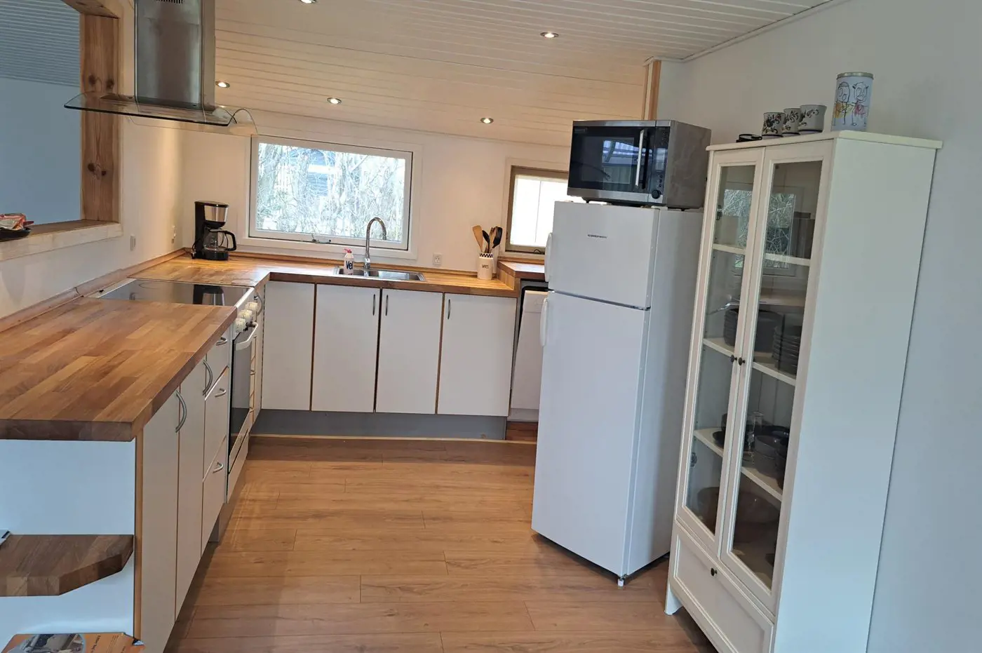 Die Küche ist mit Kühlschrank ausgestattet. Außerdem gibt es 4 Keramik-Kochfelder, Umluftofen, Mikrowelle sowie Geschirrspüler.