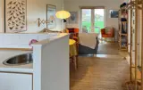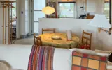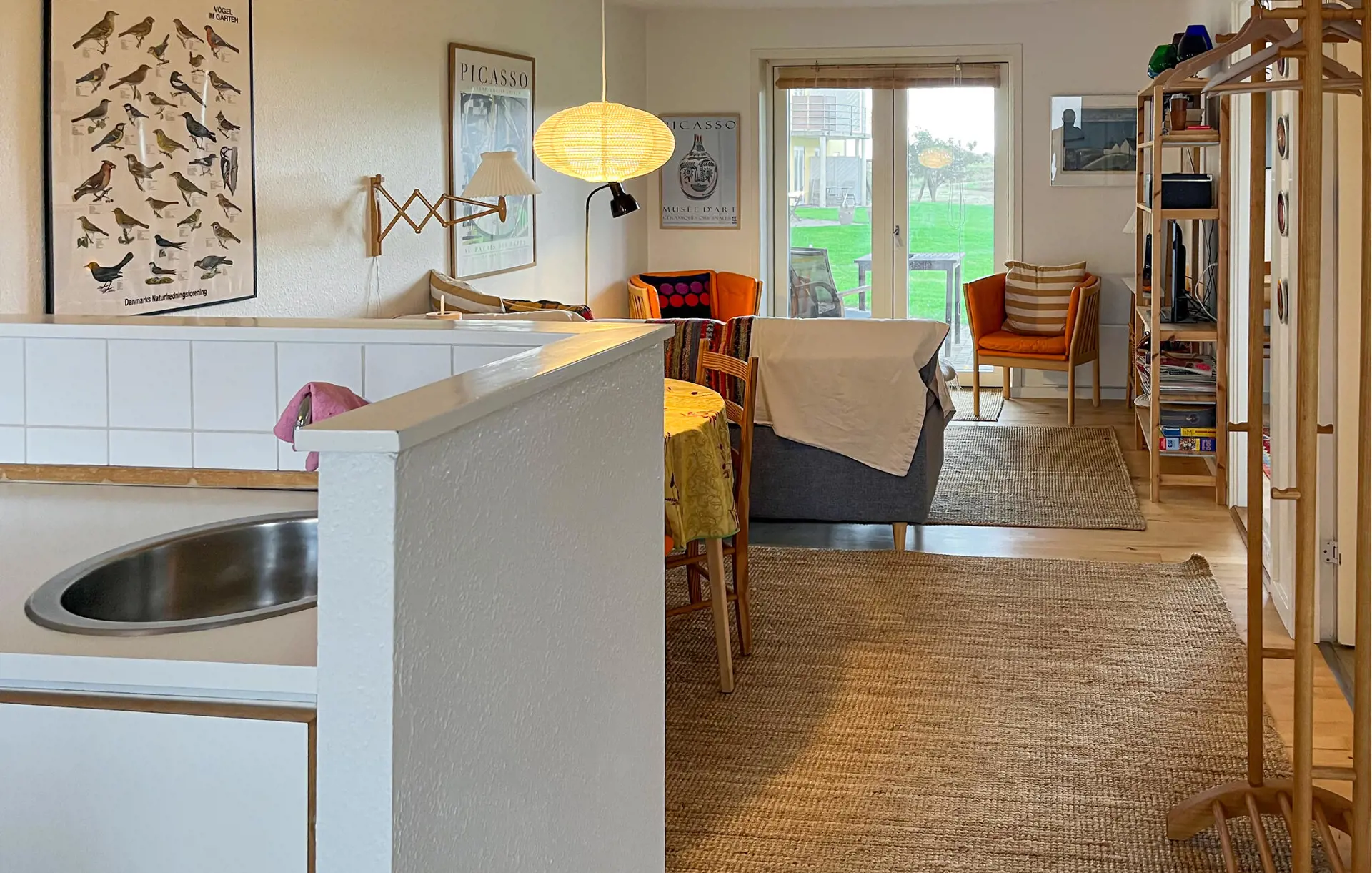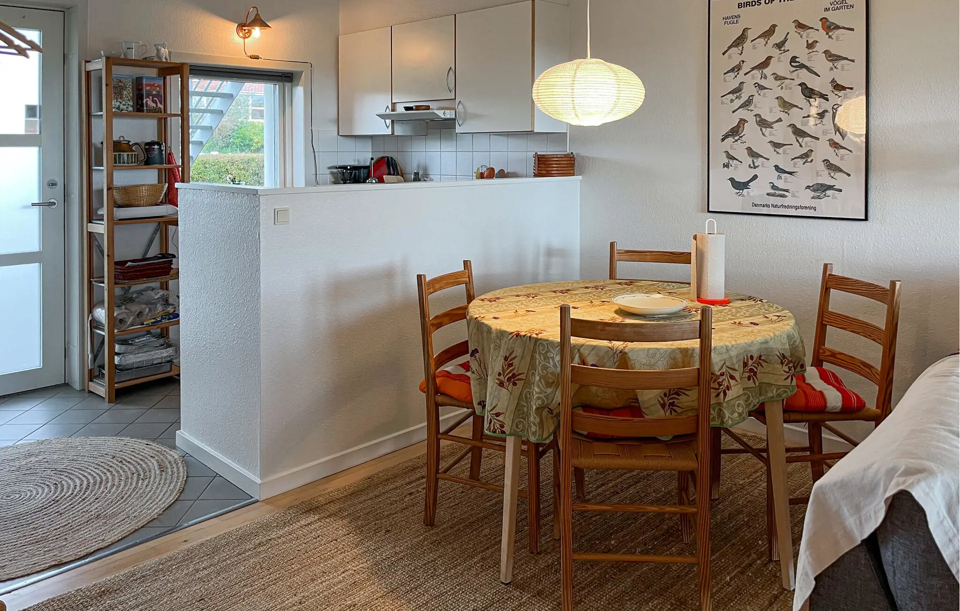 Der Innenbereich Ihrer Ferienwohnung ist gemütlich und heimelig gestaltet. Machen Sie es sich im Wohnraum auf dem Sofa bequem, lesen Sie ein gutes Buch oder genießen Sie den Blick ins Grüne durch die große Terrassentür. Farbenfrohe Akzente und liebevolle Details schaffen eine warme Atmosphäre. Bereiten Sie in der funktionalen Küche Ihre Mahlzeiten zu und genießen Sie diese am angrenzenden Esstisch. Abends sorgt die gemütliche Beleuchtung für eine entspannte Stimmung, während der Fernseher für Unterhaltung sorgt.