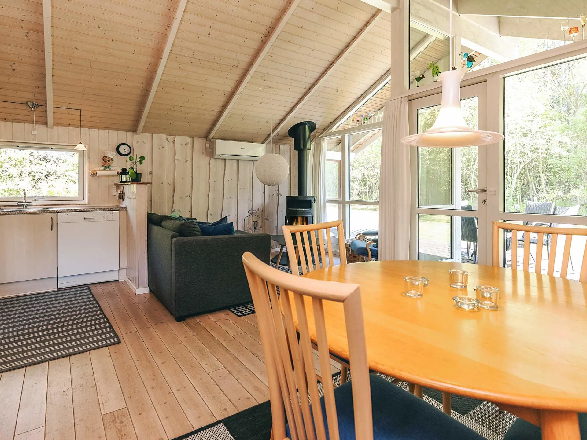 Das Wohnzimmer des Ferienhauses ist schön und offen gestaltet und bietet tolle Möglichkeiten für geselliges Beisammensein mit der Familie. Hier können Sie auf dem Sofa am Holzofen oder vor dem Fernseher bei einem guten Film entspannen, denn das Haus verfügt über Smart-TV und Chromecast. Der Esstisch lädt zu Spieleabenden mit einem der vielen im Haus vorhandenen Brettspiele und natürlich zum Genießen köstlicher, in der Küche zubereiteter Mahlzeiten ein.