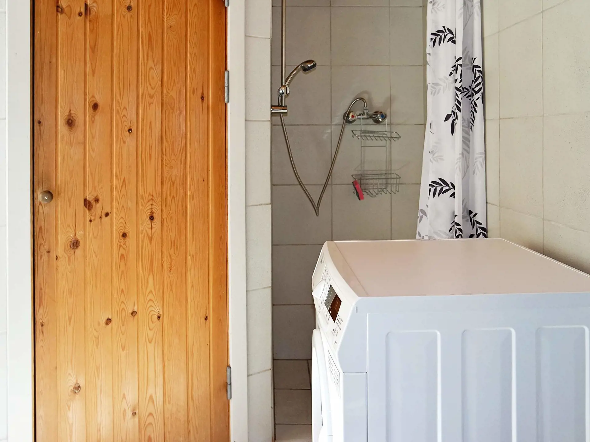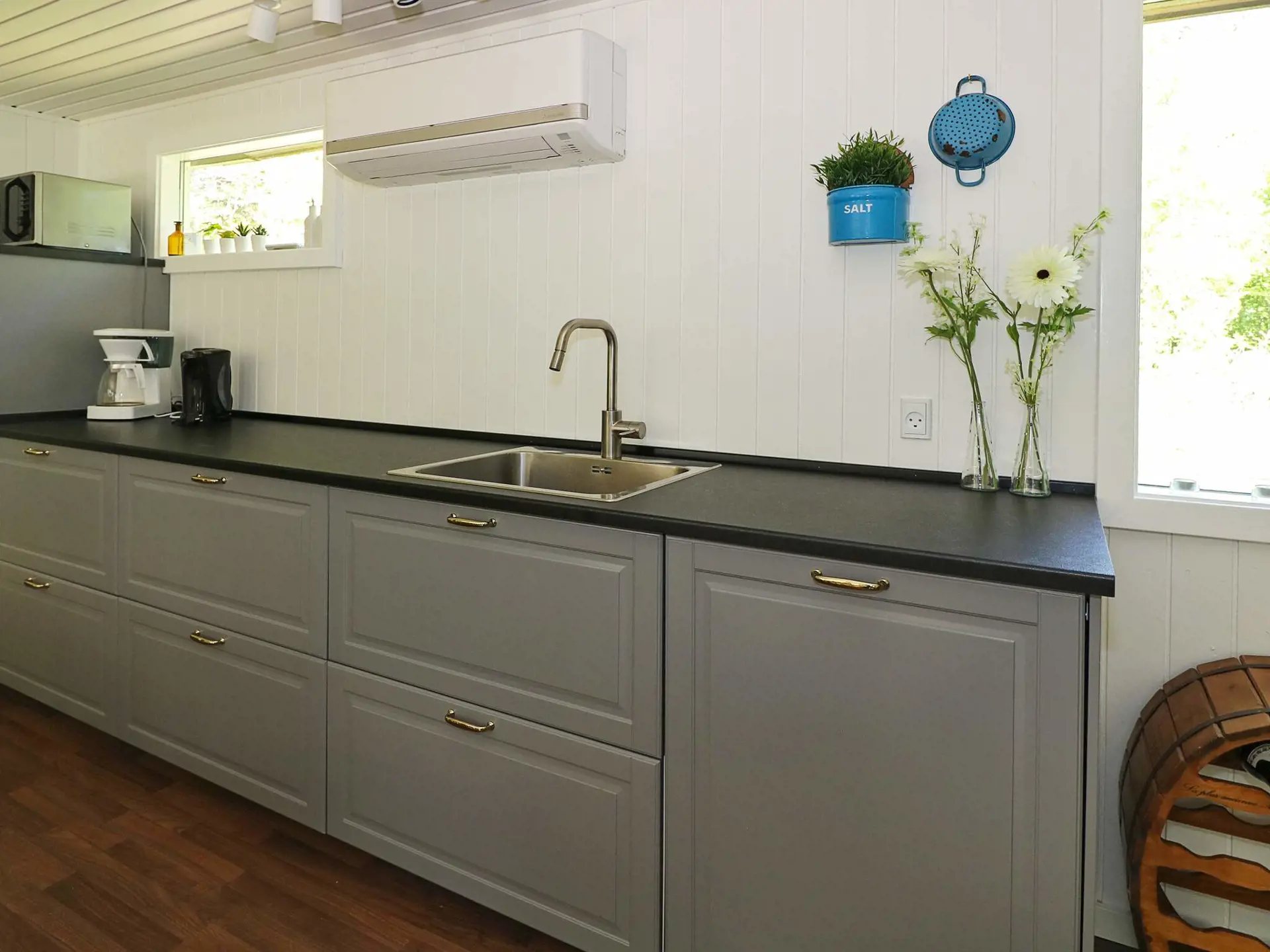 Innen heller, geräumiger Wohn-/Essbereich sowie kleinere Küchennische mit neuer Kücheneinrichtung und neuem Fußbodenbelag von 2021. Im Wohnbereich gibt es viel Platz für das Familienleben und zusätzlich zur klimafreundlichen Wärmepumpe auch einen Holzofen für kühlere Abende. Von diesem Raum aus hat man Zugang zur Terrasse. Außerdem zwei Schlafzimmer mit jeweils einem Doppelbett, ein drittes mit zwei Einzelbetten sowie ein Kinderzimmer mit Etagenbett im Haus. Größeres Bad mit Whirlpool und Sauna, kleines zudem Gäste-WC im Haus.