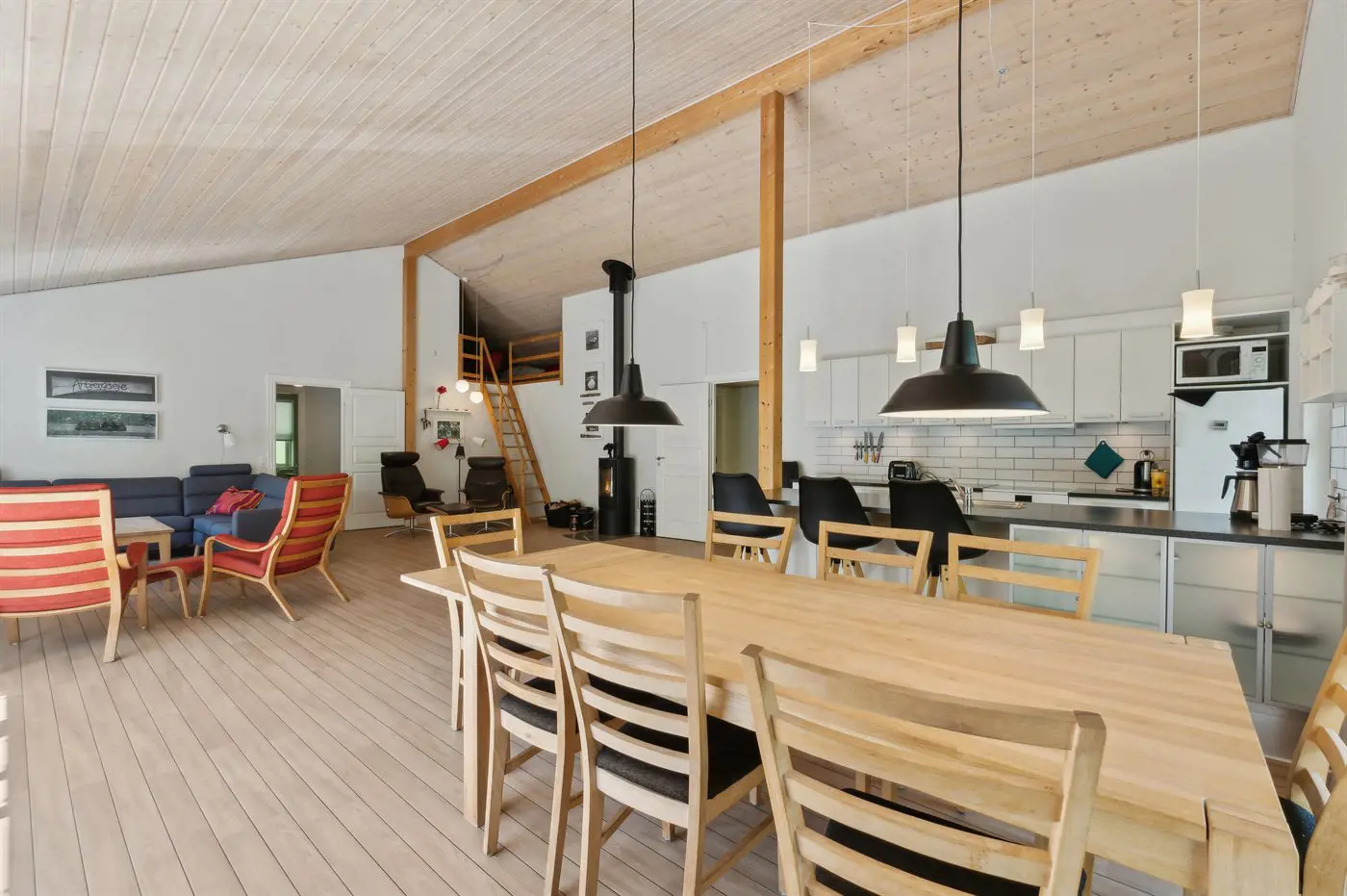Vom Wohnbereich aus führt eine Treppe hinauf zu einem gemütlichen offenen Obergeschoss mit Sofa und Matratzen – ideal als zusätzlicher Entspannungsbereich. Draußen erwartet dich eine große Terrasse mit Grill, perfekt für lange, stimmungsvolle Sommerabende.