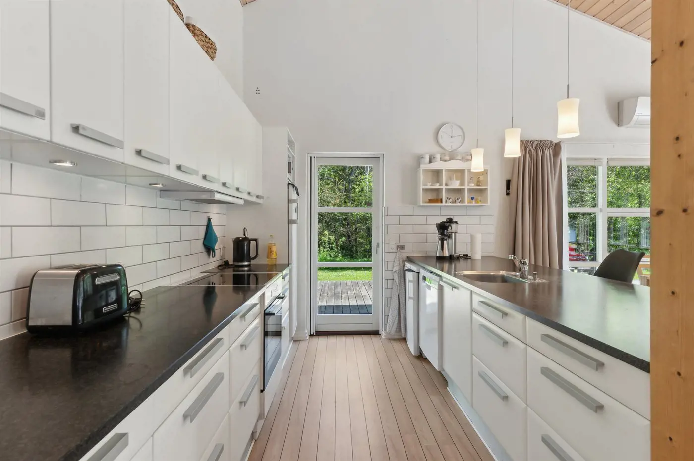 Die Küche ist mit Kühlschrank ausgestattet. Außerdem gibt es 4 Induktions-Kochzonen, Umluftofen, Mikrowelle sowie Geschirrspüler.