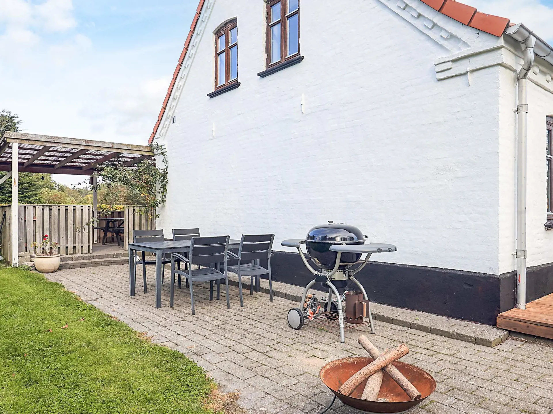 Die Wohnung verfügt über eine schöne Terrasse, die das Haus umgibt und teilweise überdacht ist. Rundherum stehen Gartenmöbel bereit, und Sie können einen Holzkohlegrill nutzen.