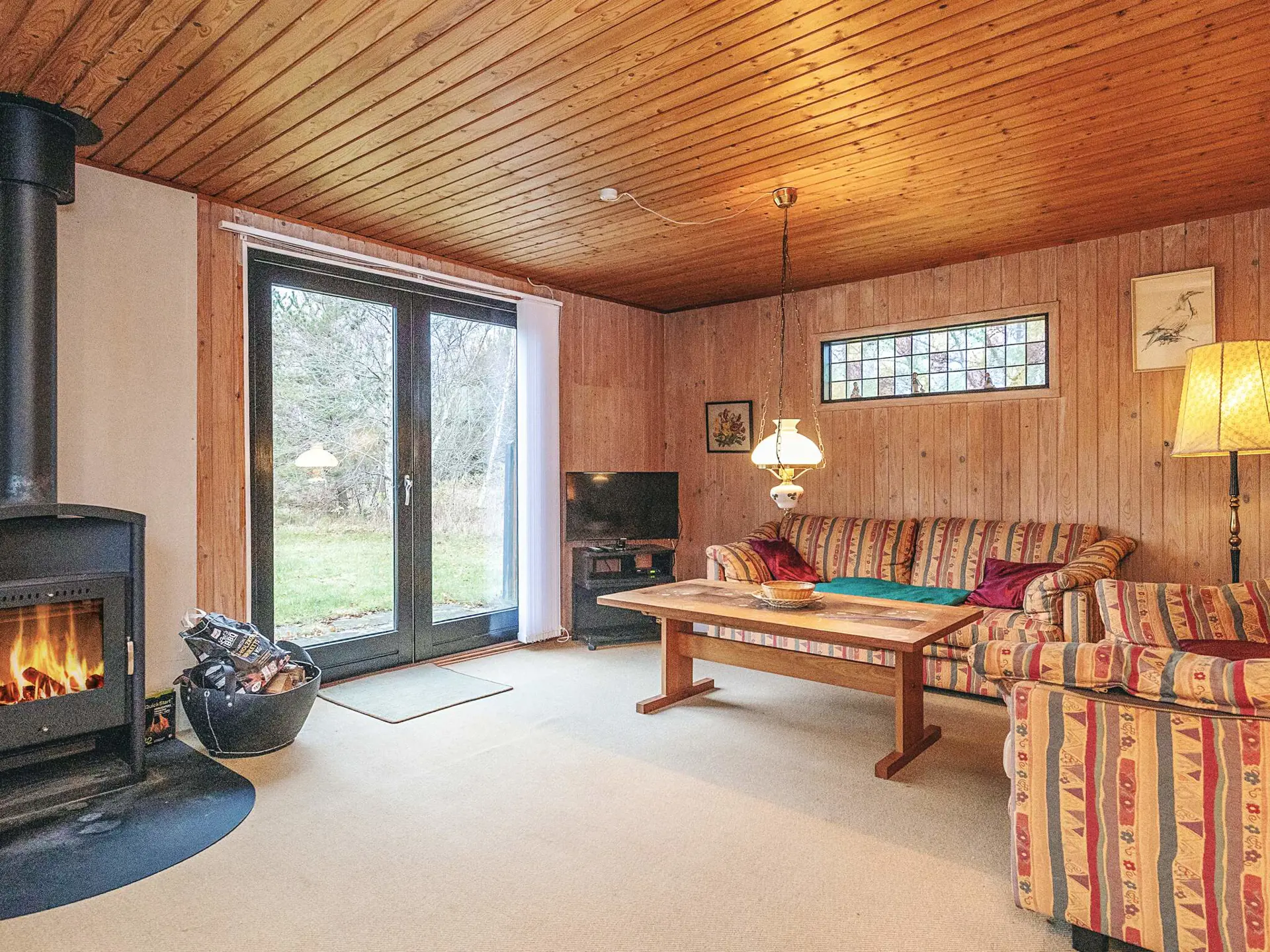 Es bietet auf ca. 57 m² eine Küche mit Kühlschrank, Herd und Kaffeemaschine sowie ein Wohnzimmer mit Esstisch, Sofa, Fernseher und einem gemütlichen Kaminofen. Außerdem gibt es ein Badezimmer mit Dusche und zwei Schlafzimmer; eines mit Doppelbett, das andere mit zwei Kojen im Etagenbett.