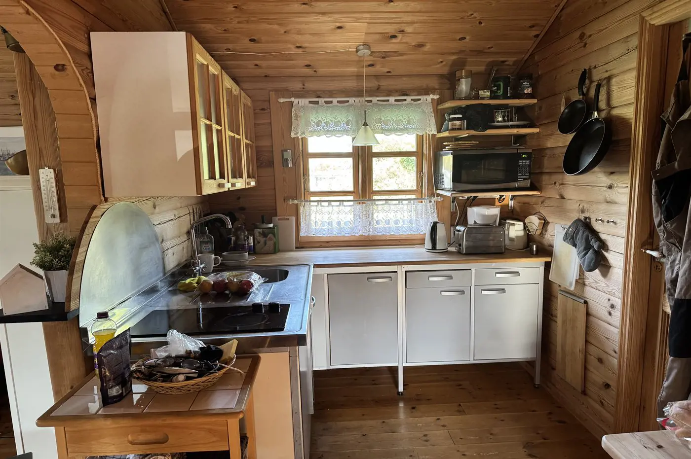 Die Küche ist mit Kühlschrank ausgestattet. Außerdem gibt es 2 Keramik-Kochfelder, Umluftofen, Airfryer.