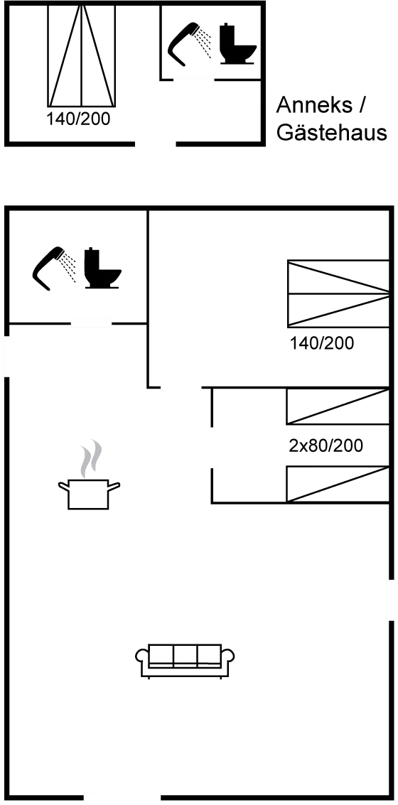 Die Schlafplätze verteilen sich auf 3 Schlafräume. 4 Schlafplätze in Doppelbetten. 2 Schlafplätze in Einzelbetten. 2 von diesen Schlafplätzen befinden sich im Gästehaus. Ferner steht ein Kinderbett zur Verfügung.