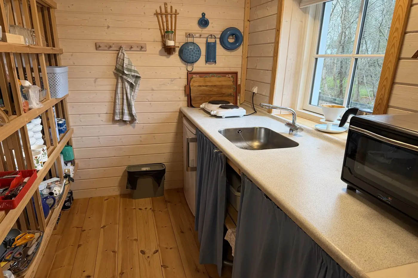 Die Küche ist mit Kühlschrank ausgestattet. Außerdem gibt es 2 elektrische Kochplatten, Umluftofen.