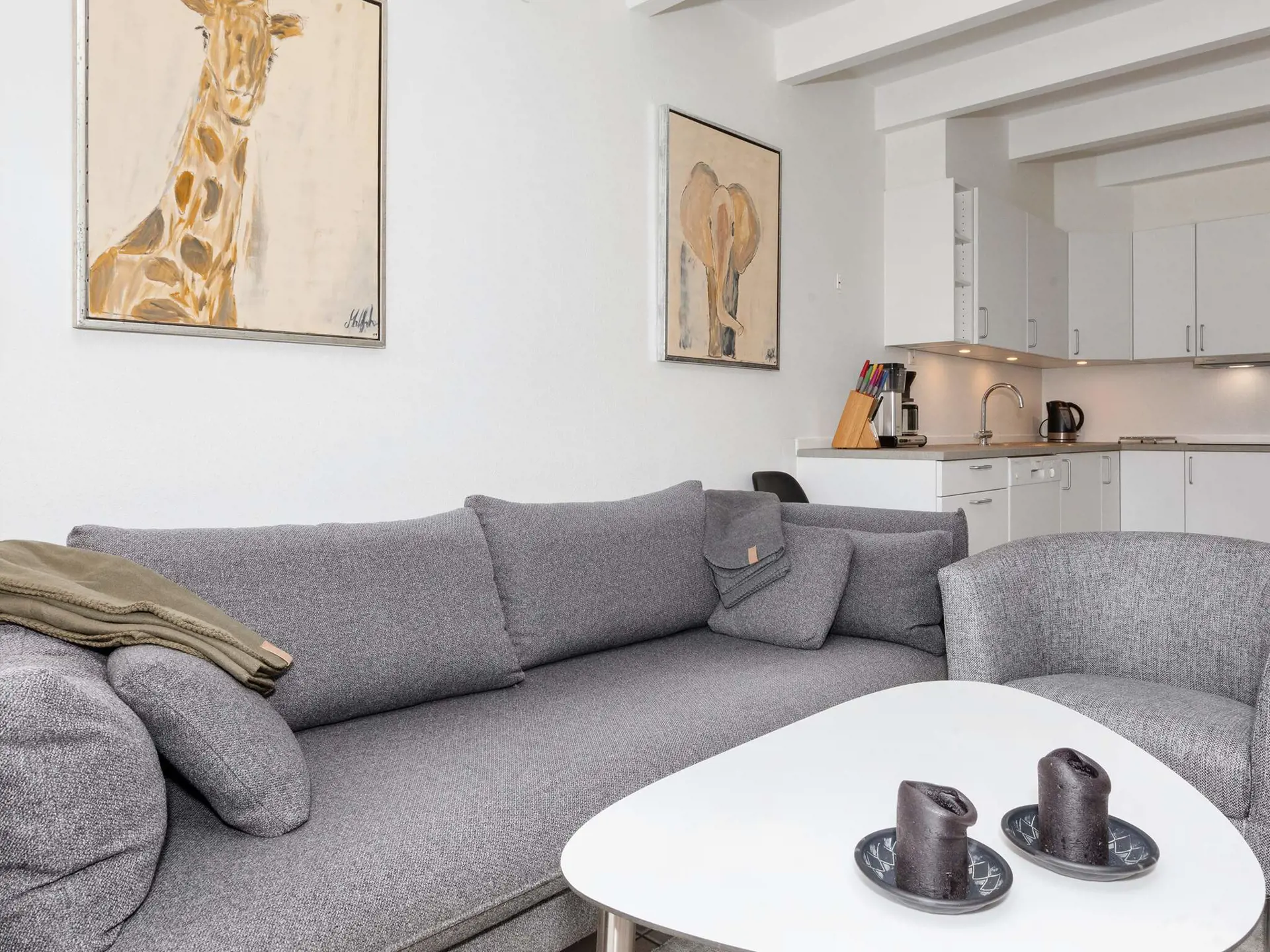 Die Ferienwohnung ist mit einer Küche, einem Ess- und Wohnzimmer sowie einem Badezimmer im Erdgeschoss mit Zugang zu einer Terrasse mit Meerblick ausgestattet. Oben im 1. Stock gibt es ein Schlafzimmer mit Doppelbett und ein zweites mit zwei Einzelbetten sowie Zugang zu einem Balkon mit Meerblick. Außerdem auf dem Flur ein Schlafalkoven mit Doppelbett in 3/4 Breite. Darüber hinaus große Gemeinschaftsflächen vor Ort, die zum Spielen und Ballspielen einladen.