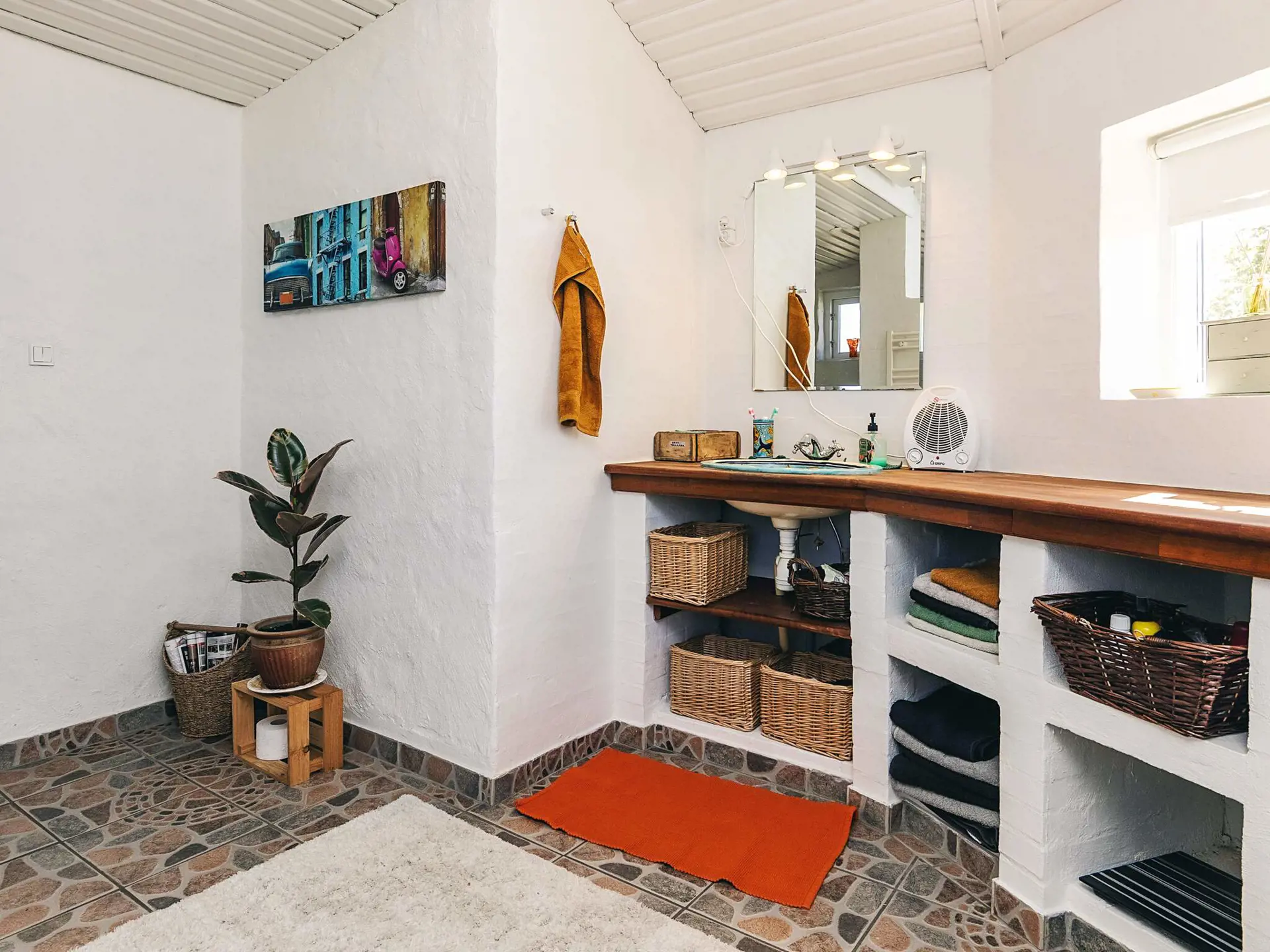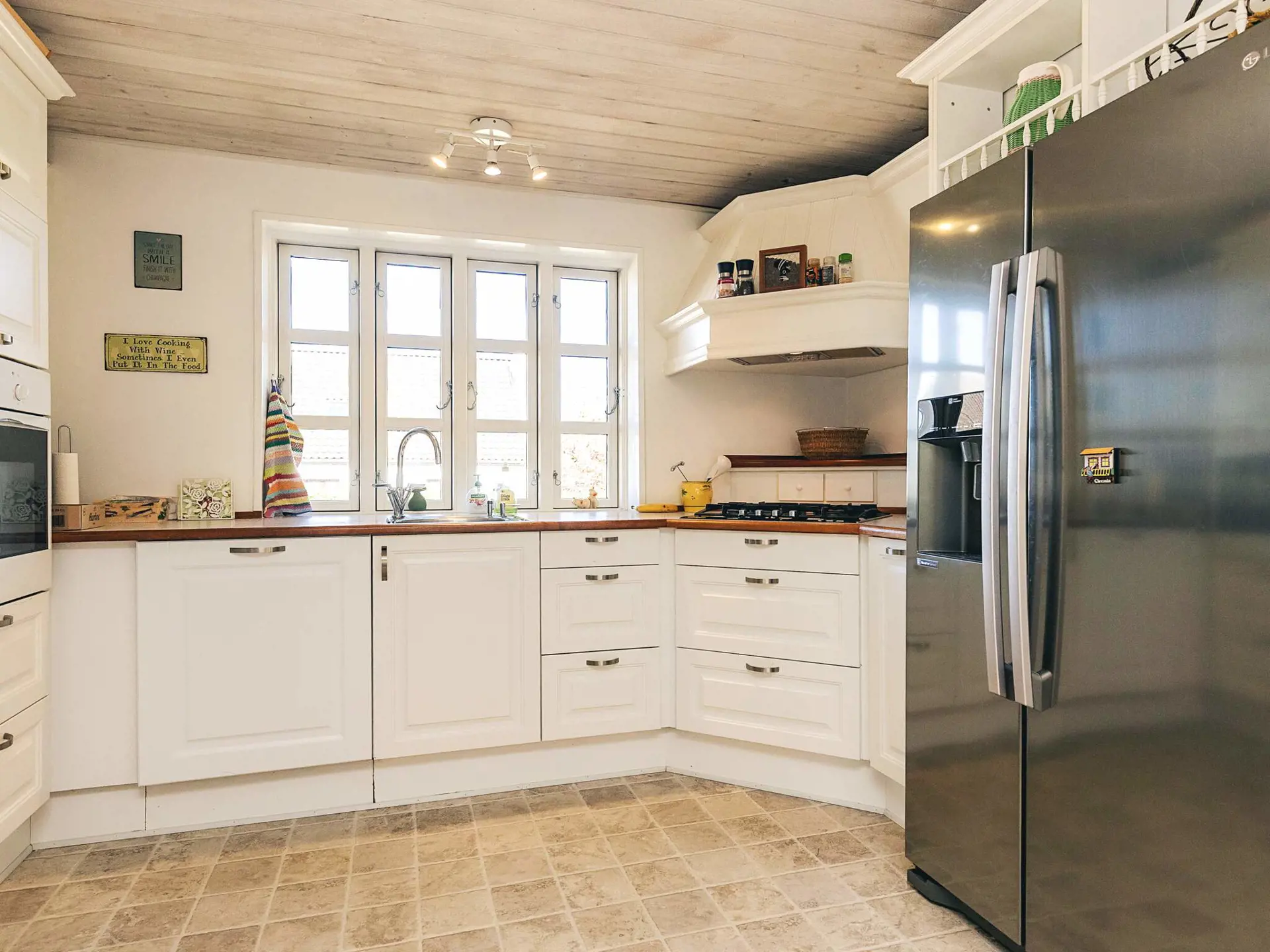 Ferienhaus in der Nähe der Stadt Øster Hurup und des Meeres. Im Erdgeschoss empfängt Sie eine Eingangsdiele mit Treppe in die erste Etage. Auf der rechten Seite betreten Sie den Anbau mit einem großen, schönen Badezimmer mit Dusche. Die helle Küche öffnet sich zu einem großzügigen Essbereich und einem gemütlichen Wohnzimmer mit Holzofen, von dem aus man direkten Zugang zum Garten hat.
