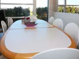 Innen helles Wohn- und Esszimmer mit Blick zum Wasser und in offener Verbindung mit der Küche sowie mit Zugang zu drei Terrassen, alle mit Meerblick, von denen eine teilweise überdacht ist. Fernseher ohne Sender, nur zum Streamen eigener Anbieter. Es gibt zwei gute Schlafzimmer mit je einem Doppelbett und ein 3. Zimmer mit einem Etagenbett mit Kojen. Badezimmer mit Whirlpool und Sauna.