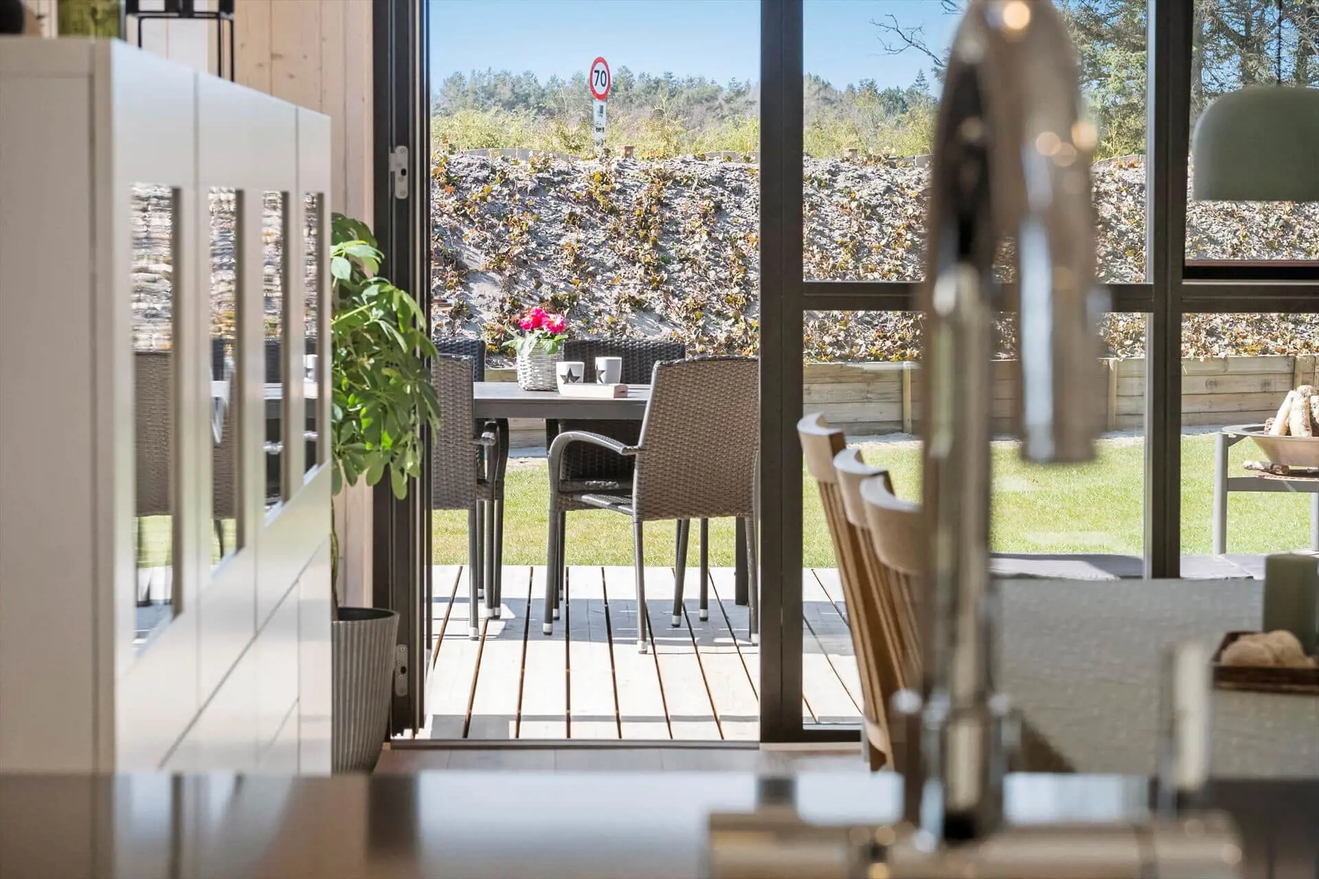 Das Ferienhaus ruht auf einem 914 m² großen Grundstück, das Ihnen ebenfalls schöne Möglichkeiten zum Erholen und Entspannen bietet. Die Grundstückseinfahrt ist mit Schotter und einem Carport versehen. Der Rest des Gartens ist umzäunt - ein Umstand, den sicherlich insbesondere Eltern von abenteuerlustigen Kleinkindern und Hundebesitzer sehr zu schätzen wissen werden. Alle Urlaubsgäste erfreuen sich garantiert an der großen, sonnenverwöhnten und in mehrere gemütliche Abteilungen unterteilten Terrasse - auf der unter anderem ein überdachter Loungebereich zu traumhaft schönen und geselligen Momenten im Kreise Ihrer Lieben einlädt.