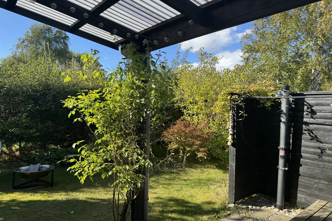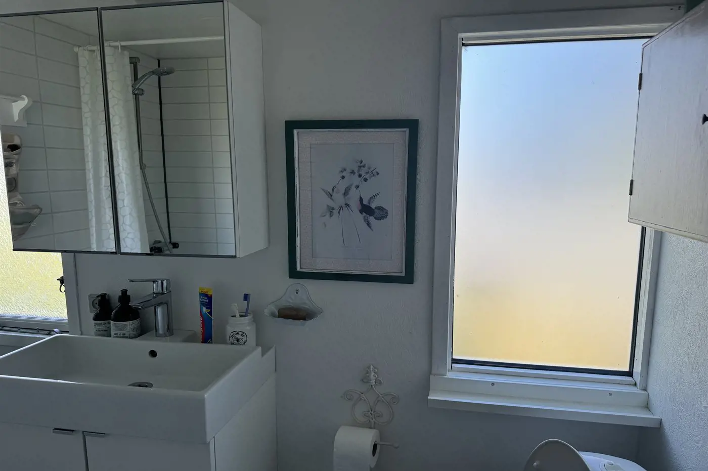 Die Ferienunterkunft liegt auf einem 580 m² großen Gartengrundstück. Das Grundstück ist eingezäunt. Die Entfernung zum Meer beträgt 640 m. Die Entfernung zum Fjord beträgt 12800 m. Die nächste Einkaufsmöglichkeit liegt 1820 m entfernt. In einem Abstand von 16900 m gibt es einen Golfplatz. Es steht ein offenes Terrassenareal zur Verfügung. Außerdem gibt es überdachte Terrasse.Lagerfeuerstelle. Außendusche. Es steht ein Grill zur Verfügung. Parkplatz auf dem Grundstück.