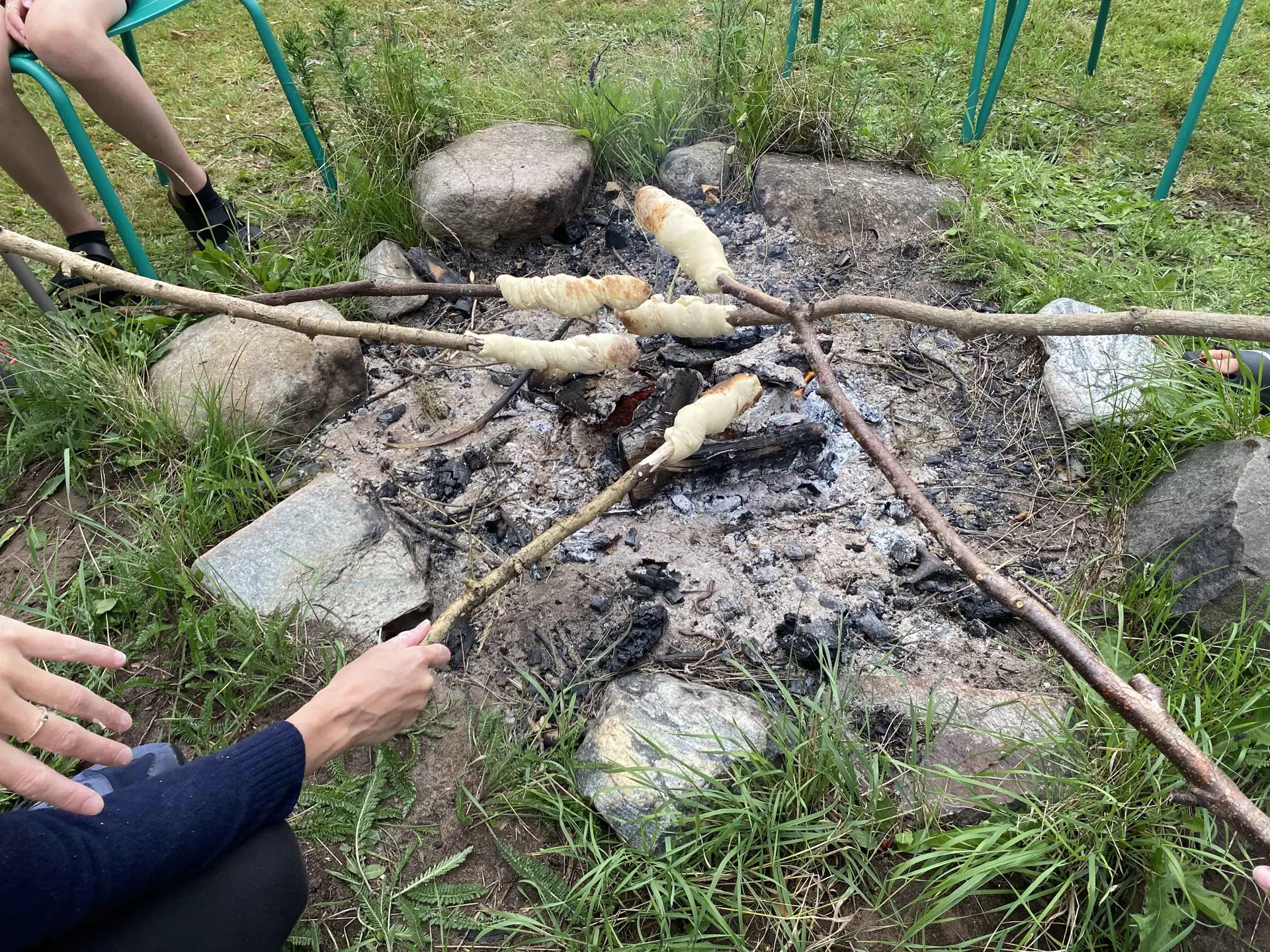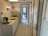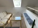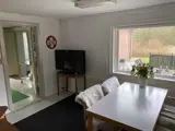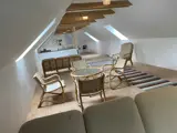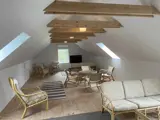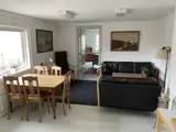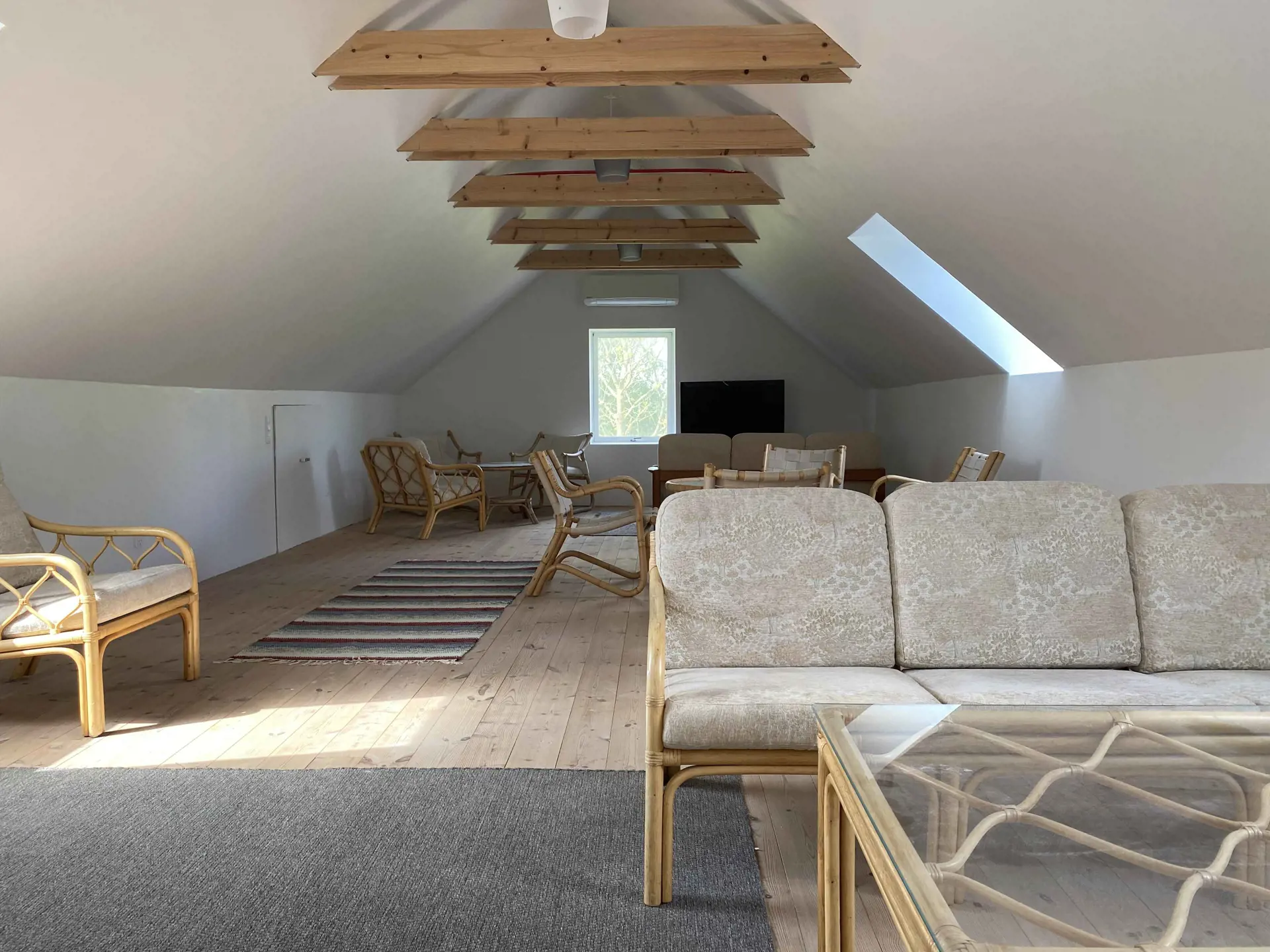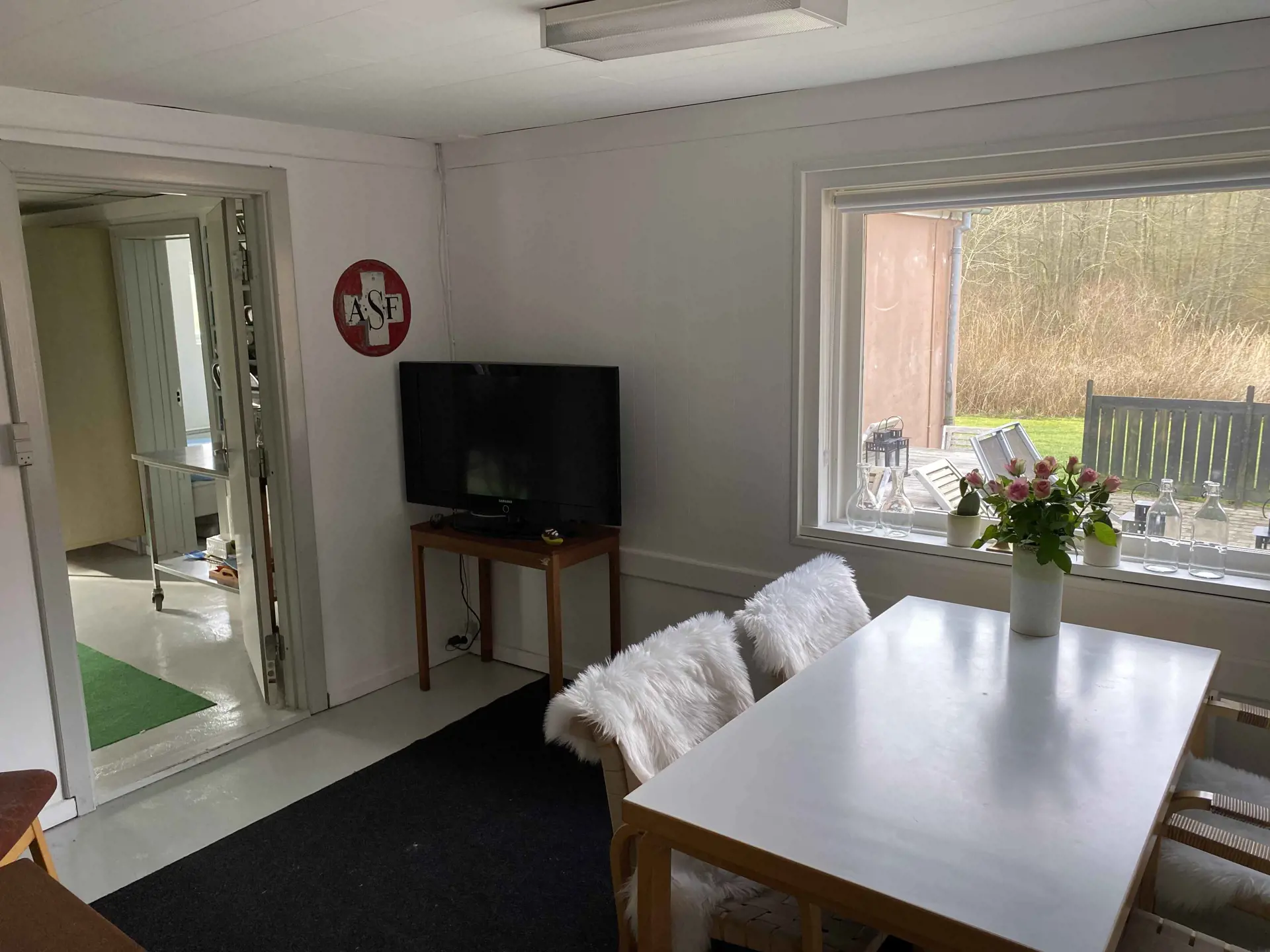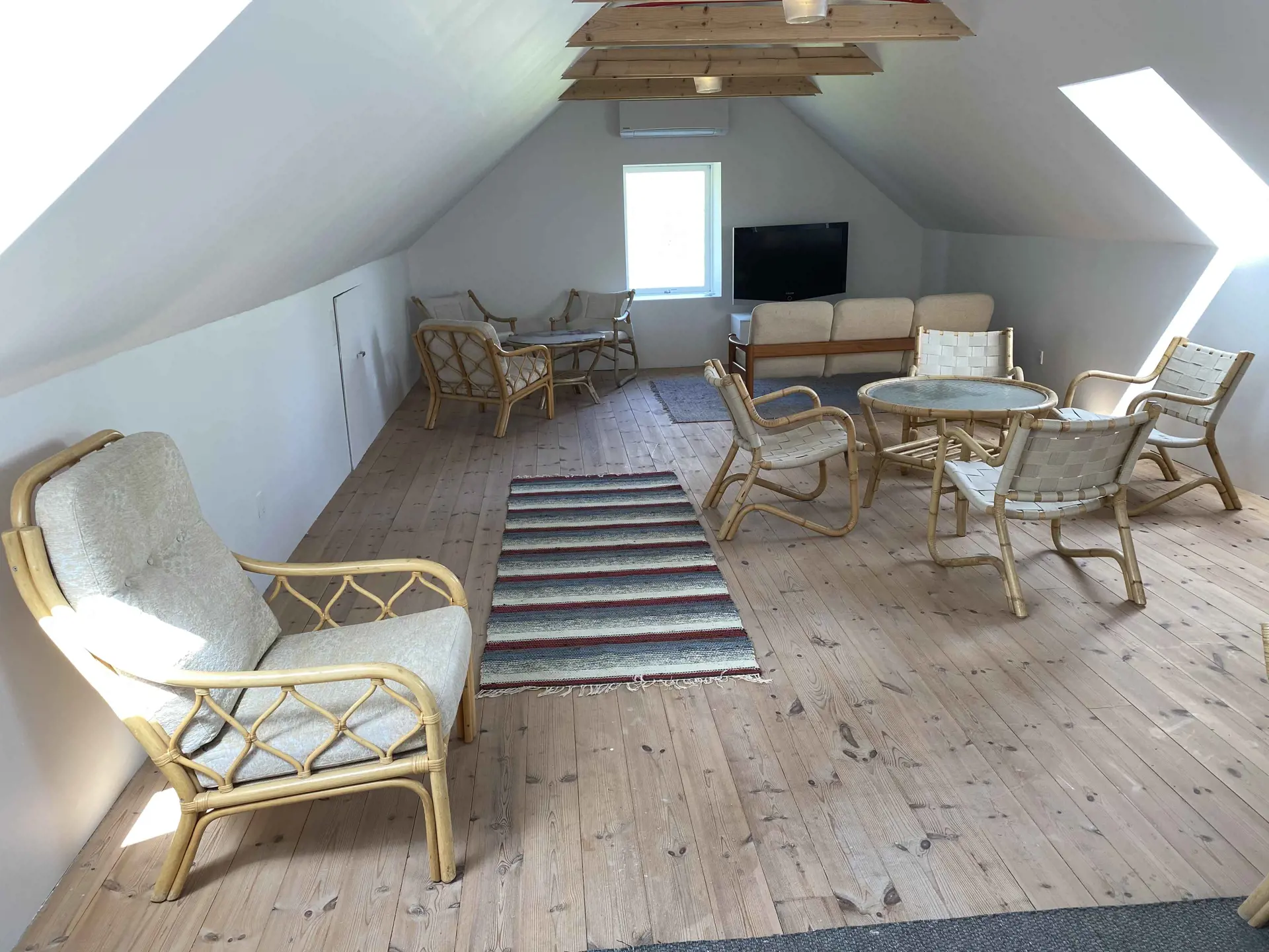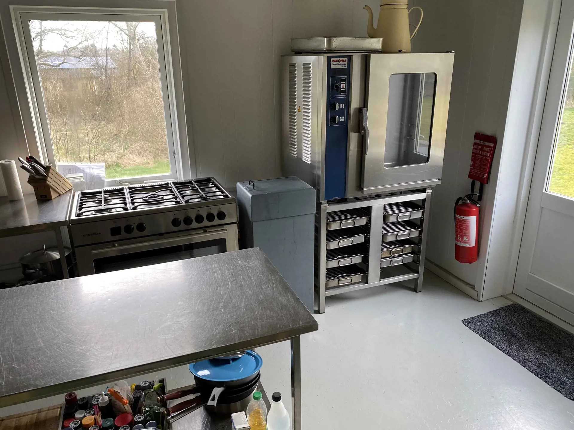 Küche mit 30 Sitzplätzen (mit Luft-Luft-Wärmepumpe). Wohnzimmer im Erdgeschoss mit weiteren 8–10 Sitzplätzen, Sofaecken und TV. Die Küche ist für die Verpflegung großer Gruppen ausgelegt und verfügt über Gasherd, Industrieofen und Geschirrspüler. Offene Verbindung zwischen Küche und Essbereich. Hochstuhl vorhanden.