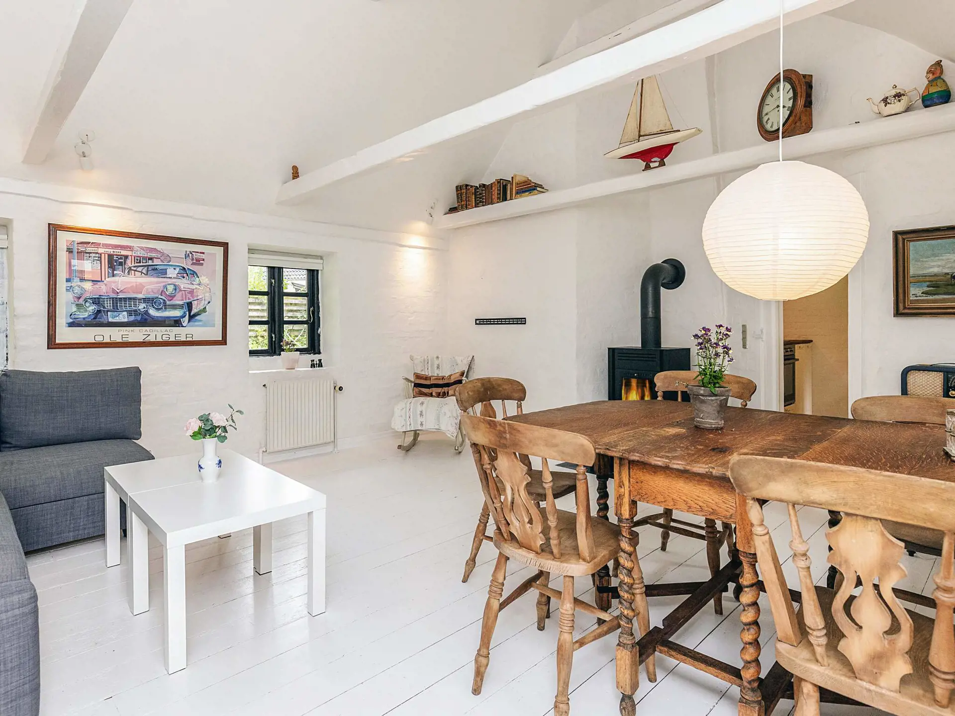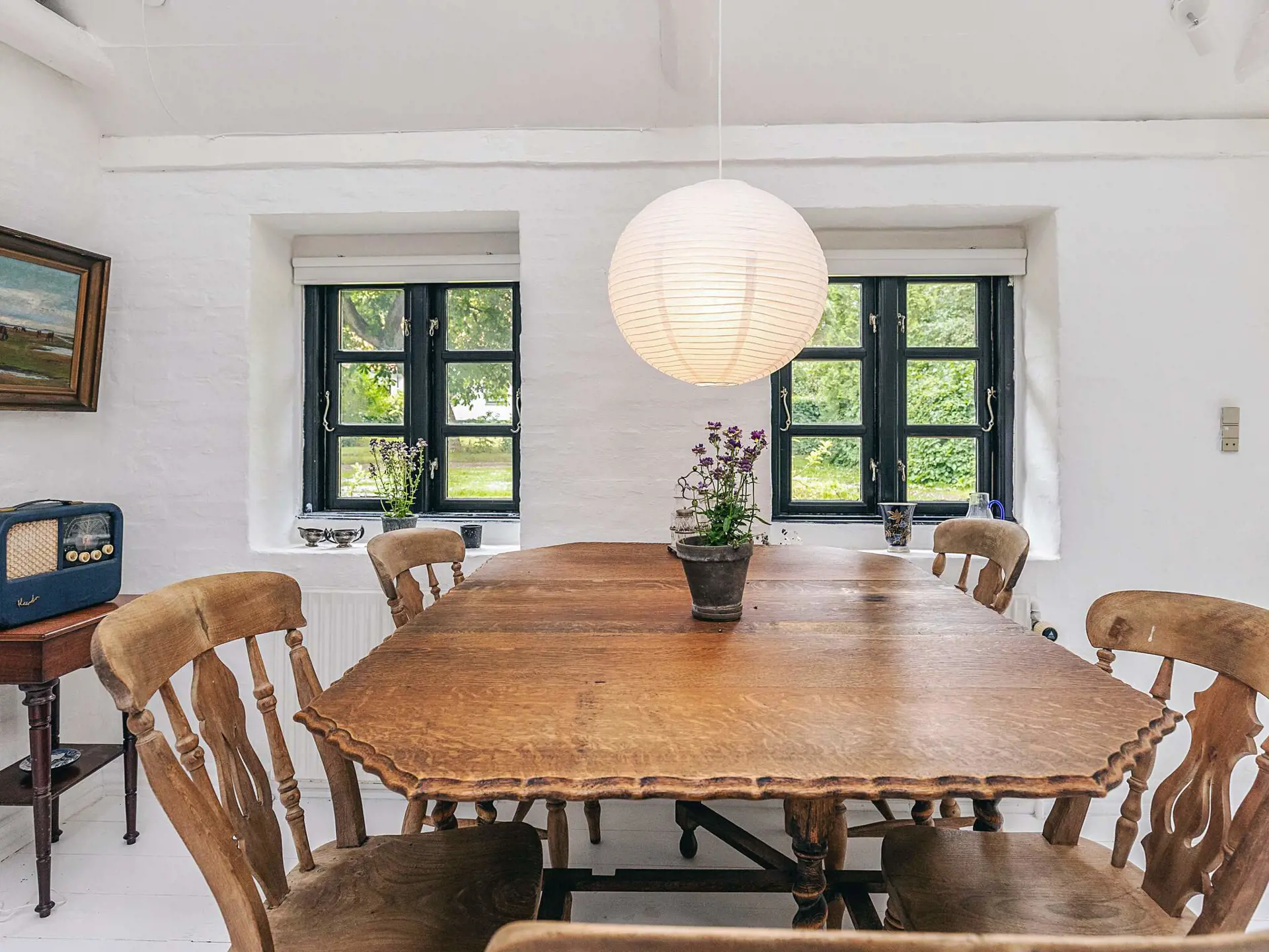 Gemütliches und charmantes kleines Fachwerkhaus in ruhiger Umgebung in Mou. Das Haus ist offen bis zum First und daher hell und luftig, mit Ausnahme der Küche, wo die Deckenhöhe 2 Meter beträgt. Das Wohnzimmer verfügt über ein Schlafsofa und einen Essbereich und ist zur Küche hin offen. Schlafzimmer mit Doppelbett und helles Badezimmer. Das Haus ist gut isoliert und verfügt über eine günstige Fernwärme. Es gibt einen Schuppen mit Gefrierschrank, Waschmaschine und Trockner. Gemütliches Grundstück mit Terrasse und Garten zum Entspannen.