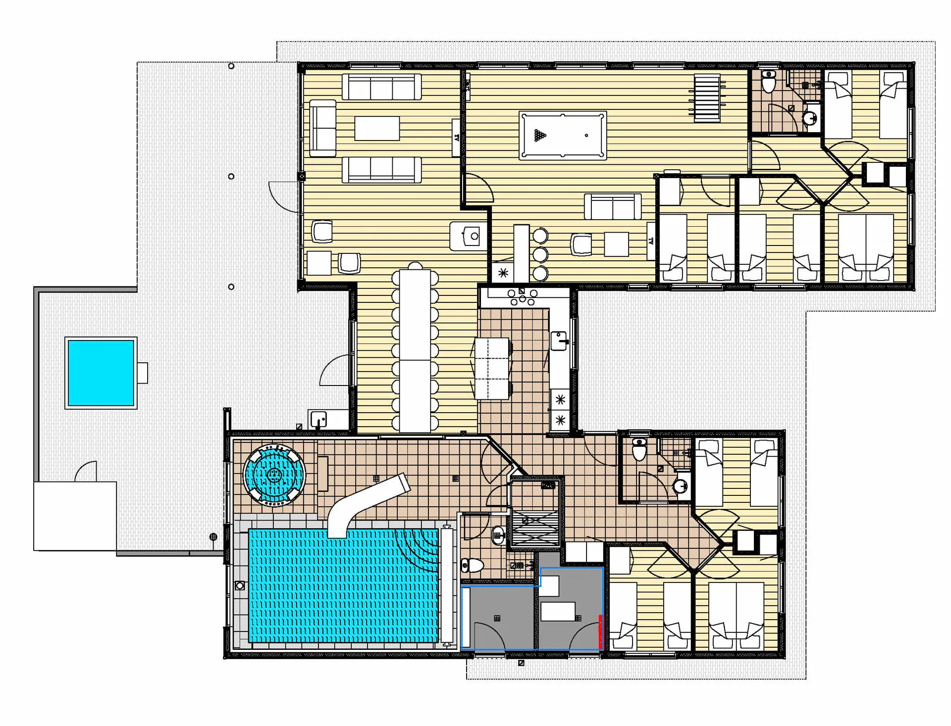 Dieses luxuriöse Ferienhaus in Mommark auf Alsen bietet Platz für 18 Gäste und eine Vielzahl von Aktivitäten. Die Lage ist ideal für Spaziergänge in der Natur oder Besuche der Mommark Marina. Das Haus ist nur einen kurzen Weg vom Badestrand entfernt und bietet sowohl Innen- als auch Außenwhirlpools und Saunen. Für Wassersportler gibt es ein 18 m2 großes Hallenbad mit römischer Treppe, Gegenstromanlage und Wasserrutsche. Ein Aktivitätsraum mit Billard, Tischtennis, Tischfußball, Dart und PlayStation 4 sorgt für Unterhaltung. Eine Bar mit Kühlschrank lädt zum Entspannen ein. Der zentrale Wohn-/Essbereich bietet eine gemütliche Sitzecke, einen Fernseher, einen Holzofen und Blick auf die Terrasse. Die XL-Küche ist mit zwei Geschirrspülern, zwei Herden/Backöfen und viel Kühl-/Gefrierraum ausgestattet. Bei gutem Wetter kann in der Außenküche gekocht werden. Das Haus verfügt über sieben Doppelzimmer in zwei Schlafbereichen, jeweils mit eigenem Badezimmer. Ein weiteres Badezimmer befindet sich im Poolraum. Der Dachboden bietet Platz für vier Personen und ist besonders bei Kindern beliebt. Für Elektroautos und E-Bikes gibt es einen Stecker Typ 2.