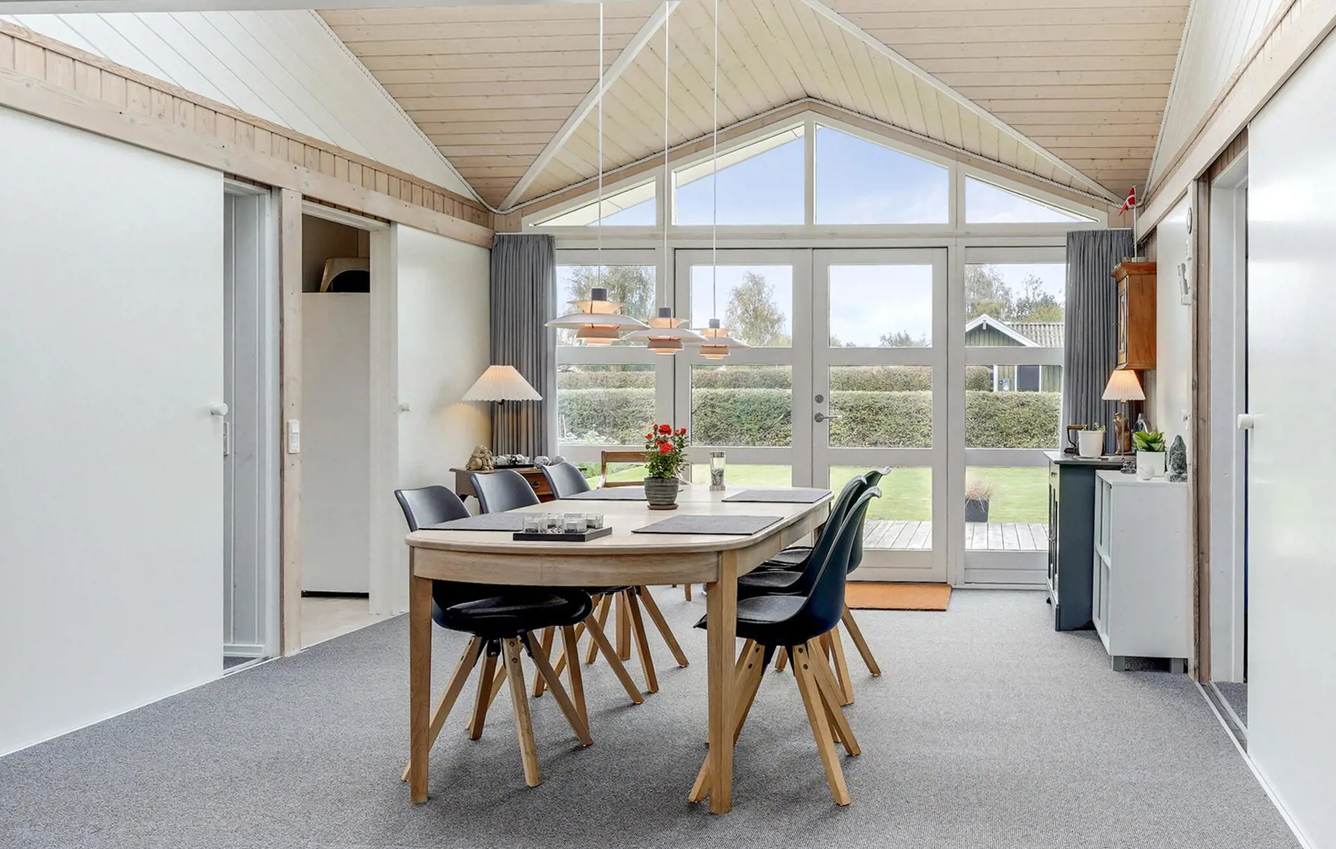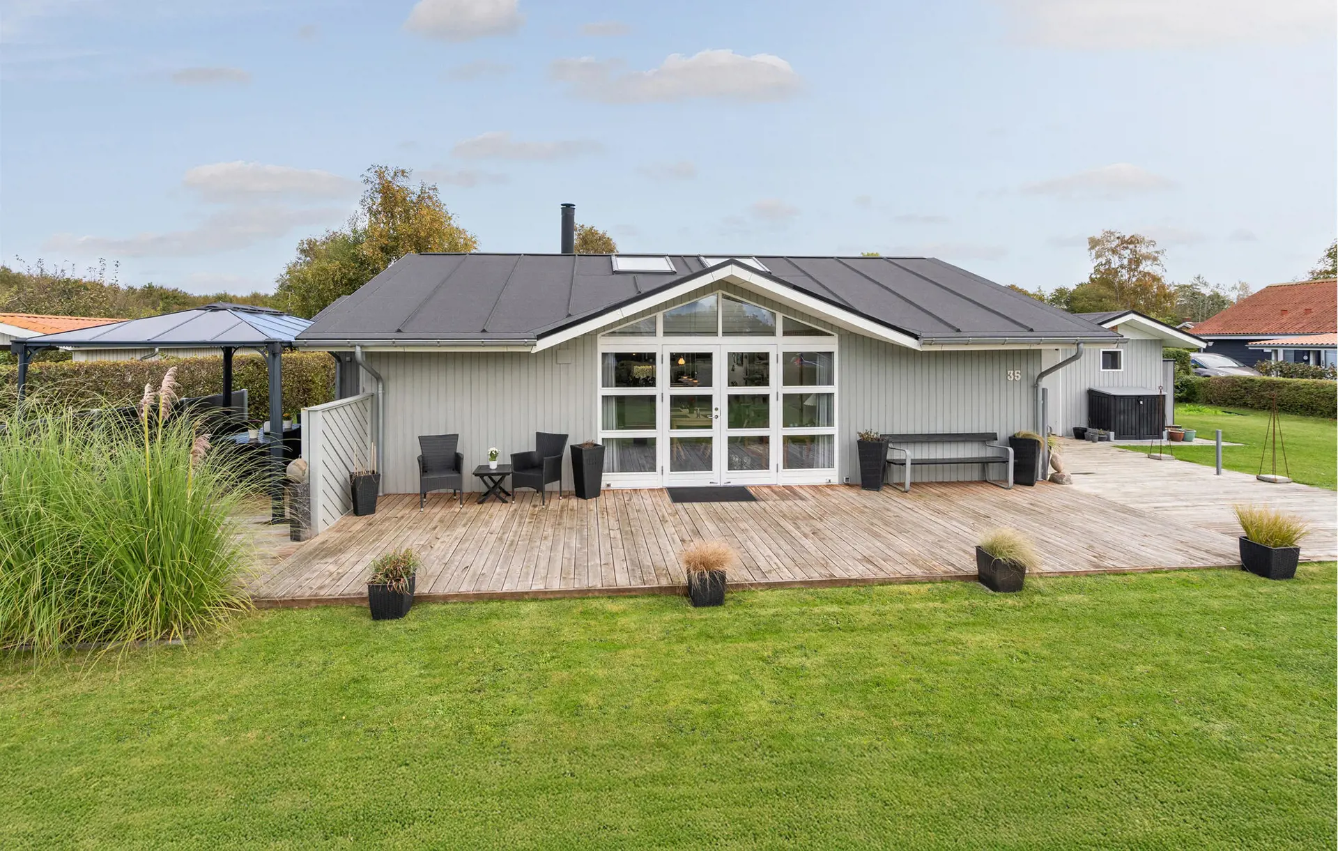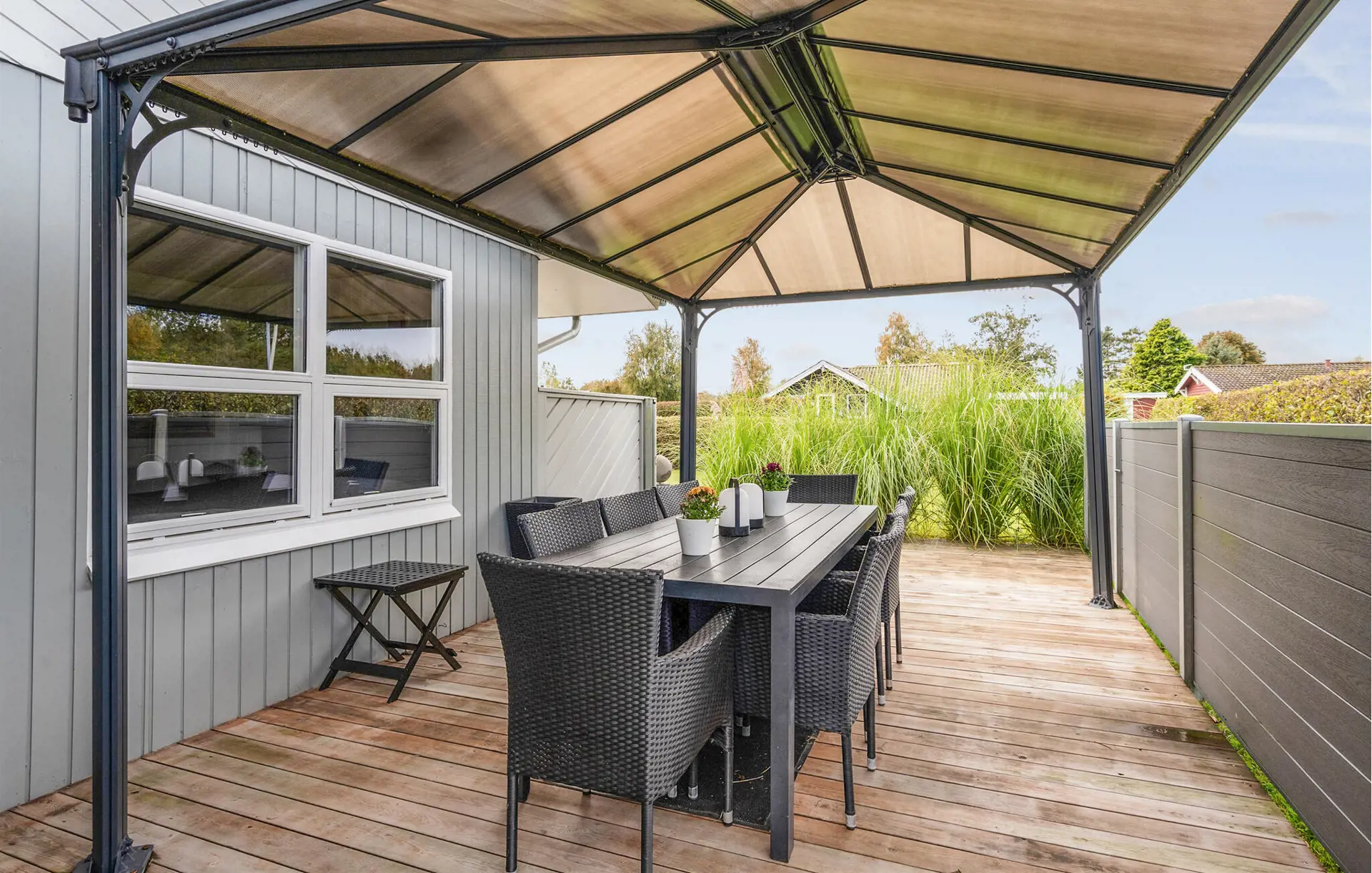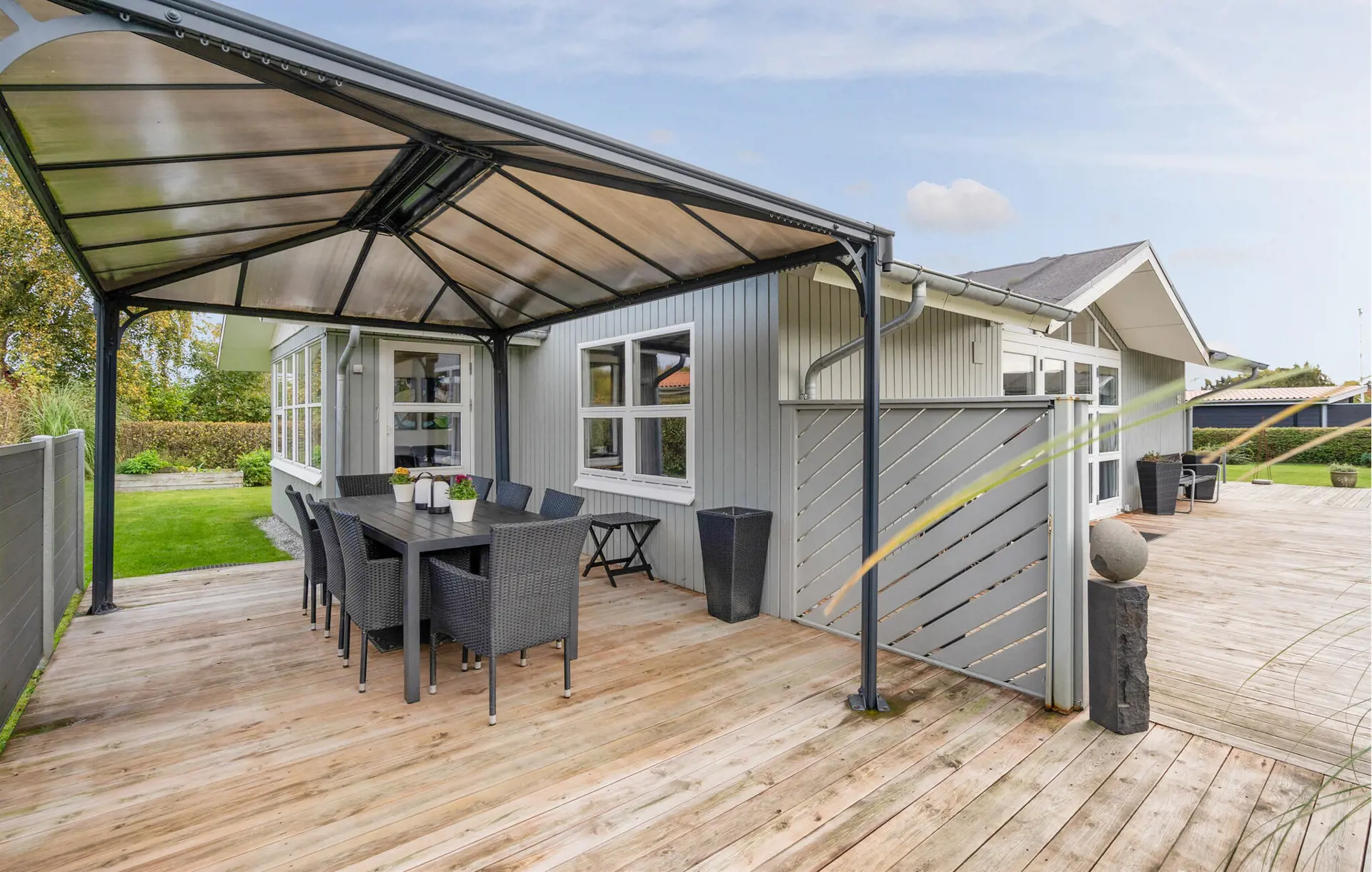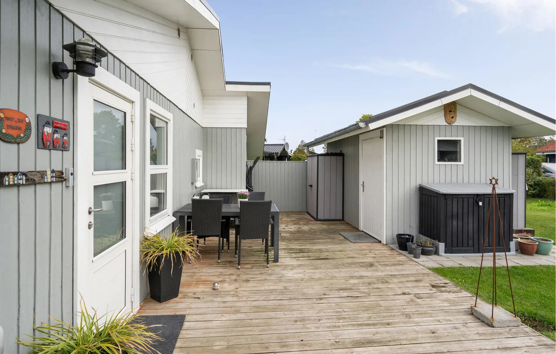 Gehen Sie hinaus auf die weitläufige Holzterrasse und genießen Sie die frische Luft. Nehmen Sie Ihre Mahlzeiten im überdachten Außenbereich ein oder entspannen Sie in der Sonne auf dem Rasen. Der liebevoll gepflegte Garten bietet Platz zum Spielen, Lesen oder Entspannen im Grünen.