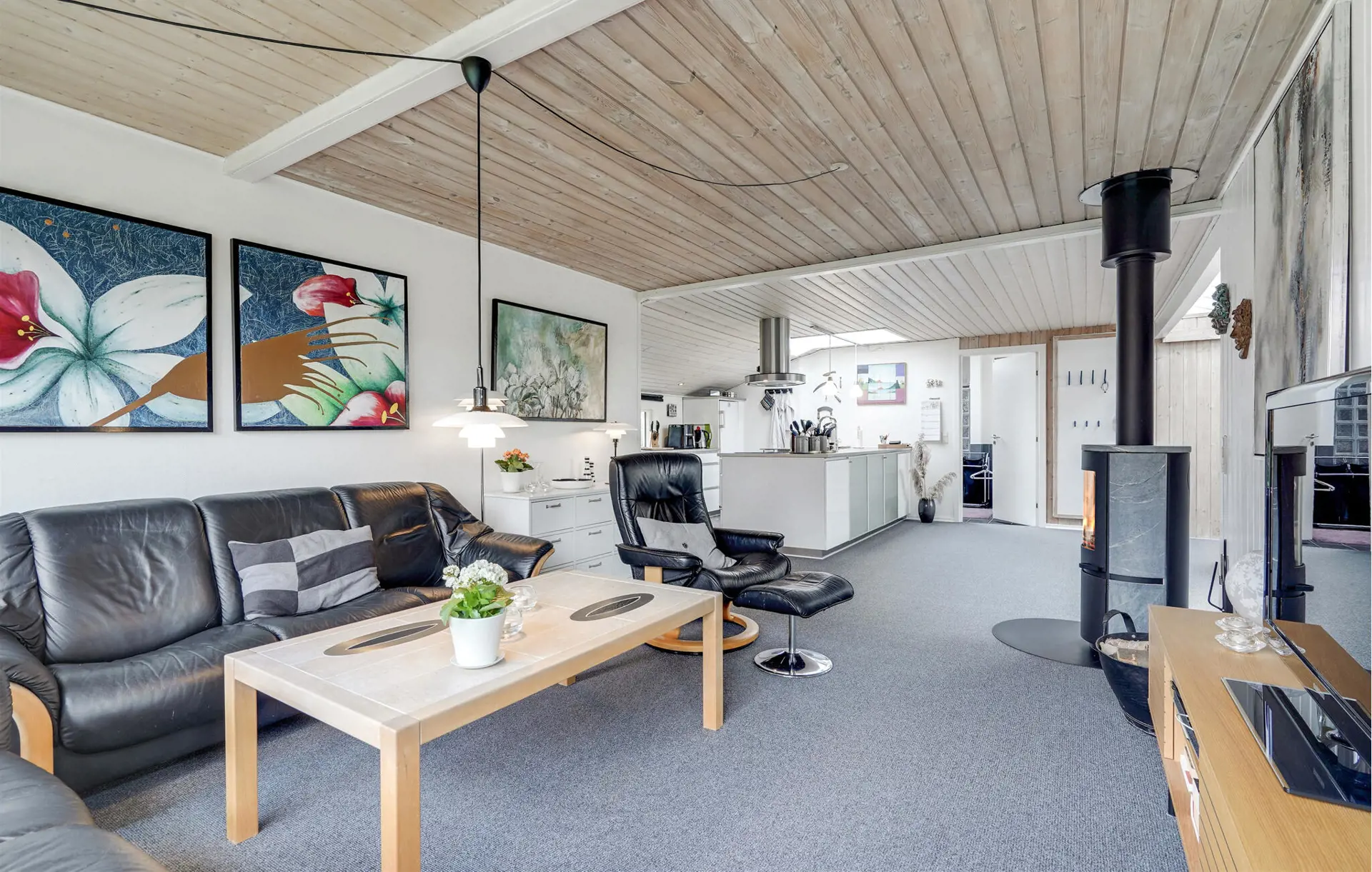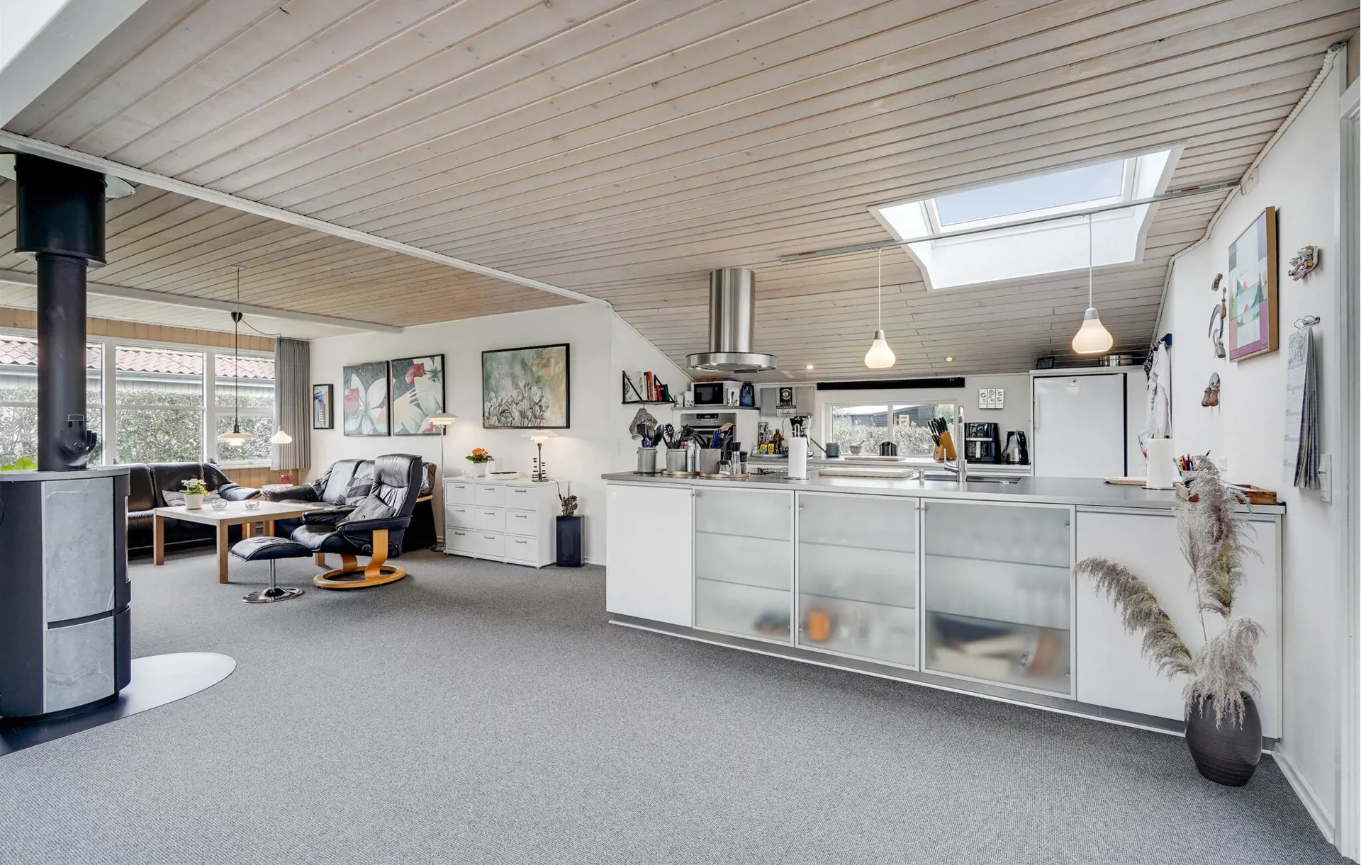 Ihr Ferienhaus besticht durch seine helle, offene Architektur, gepflegtes Design und eine ruhige Lage. Große Fensterfronten im Wohnbereich lassen viel Tageslicht herein und schaffen eine Verbindung zwischen Innenraum und Garten. Machen Sie es sich auf den Sofas gemütlich, während der Kaminofen angenehme Wärme verbreitet. Die Küche mit hochwertigen Geräten und eleganten Oberflächen lädt zum gemeinsamen Kochen ein. Genießen Sie Ihre Mahlzeiten am großen Esstisch mit Blick in den Garten und entspannen Sie danach in der Sauna.