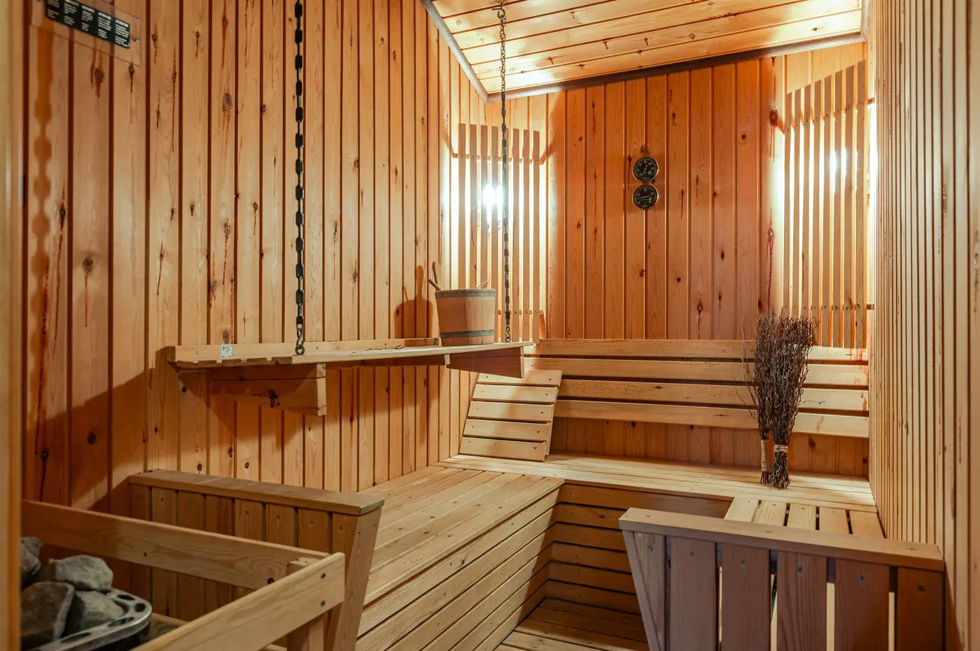 Es gibt 1 Badezimmer mit Dusche und 1 Toilette. Es steht eine Sauna zur Verfügung in der Sie sich so richtig entspannen können.