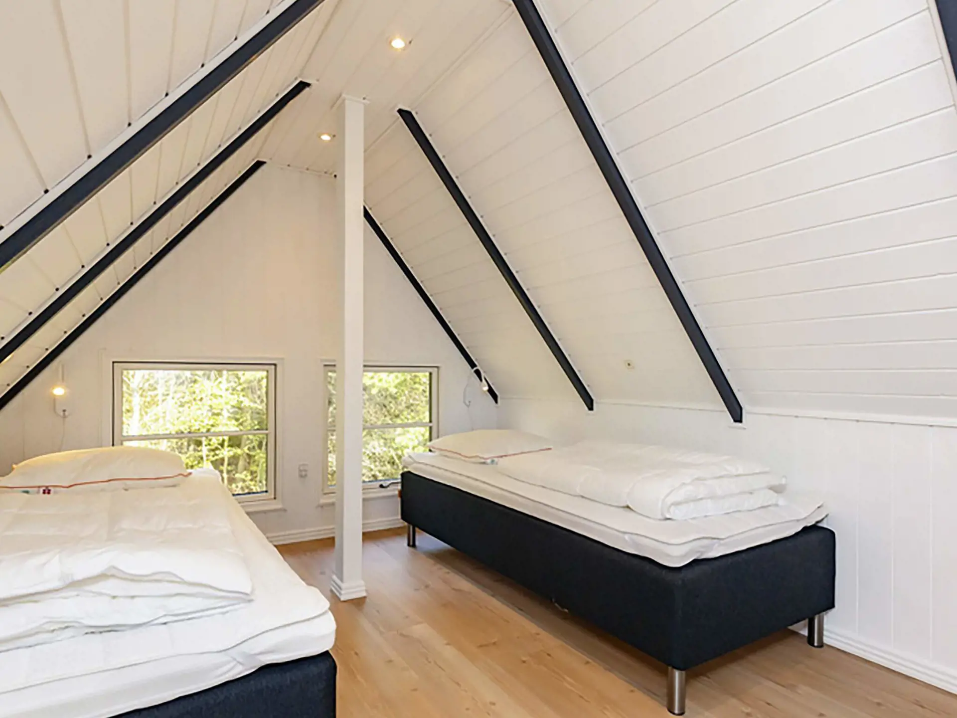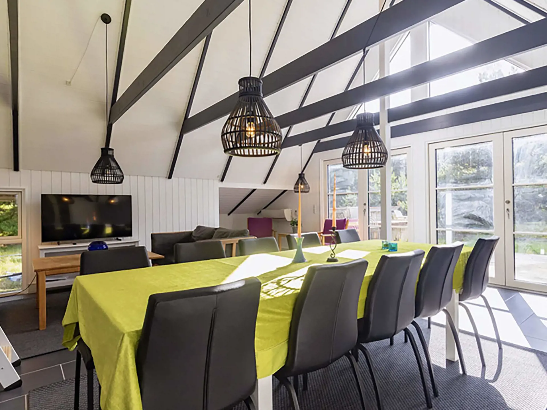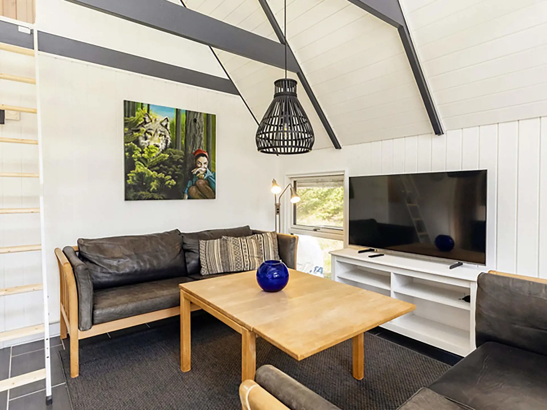 Im Wohnzimmer, mit offener Decke bis zum First und sichtbaren Balken, steht auch ein Holzofen für gemütliche Atmosphäre bereit. Das Wohnzimmer ist mit bequemem Mobiliar ausgestattet. Großes TV-Paket mit Viaplay. Von hier gelangt man hinaus auf eine gemütliche Terrasse. Im Haus zudem Hochstuhl und Kinderbett vorhanden.