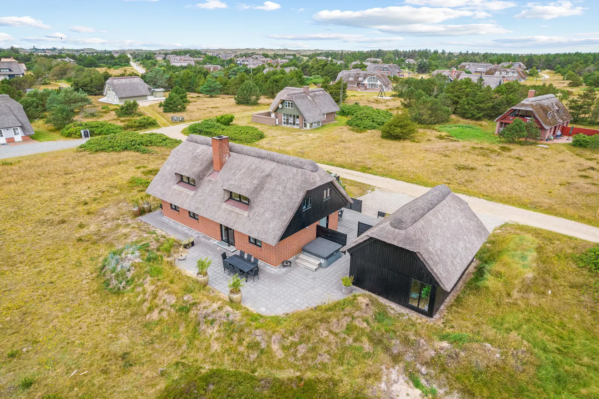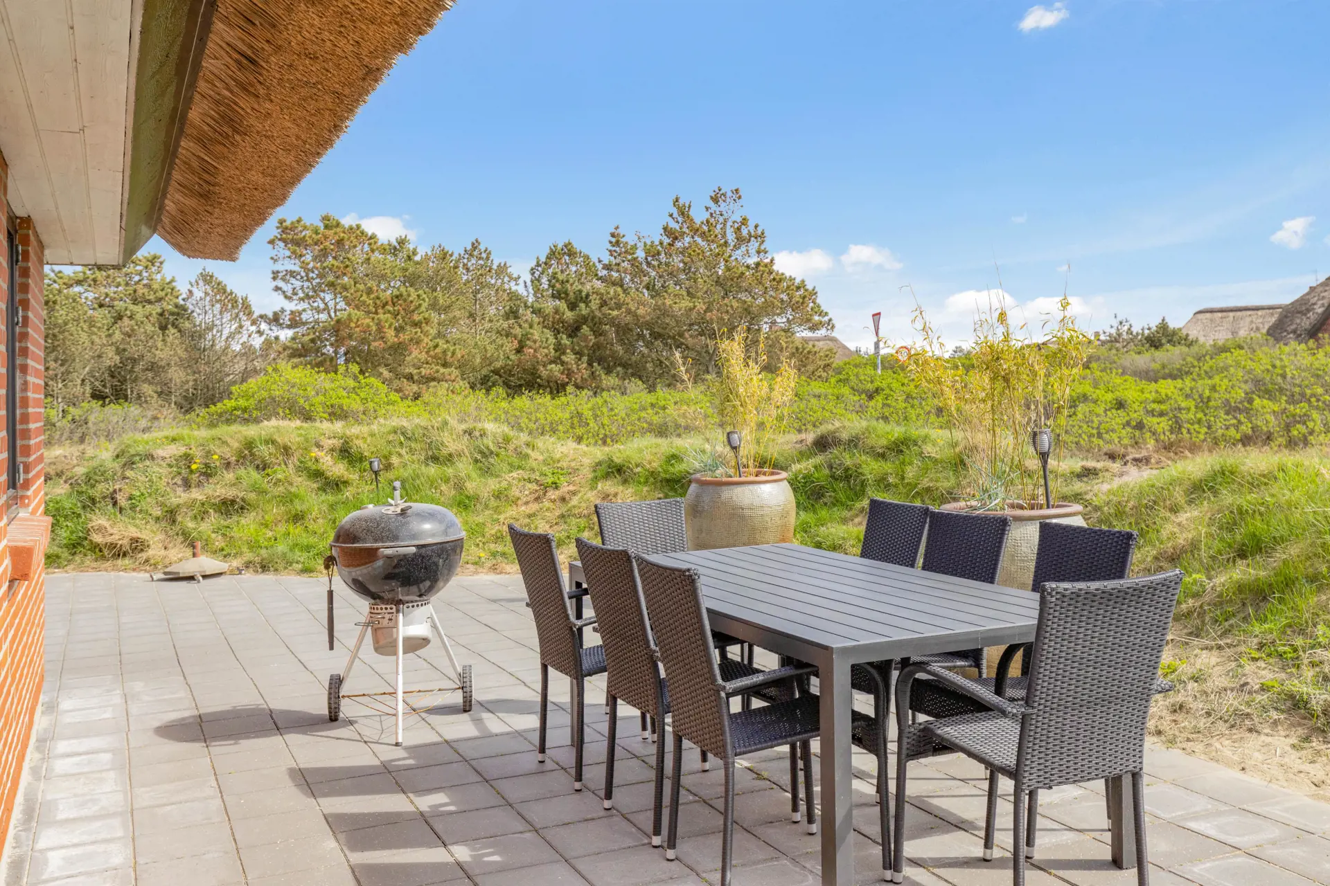 Das reetgedeckte Ferienhaus auf Ingridsvej 1, bietet auf zwei Etagen reichlich Platz für insgesamt 8 Personen. Die beiden Stockwerke sind durch eine Treppe innerhalb des Hauses miteinander verbunden. 2 Schlafzimmer, eine gemütliche Sitzecke mit tollem Ausblick sowie ein weiteres Badezimmer im Obergeschoss sind ideal, wenn ihr Freunde oder eure Teenager dabei habt, die auch einmal etwas für sich selbst sein wollen. Für Fussball begeisterte befindet sich in der 1. Etage ein Kickertisch, wo das ein oder andere Turnier gespielt werden kann, sowie in einem Nebengebäude einen Billardtisch.