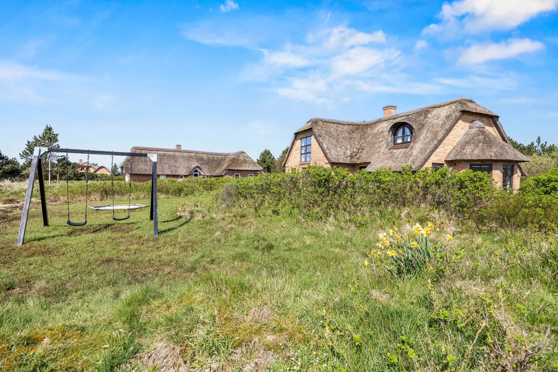 Die südlich ausgerichtete Sonnenterrasse, mit ihren bequemen Gartenmöbeln, ist der ideale Ort für eine Tasse Kaffee am Morgen oder ein Glas Wein am Abend. Sonnt euch auf den Liegestühlen oder lehnt euch mit eurem Lieblingsbuch zurück und genießt die frische Meeresluft. Eure Kinder können derweil schaukeln oder sich im Sandkasten austoben.