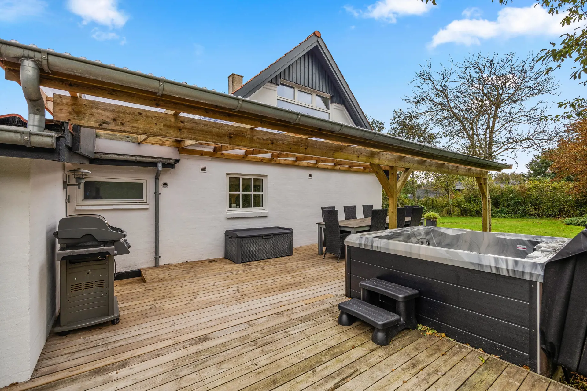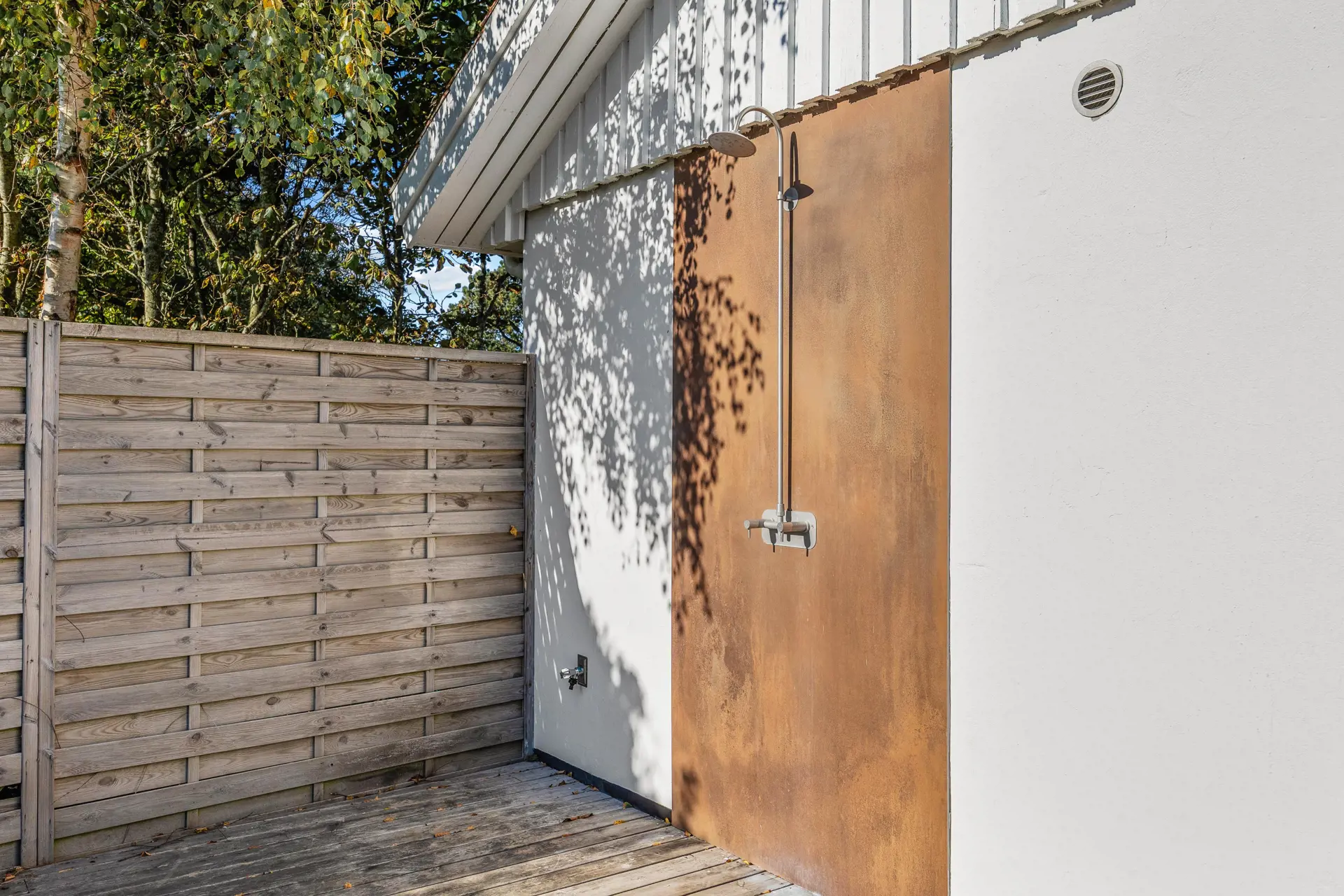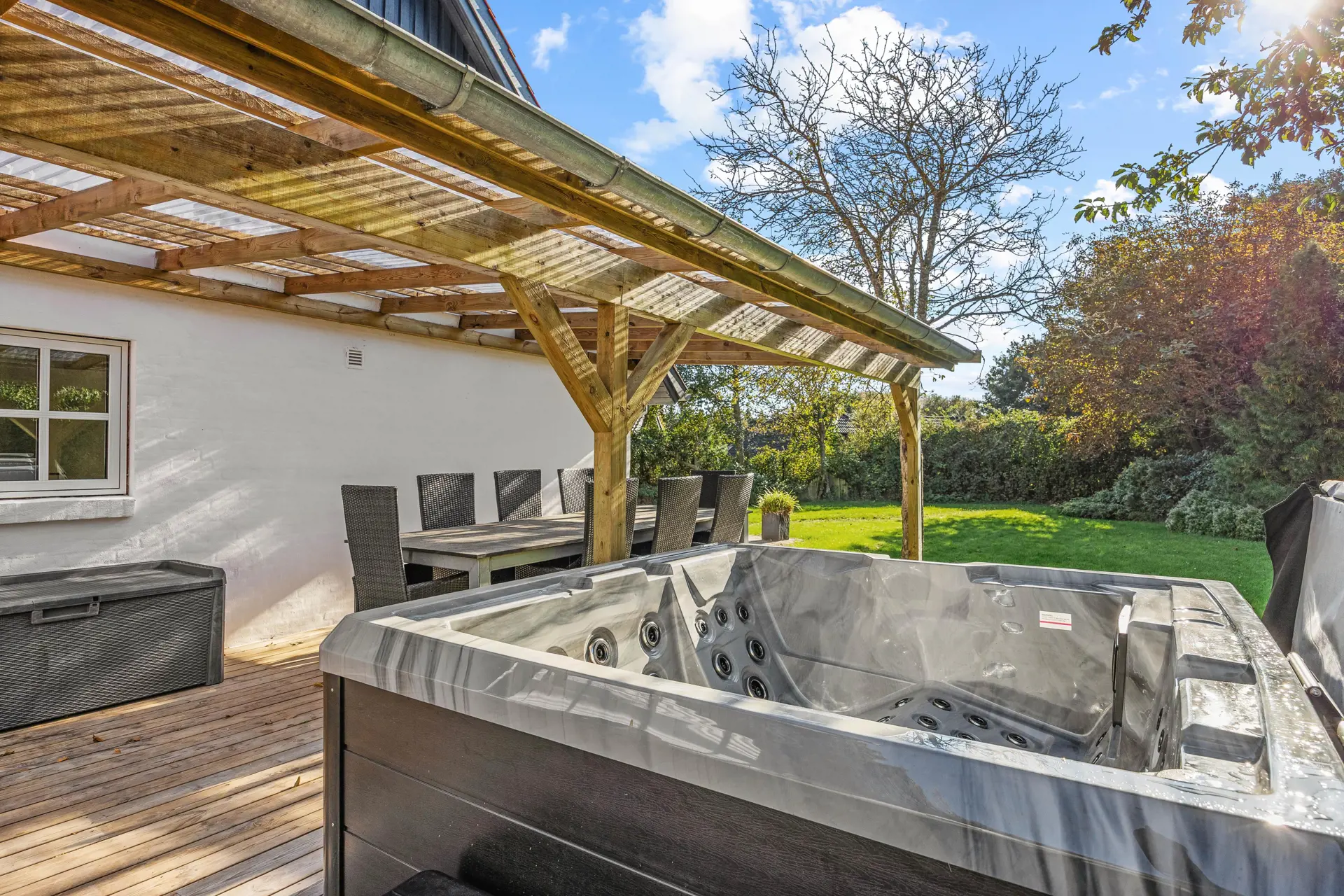 Unter dem überdachten Teil der Terrasse kannst du in den Gartenmöbeln sitzen und dich in das gute Buch vertiefen, das du schon so lange lesen wolltest, auch wenn es mal regnen sollte. Und wenn du Lust auf ein bisschen Wellness hast, kannst du in den Außenwhirlpool springen oder dich unter der Außendusche erfrischen.