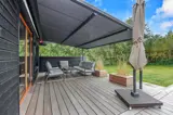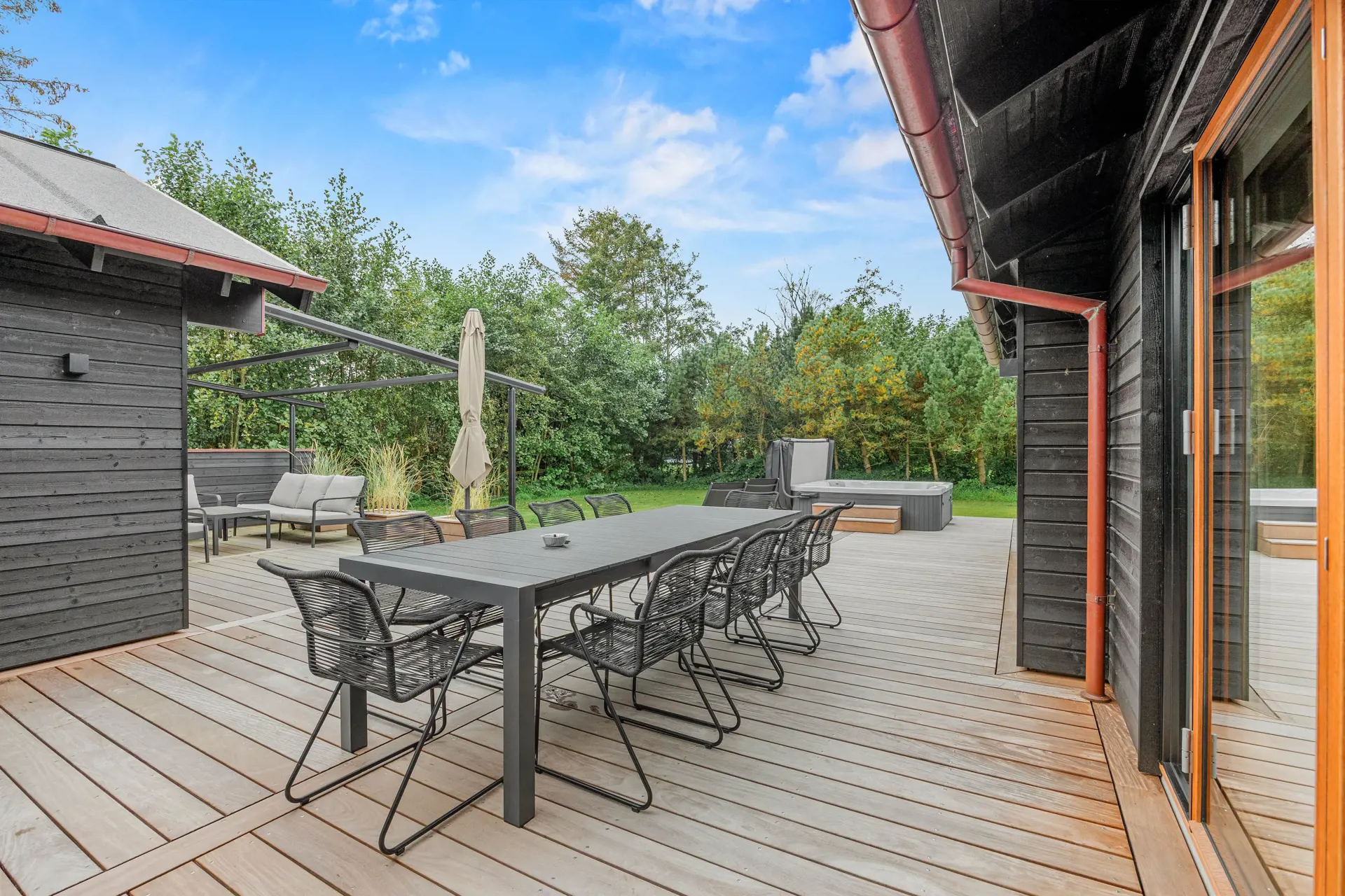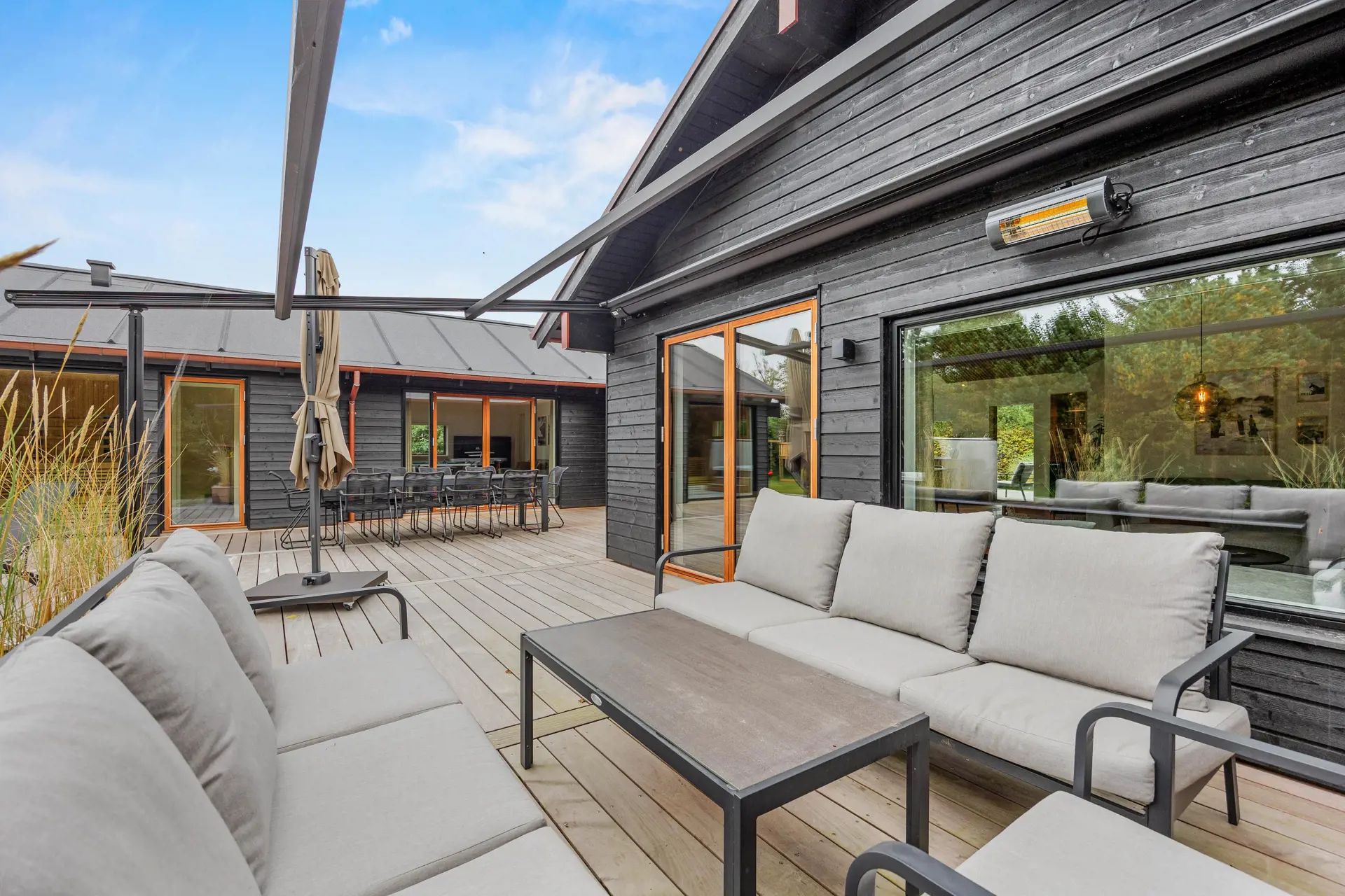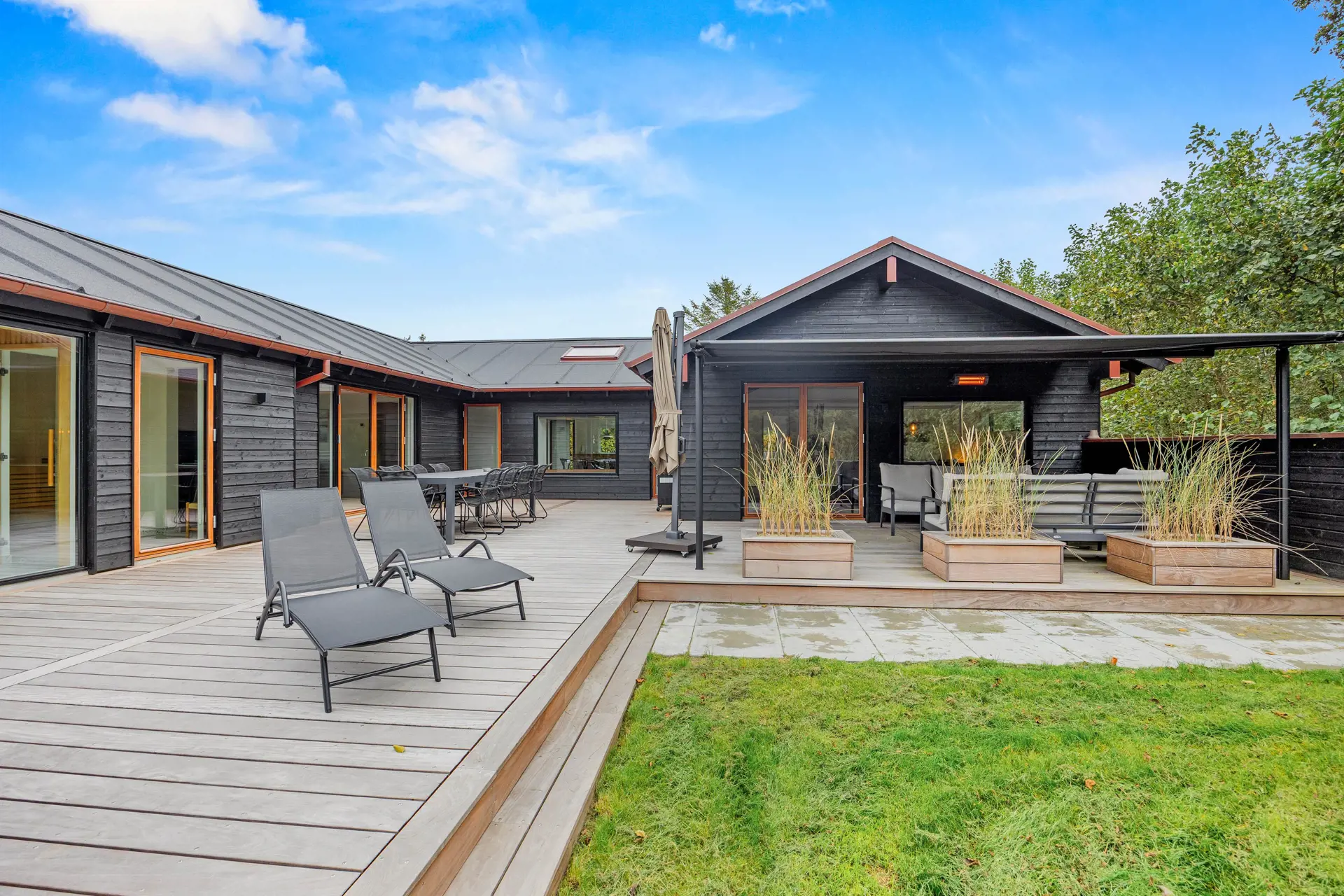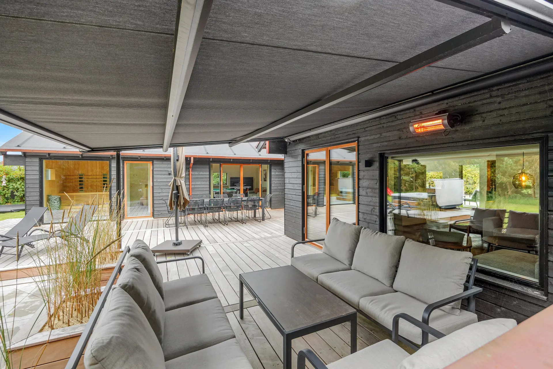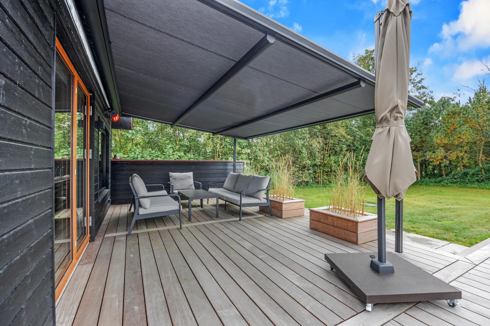 Die Terrasse ist mit einem Essbereich und einer großen Markisenpergola ausgestattet, die mittags Schatten spendet und an langen Sommerabenden Schutz vor der Sonne bietet.