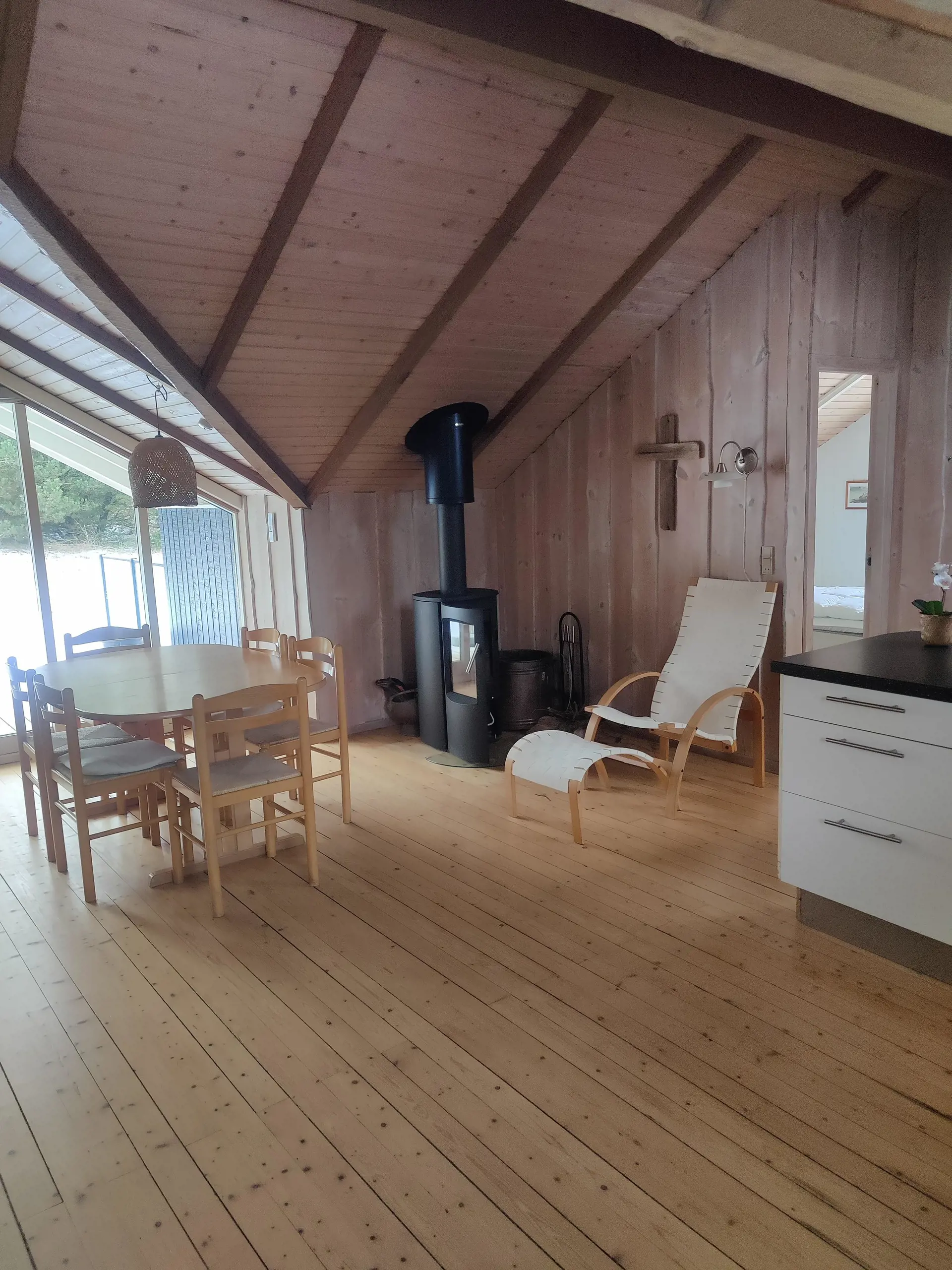 Das Ferienhaus verfügt auch über eine gut ausgestattete Küche mit Induktionsherd, Geschirrspüler und separatem Gefrierschrank (90 Liter), die das Kochen zum Kinderspiel macht. Leckere Gerichte versammeln die Familie um den Esstisch und anschließend könnt ihr den Abend mit gemütlichen Brettspielen genießen oder euch mit einem guten Film auf dem Sofa niederlassen. Hier gibt es auch eine energiesparende Wärmepumpe, die für ein angenehmes Raumklima sorgt – und an kühleren Tagen könnt ihr den stimmungsvollen Kaminofen anzünden.
