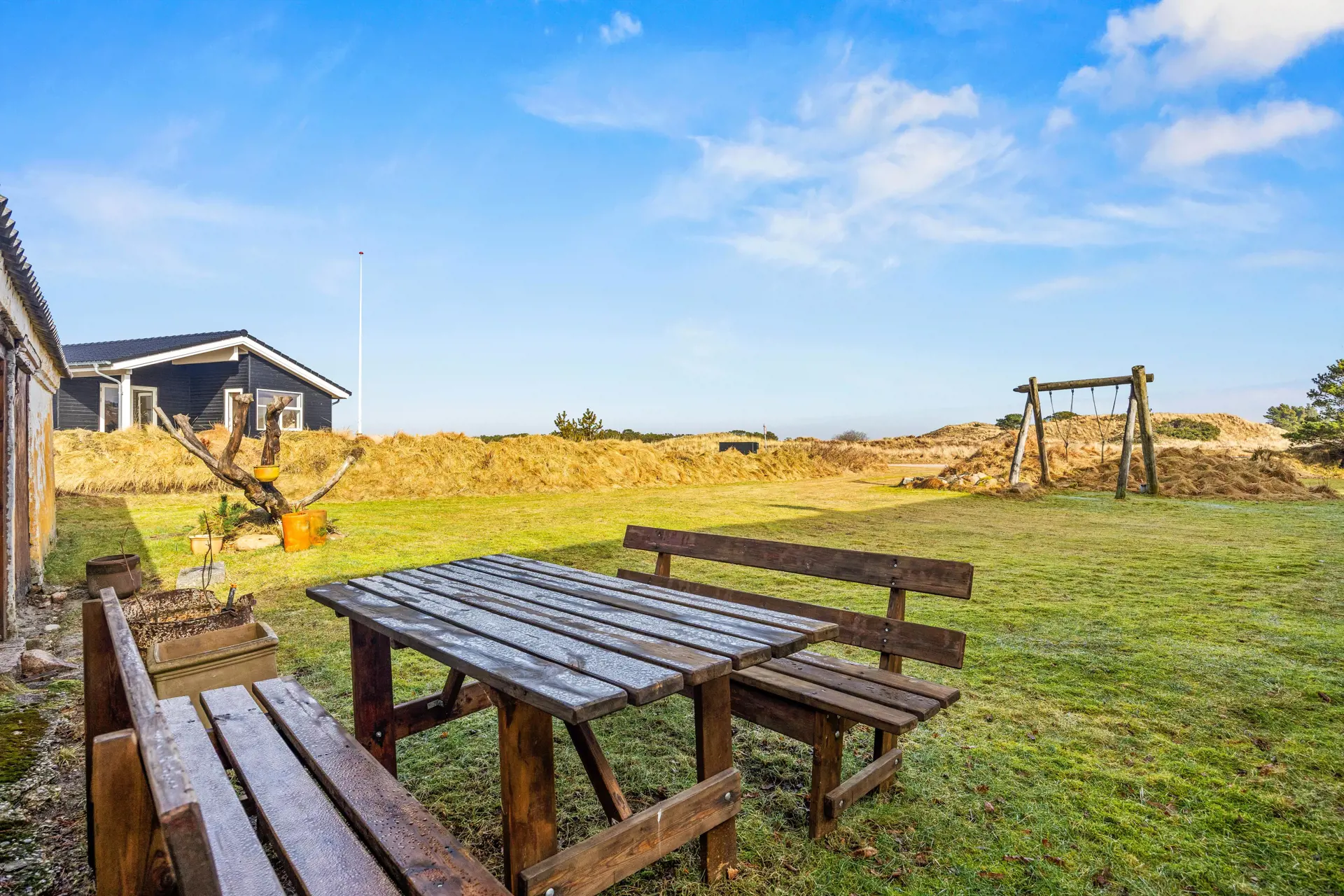 Zum Strand sind es rund 2230 Meter, ideal für Ausflüge ans Wasser, Muschelsuchen oder lange Spaziergänge. Wenn ihr ein Ferienhaus in Blåvand sucht, das mit viel Platz, Brennofen und einem großen Naturgrundstück überzeugt, ist dieses Zuhause auf Zeit wie gemacht für euch.