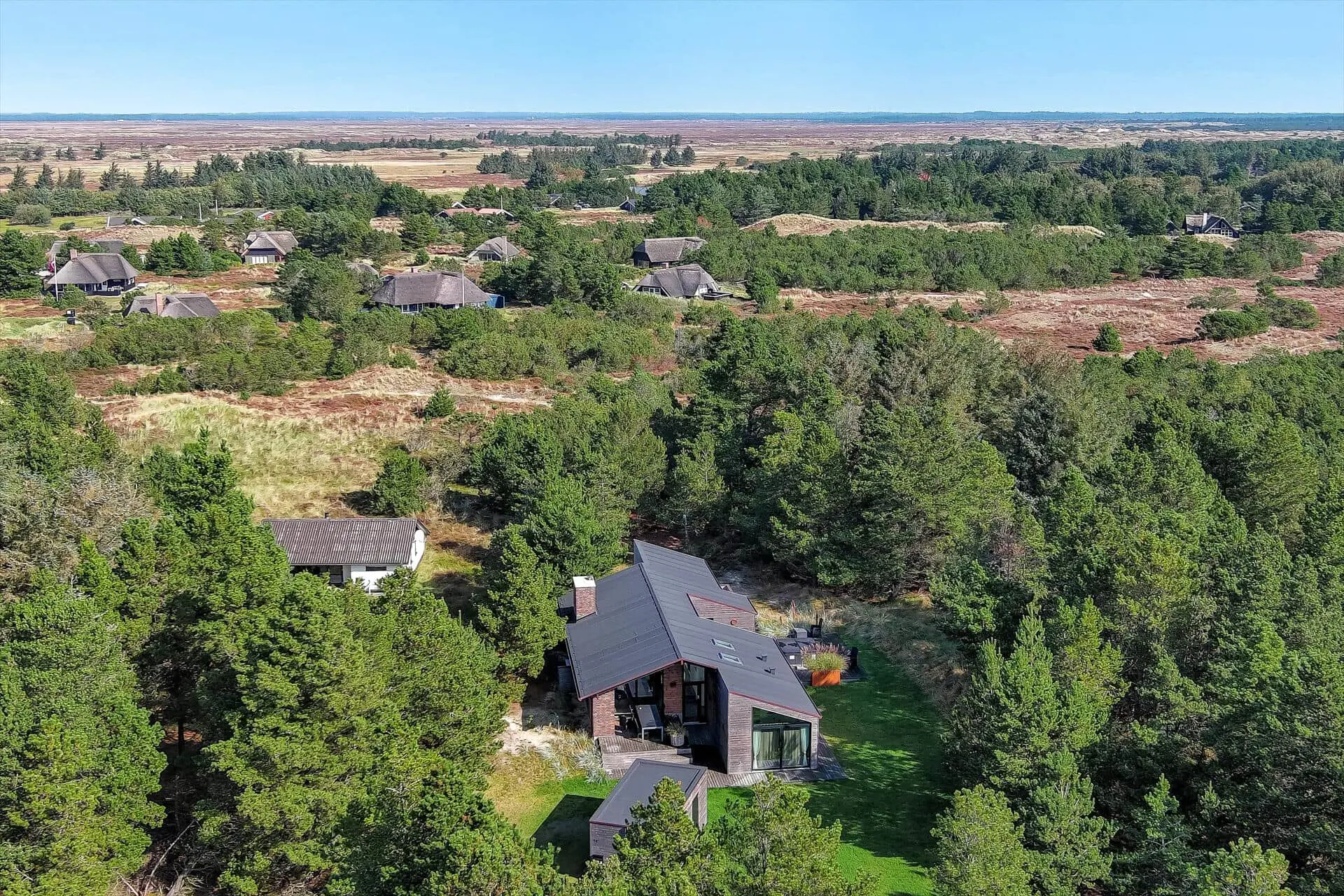 Die 150 m² große Wohnfläche des Hauses ist perfekt auf eine Belegung mit acht Personen zugeschnitten. Das Ferienhaus im Sandvej 14 wurde im Jahr 2022 erbaut und begeistert mit seinen hellen, breiten Dielenböden, den hohen Decken, den großen Fensterpartien und dem geschmackvoll aufeinander abgestimmten Interieur. Vier ansprechende Schlafzimmer und zwei ebenso schöne Badezimmer verteilen sich auf zwei Schlafbereiche. Das Urlaubsdomizil eignet sich daher sehr gut für zwei befreundete Familien. Ein praktischer Hauswirtschafts- und Abstellraum mit einer Waschsäule ist vorhanden. Das Herzstück des Hauses bildet der zentral platzierte Aufenthaltsbereich, der die tolle Küche und dem Wohnraum offen in sich vereint. In der Polstersitzgarnitur werden Sie mit einem großen Flachbild-TV und einem eingebauten Kaminofen verwöhnt. Nah am Esstisch steht eine gemütliche Bank, die in eine Fensternische eingebaut ist, zur Verfügung. Auf dieser können Sie in Ruhe lesen und den sich beim Ausblick auf den Bewuchs des Grundstücks entspannen.