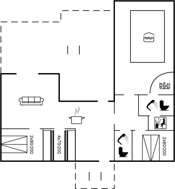 Der unbestrittene Mittelpunkt des Hauses ist der Poolbereich mit dem 18?m² großen Swimmingpool. Vom großen Wohnbereich – einer Kombination aus Küche und Wohnzimmer – hast du Zugang zu zwei Terrassen, auf denen du den ganzen Tag die Sonne genießen kannst.
